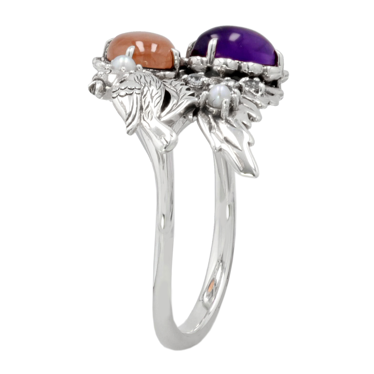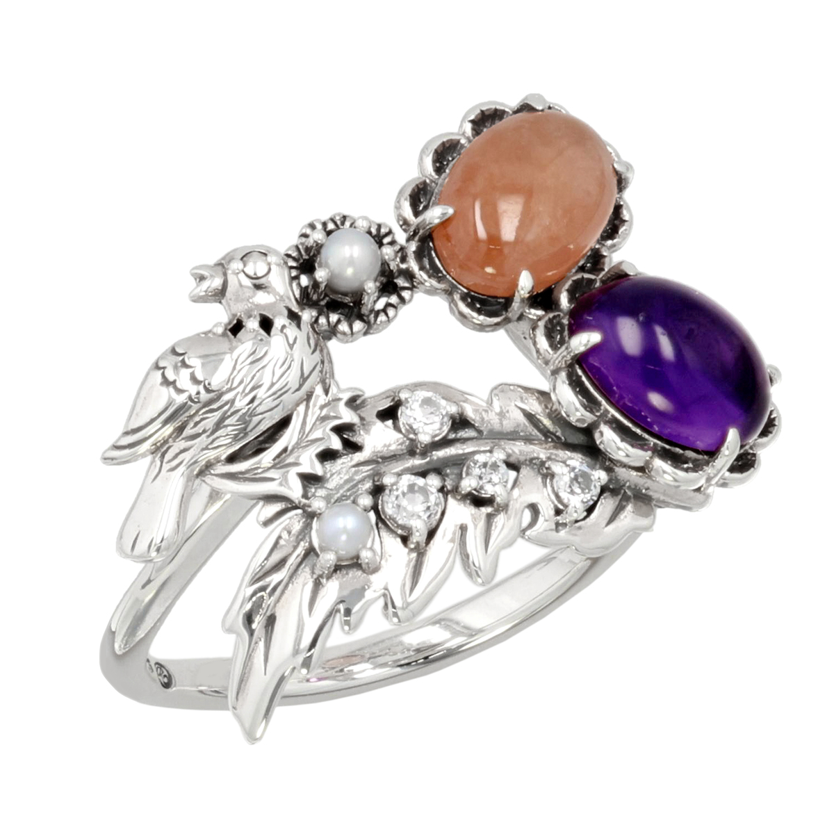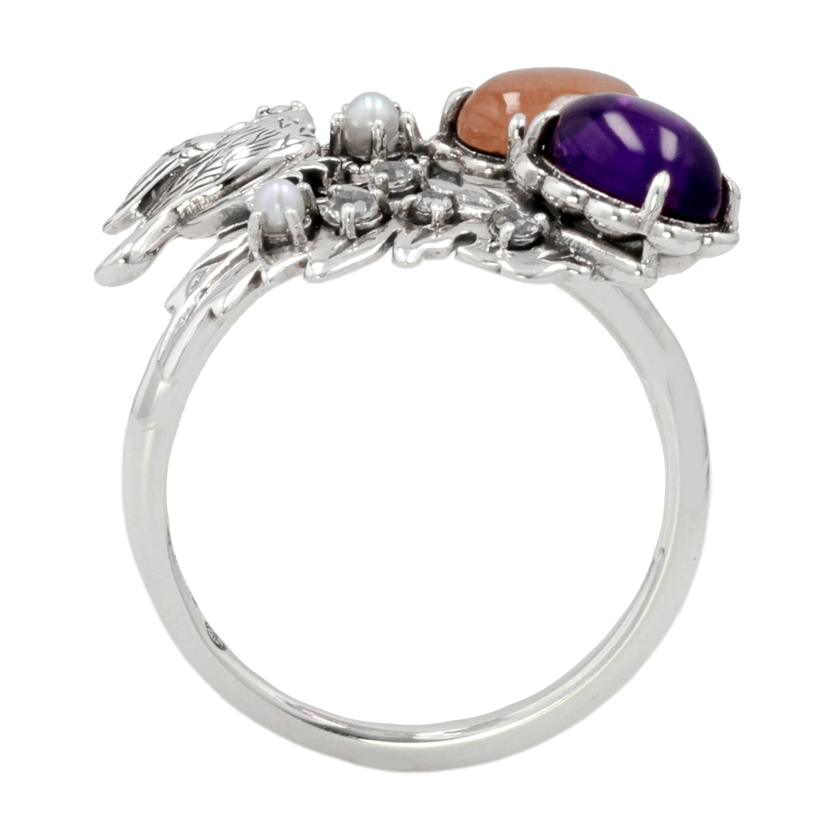 アメシストとインカローズを、お花のイメージでデザインした石座にセット。可愛いナイチンゲール(サヨナキドリ)もポイントに。繊細なシードパールのお花も可愛らしさをプラスしています。動きのあるおしゃれなデザインです