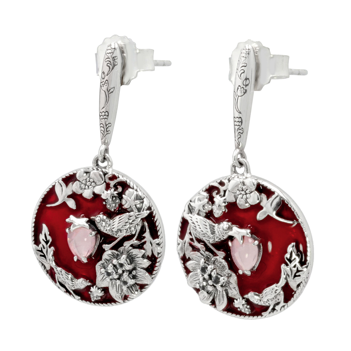 背景にはいちごカラーのみずみずしい赤のエナメルを施しました。さらに、ペアシェイプのローズクォーツとラウンドカットのガーネットをパターンの要となるイチゴ部分にアクセントとして留めた作品です
