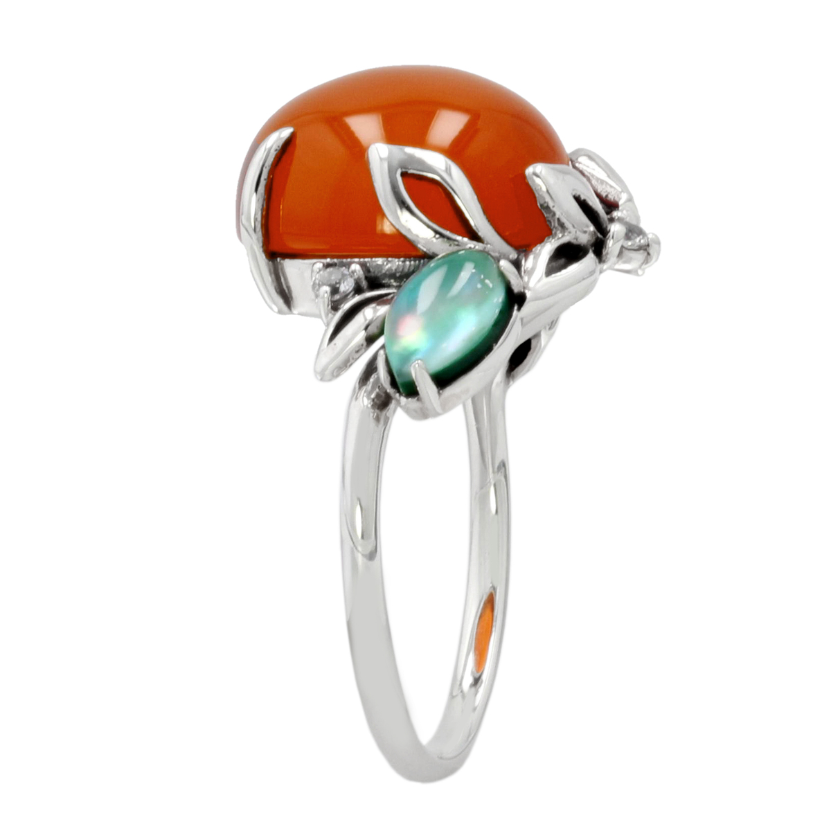 のびのびとした地金使いにも注目。赤めのうにふんわりとのるようにデザインされた葉や、立体的に作られた葉に寄り添うように配された宝石の角度により柔らかさが生まれ、優しい雰囲気の作品に仕上がりました