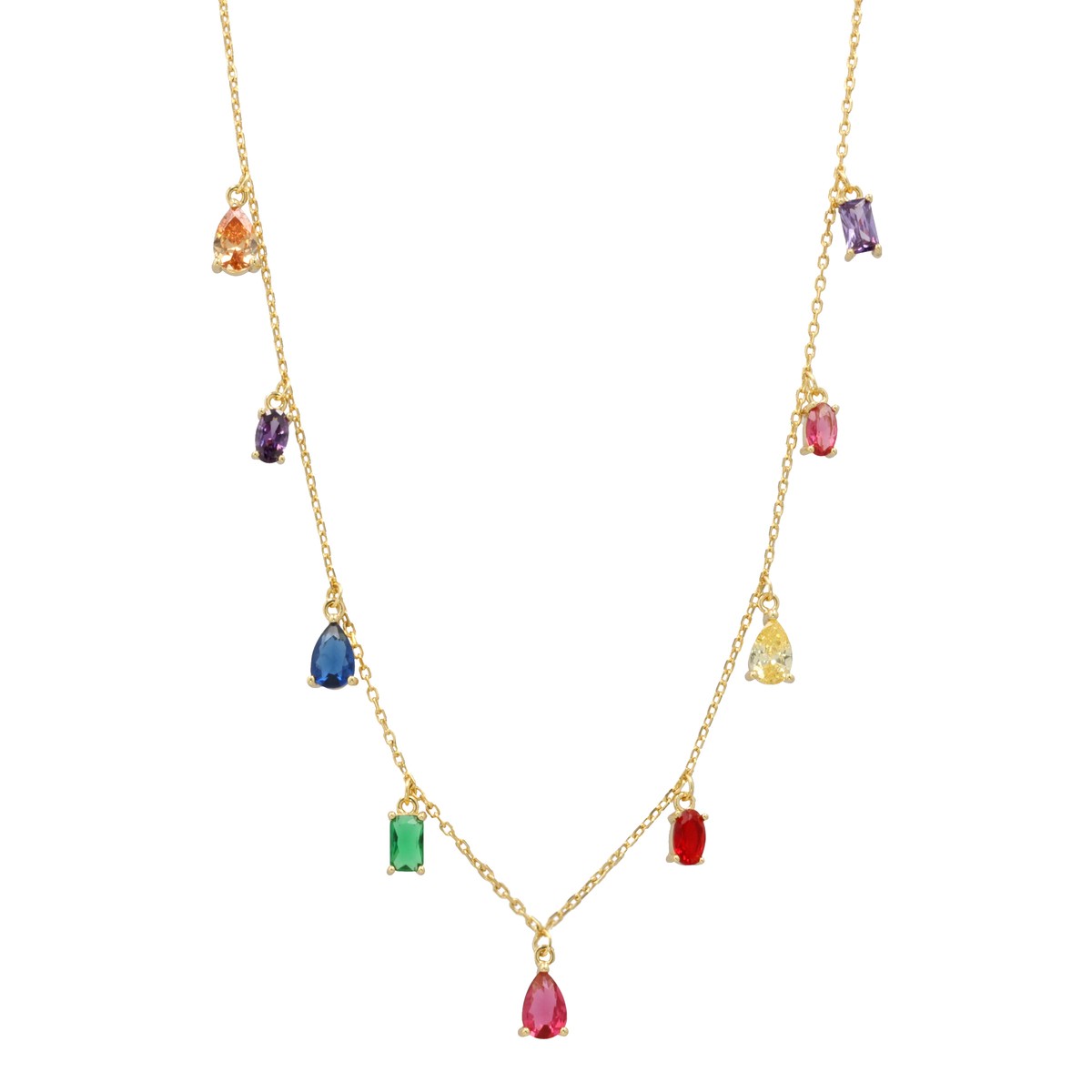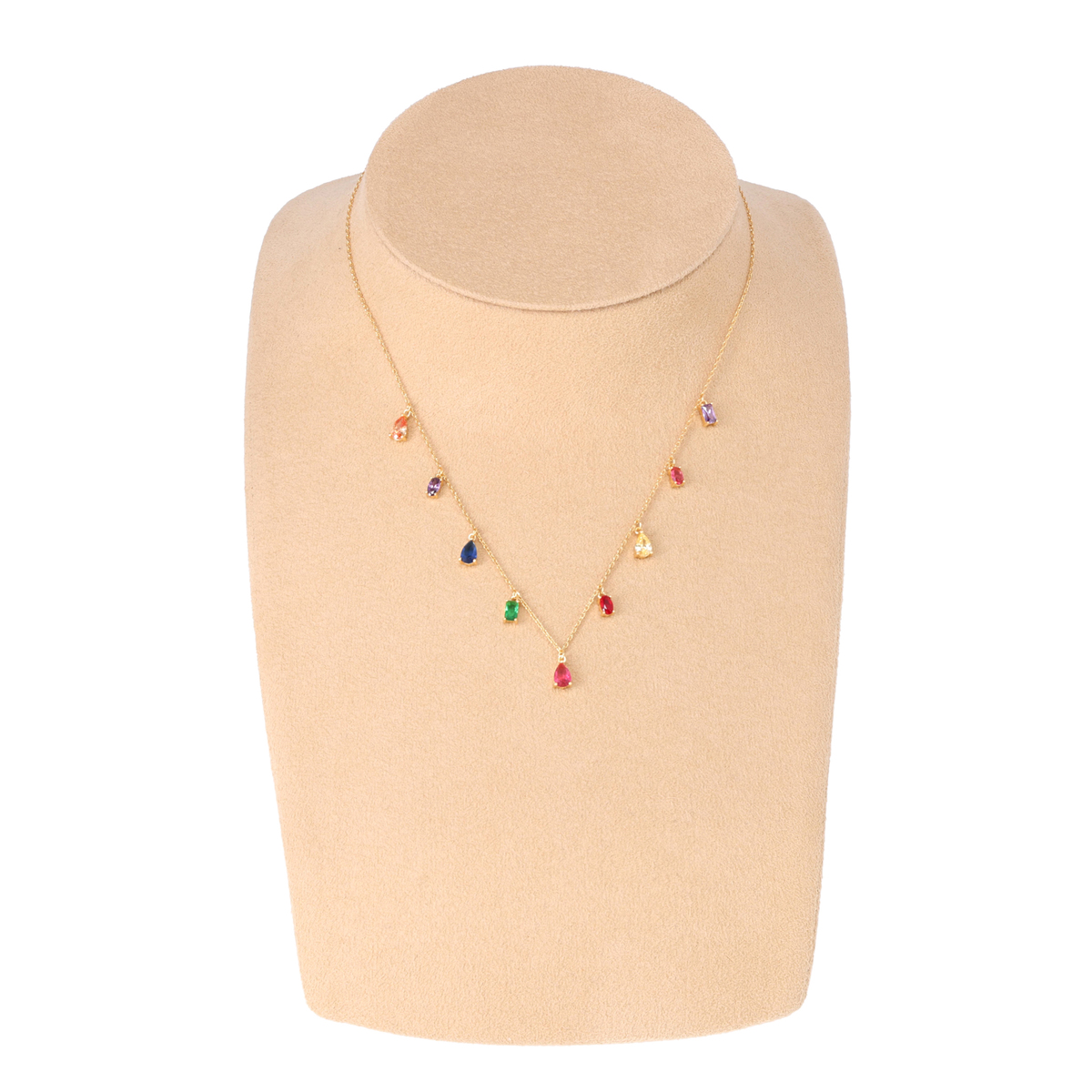 色とりどりのパーツをあしらい、華やかで遊び心のあるデザインに仕上げたネックレス。動きに合わせて揺れるストーンが装いのアクセントになってくれます