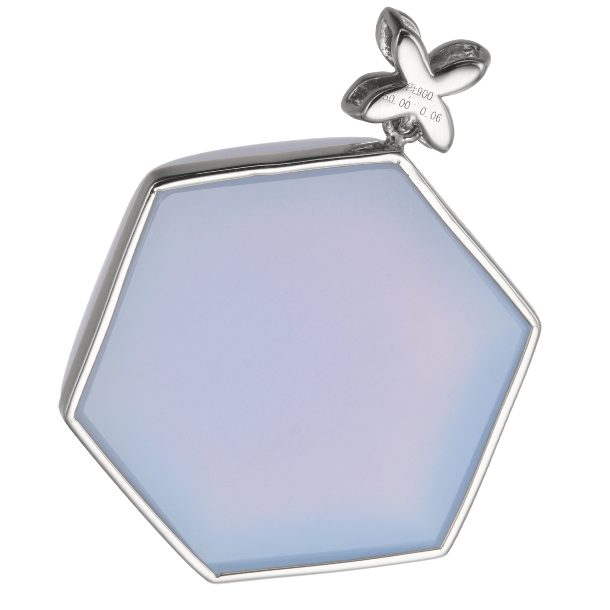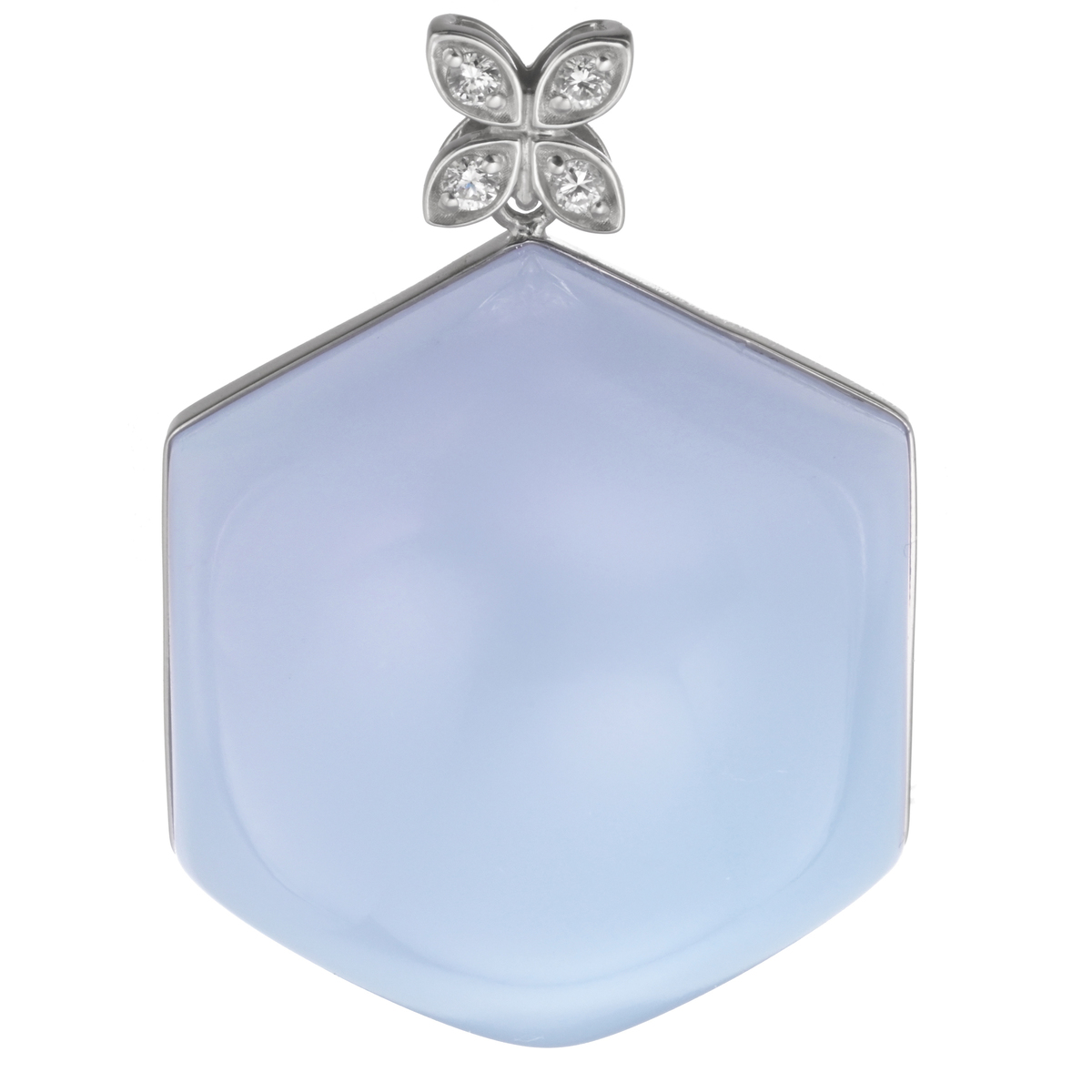 とろみのある優しいブルーカルセドニーを主役にしたペンダントヘッド。50.00ctUPの量感に合わせ、プラチナの枠とバチカンのダイヤモンドで、色合いを引き立てています。使用したブルーカルセドニーは、着色していない天然のものです