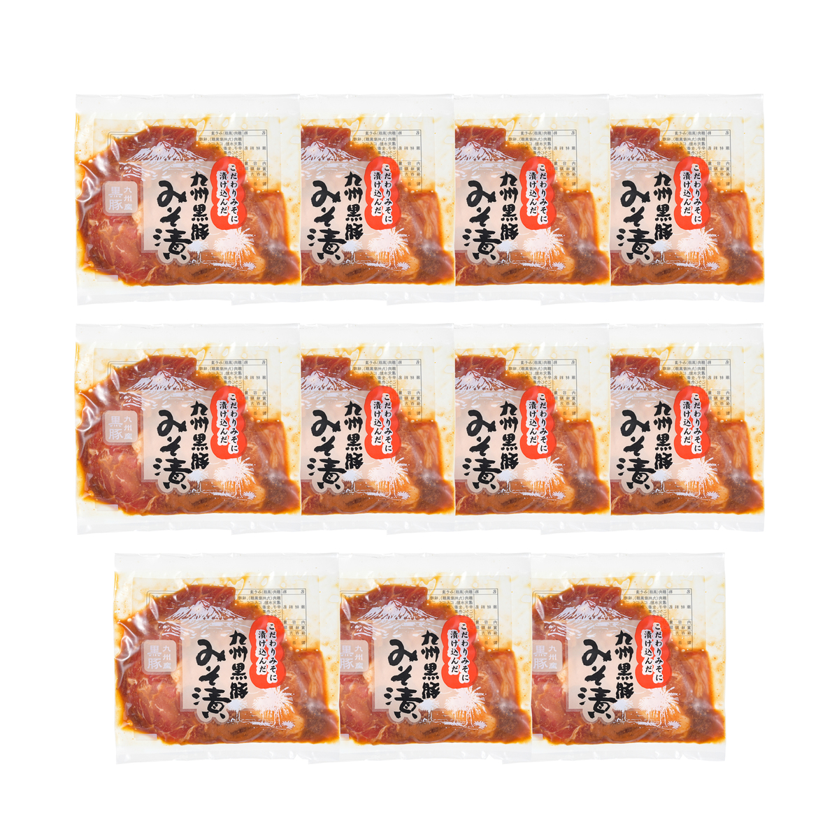 [アレルギー物質特定原材料8品目] 小麦 [内容量] 130g×11 [賞味期限] 出荷時点で賞味期限まで120日以上ある商品をお届けします [保存方法] 開封前:冷凍(ー18℃以下)で保存してください 開封後:開封後はお早めにお召上がりください [お召し上がり方] ・本品が凍っている場合、必ず調理前に解凍を行ってください ・解凍の際は袋を開封せずに、冷蔵庫又は流水解凍してください。湯煎、オーブン、電子レンジでの調理はできません ・みそタレは絡めたまま、フライパンにアルミホイル又はクッキングシートを敷き、その上に本品を置いて中火で加熱してください [注意事項] ※味付処理をしていますので、中心部まで十分に加熱してお召し上がりください ※本品が凍っている場合、必ず調理前に解凍を行ってください ※解凍の際は開封せずに、冷蔵庫又は流水解凍してください。湯せん、オーブン、電子レンジでの調理はできません ※賞味期限は、記載の保存方法にて未開封で保存した場合の期限です。開封後はお早めにお召し上がりください ※一度解凍した本品は、再冷凍されぬようにお願い致します [原料原産地] 豚肉(九州産黒豚) [原産国] 日本 [原材料] 豚肉(九州産黒豚)、味噌、醤油、砂糖、還元水飴、にんにく、ごま油、ごま、唐辛子、生姜/調味料(アミノ酸等)、紅こうじ色素、(一部に小麦・豚肉・大豆・ごまを含む)