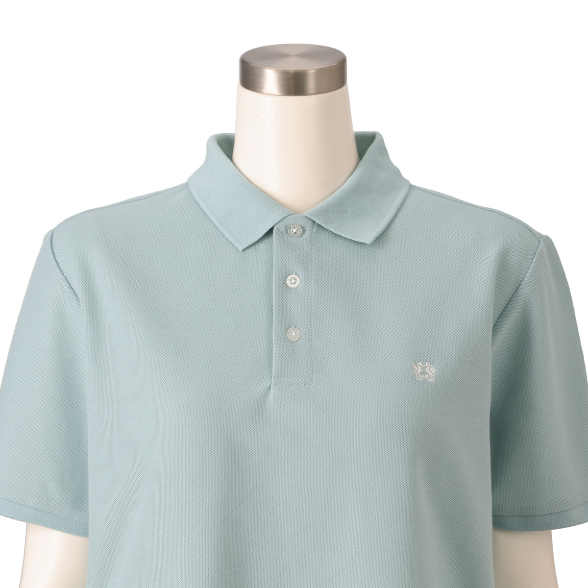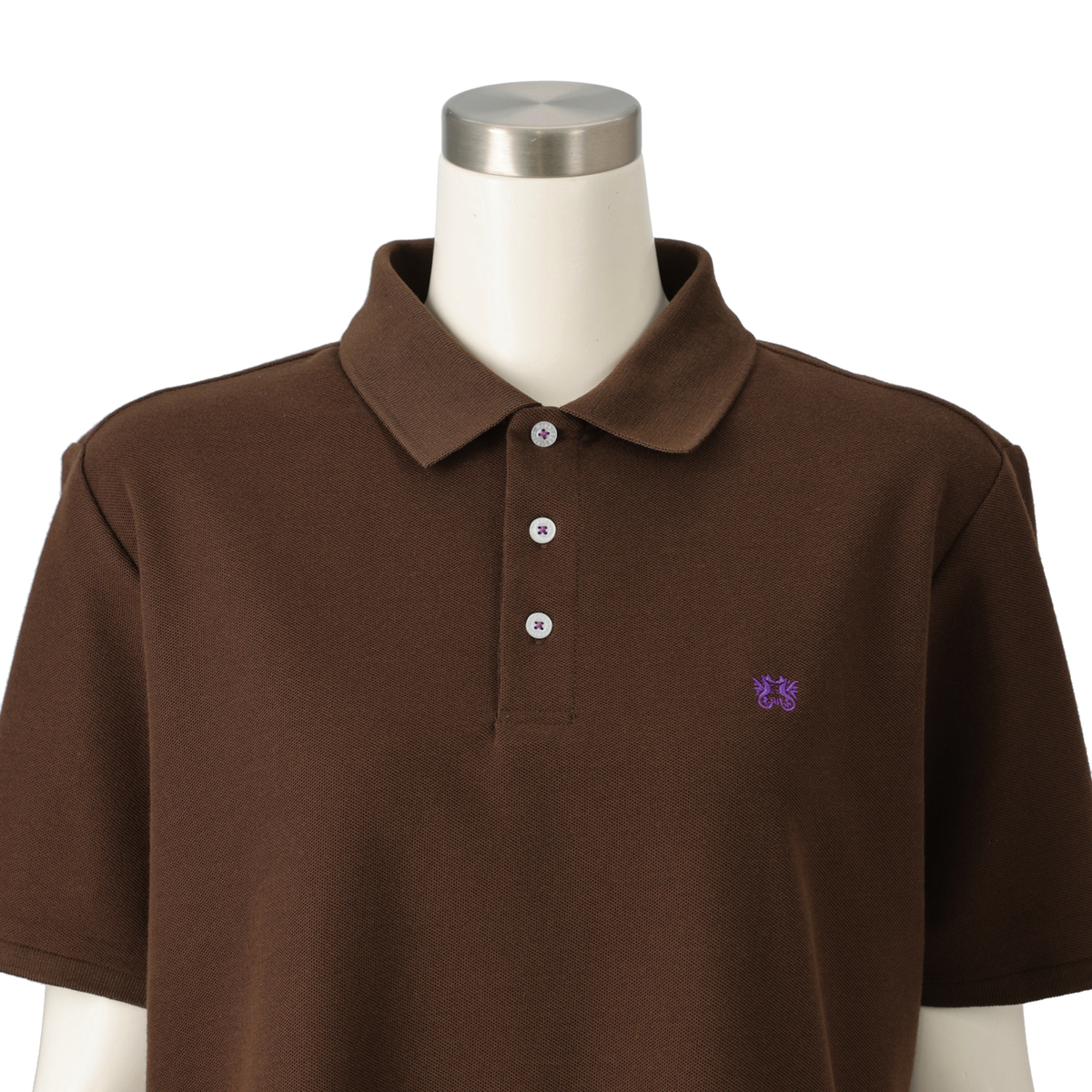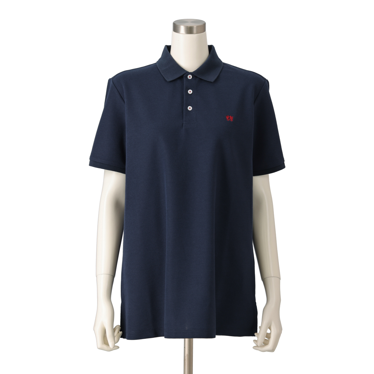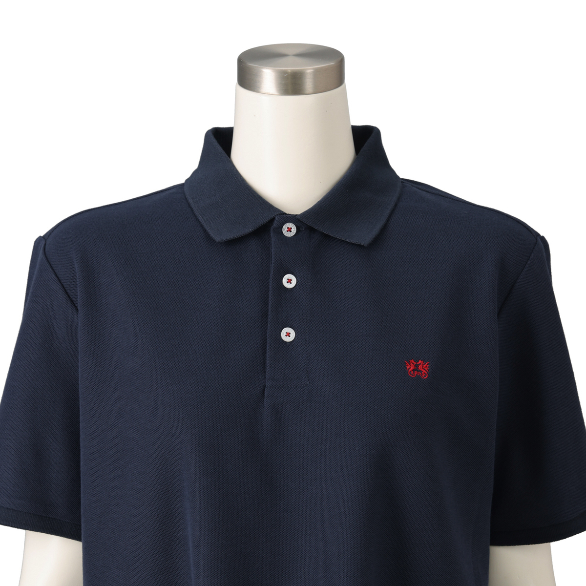 カノコ特有の凹凸感で、きちんと感のあるポロチュニック。前立ての裏やスリット裏、襟付け部分には同色のヘリンボーンテープを施し、トラッドなディティールにこだわりました。左胸のドラゴン刺繍や、貝調の刻印入りボタンがアクセントになっています