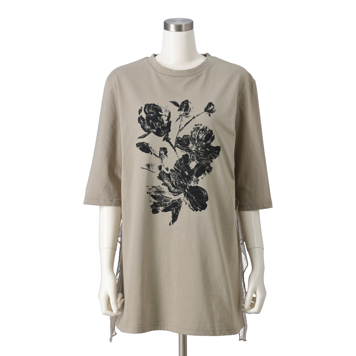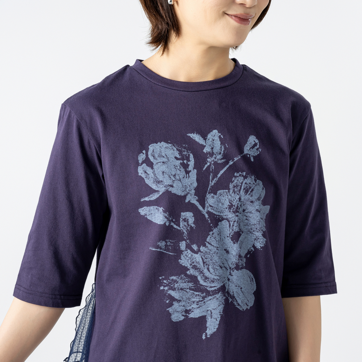 胸元には、モノタイプ風のブロッサム柄をあしらい、インクのかすれやにじみ、押しムラまで繊細に表現。デイリーにもお出かけにも、さりげなく個性を引き立てます