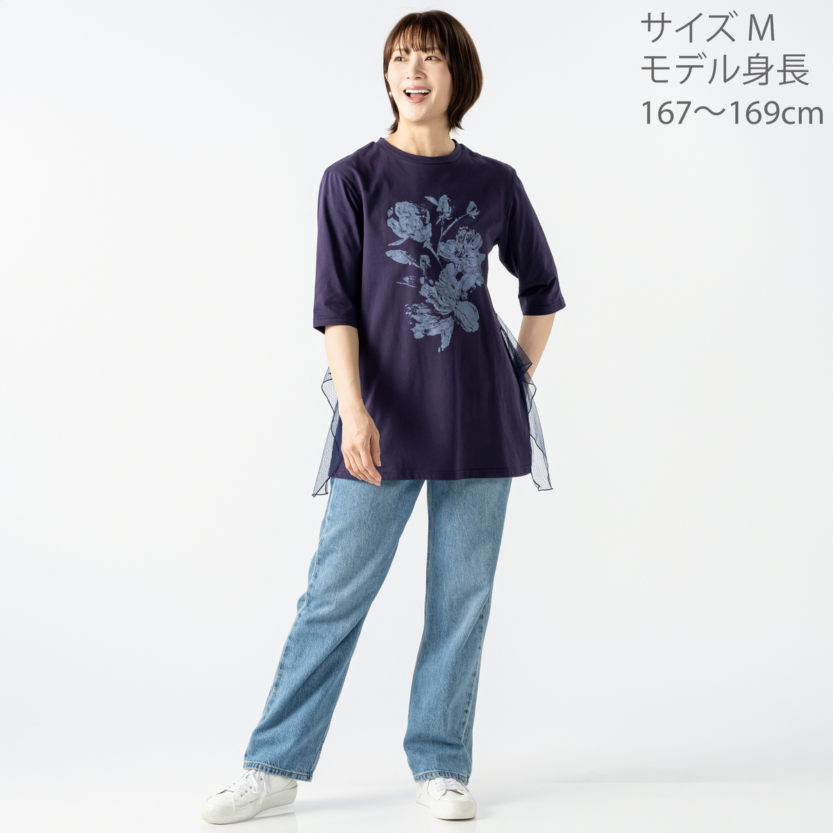 [商品寸法(ヌード)cm] サイズ バスト 着丈 裄丈 M:98(83〜88) 75 57 L:102(87〜92) 76 58 LL:108(91〜96) 77 59 3L:112(95〜100) 78 60 [素材] 本体:コットン 100% チュール部分:ナイロン 100% [お手入れ] 洗濯機洗い可 [注意事項] ※商品寸法の誤差は多少発生します。ご了承下さい 【中国製】