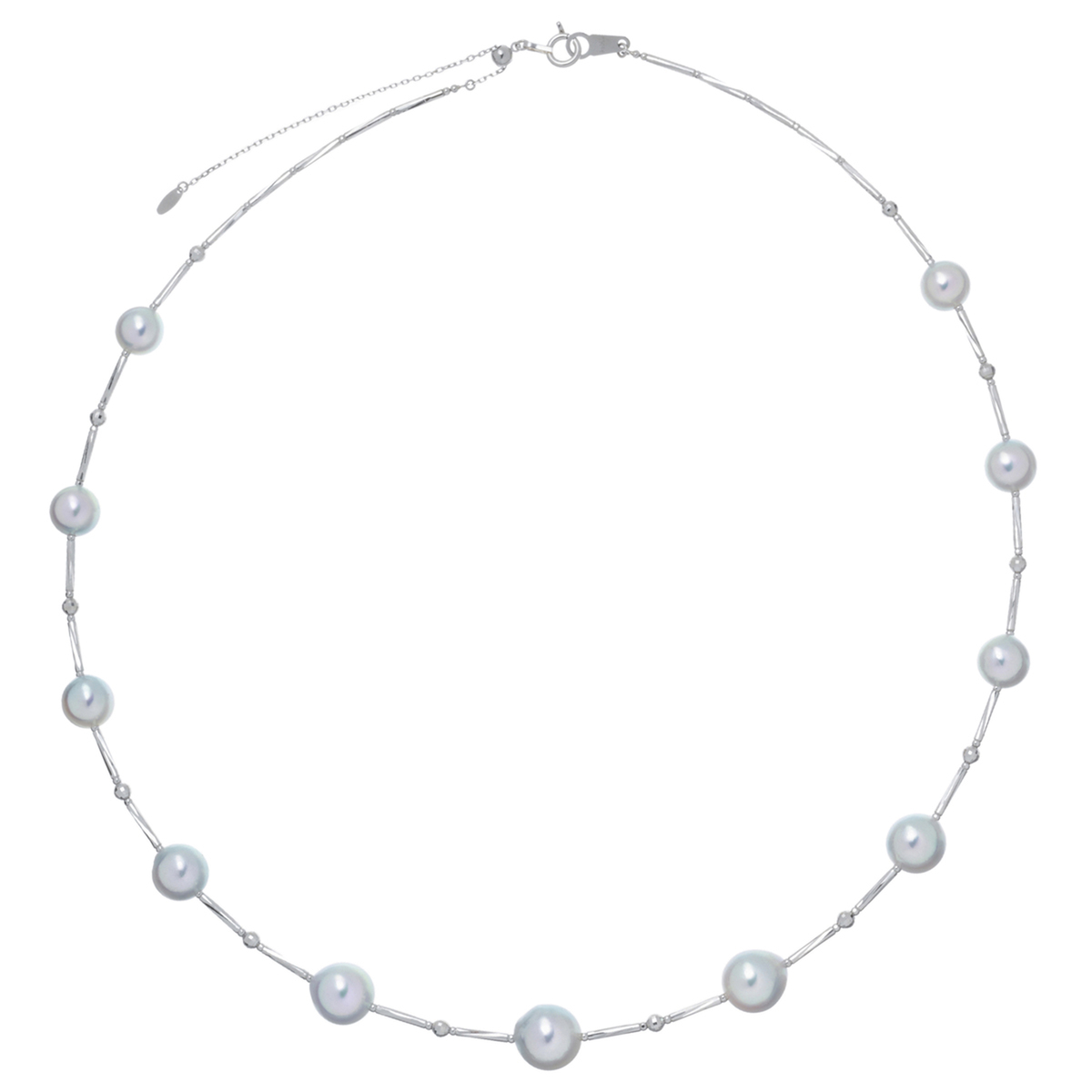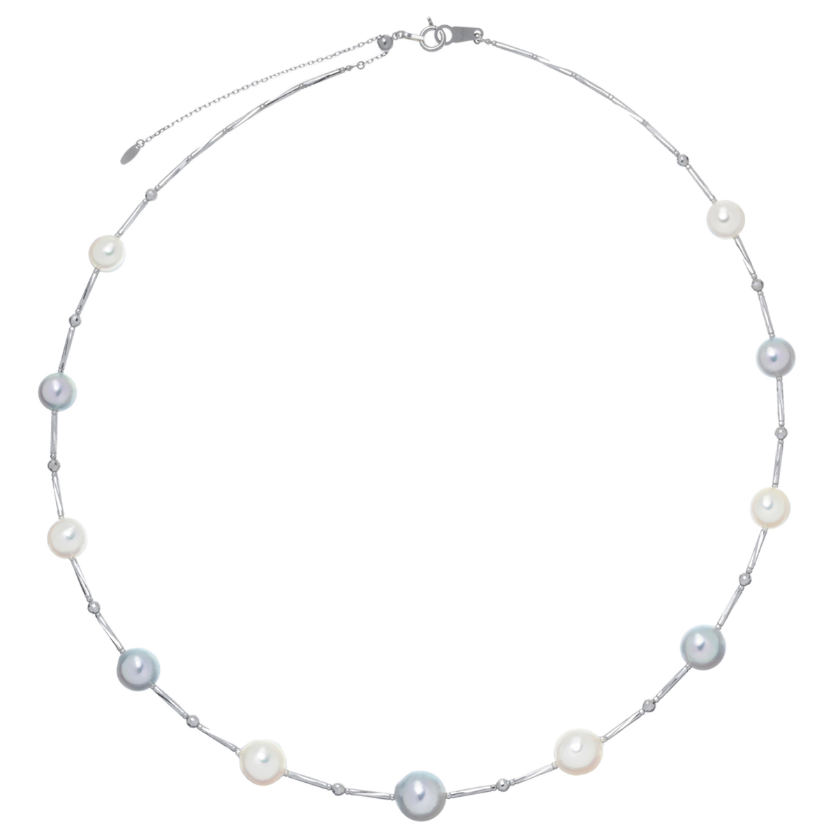 ナチュラルカラーのアコヤ真珠が映えるネックレス。プラチナのオメガタイプのファンシーチェーンにパールをリズミカルに配したステーションデザインで、穏やかな艶が装いにやさしく華やぎを添えます。フォーマルにもカジュアルにも馴染み、さまざまなシーンで活躍します