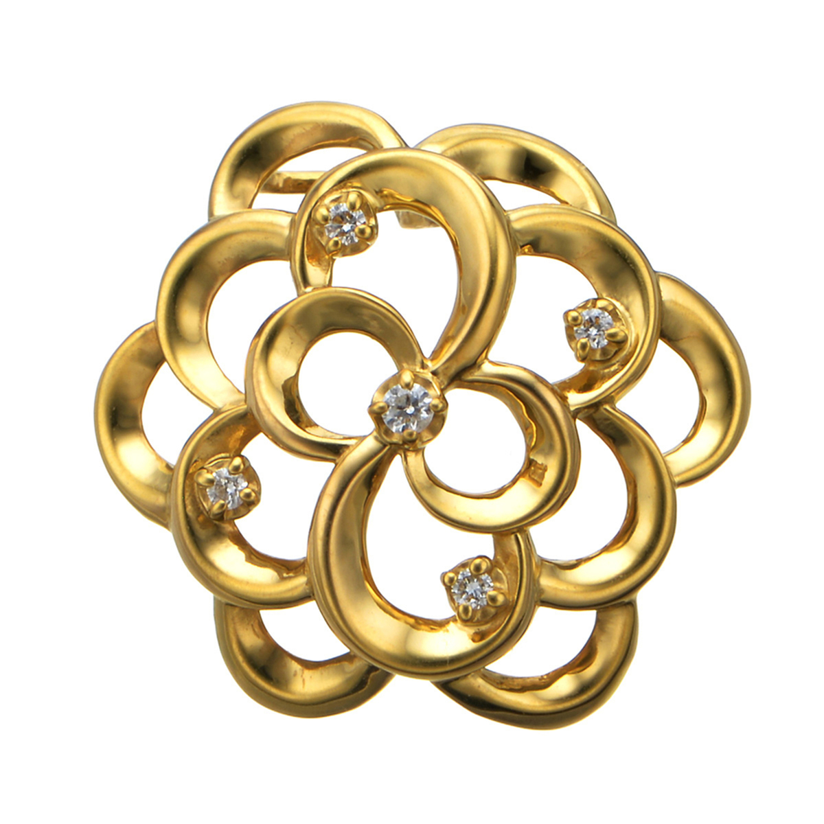 花の柔らかな自然美を生かしながら輝きが出るように、花びら一枚一枚と石座に照り返しを施しました。身に着けることで、明るく華やかな印象を与えてくれるジュエリーです