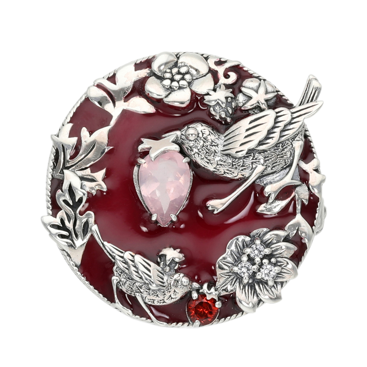 背景にはいちごカラーのみずみずしい赤のエナメルを施しました。さらに、バフトップカットのローズクォーツと、ラウンドカットのガーネットをパターンの要となるイチゴ部分にアクセントとして留めた作品です。ペンダントとしてもお使いいただけます
