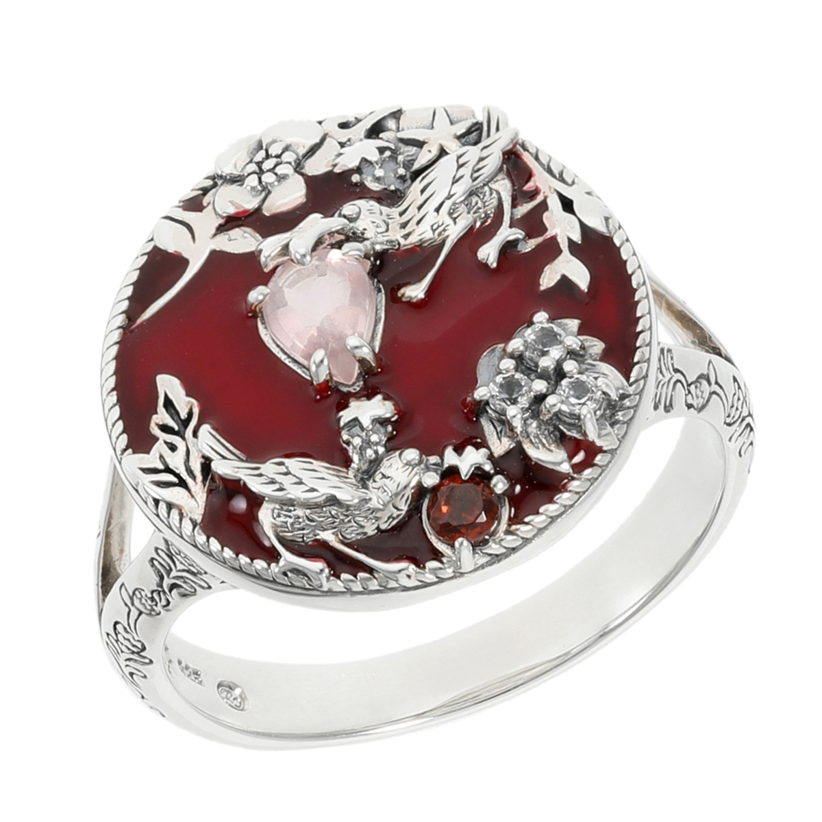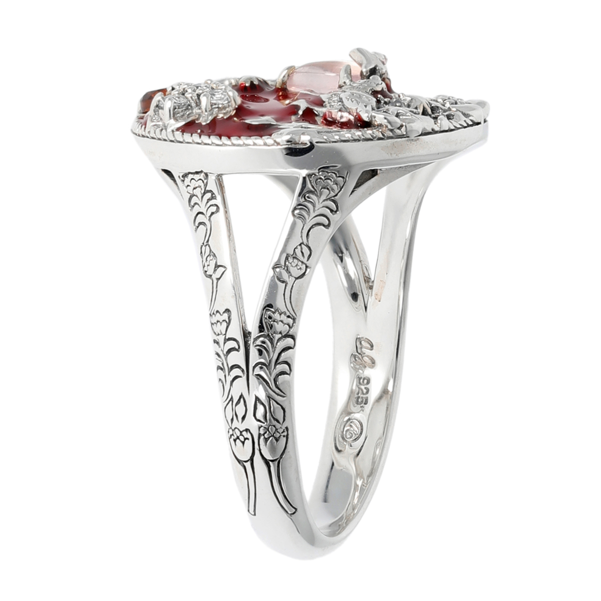 背景にはいちごカラーのみずみずしい赤のエナメルを施しました。さらに、バフトップカットのローズクォーツと、ラウンドカットのガーネットをパターンの要となるイチゴ部分にアクセントとして留めた作品です