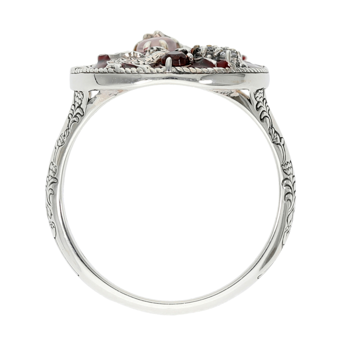 素材: [ガーネット] ラウンドカット 爪留め/接着 1石 [ローズクォーツ] ペアシェイプ・バフトップカット 爪留め/接着 1石 [ホワイトトパーズ] ラウンドカット 爪留め/接着 3石 最大幅(約) 15.0mm 最小幅(約) 2.5mm 総重量(約) 2.8g [地金] シルバー925 [仕上げ] アンティーク仕上げ ■素材の大きさ・形・色合い、製品のサイズは1点1点多少異なります ■専用ケース付 【タイ製】