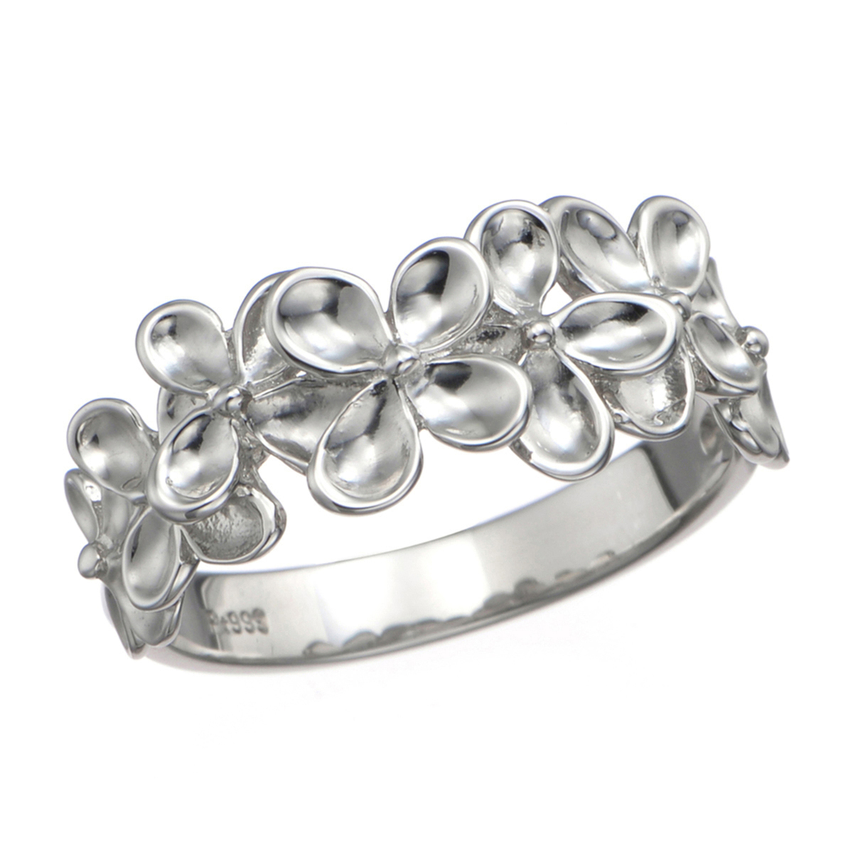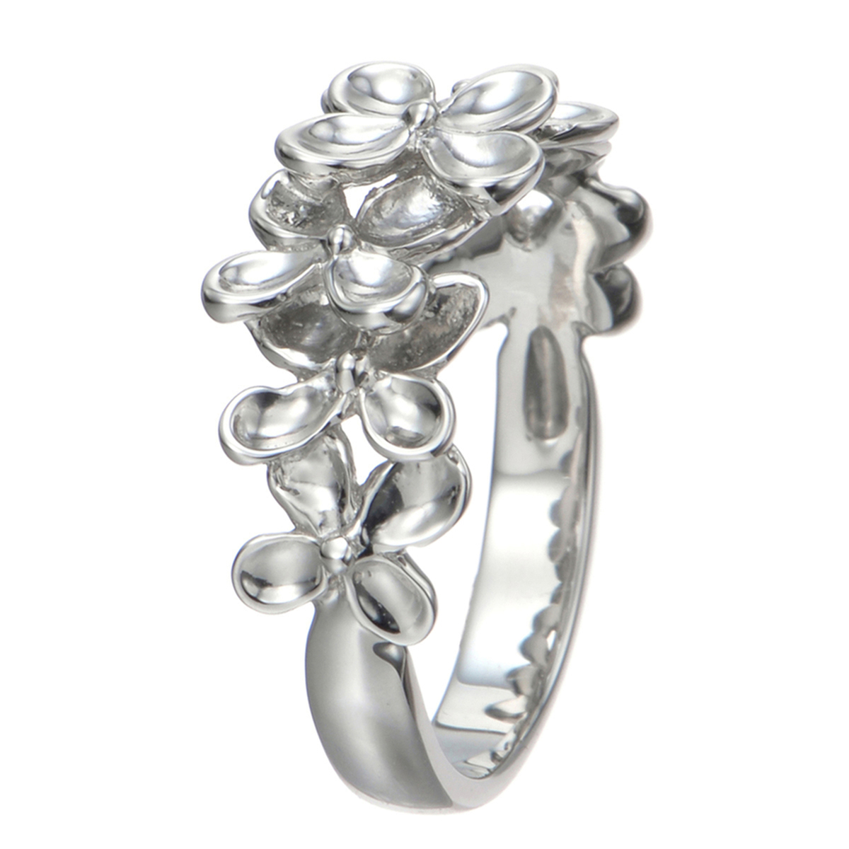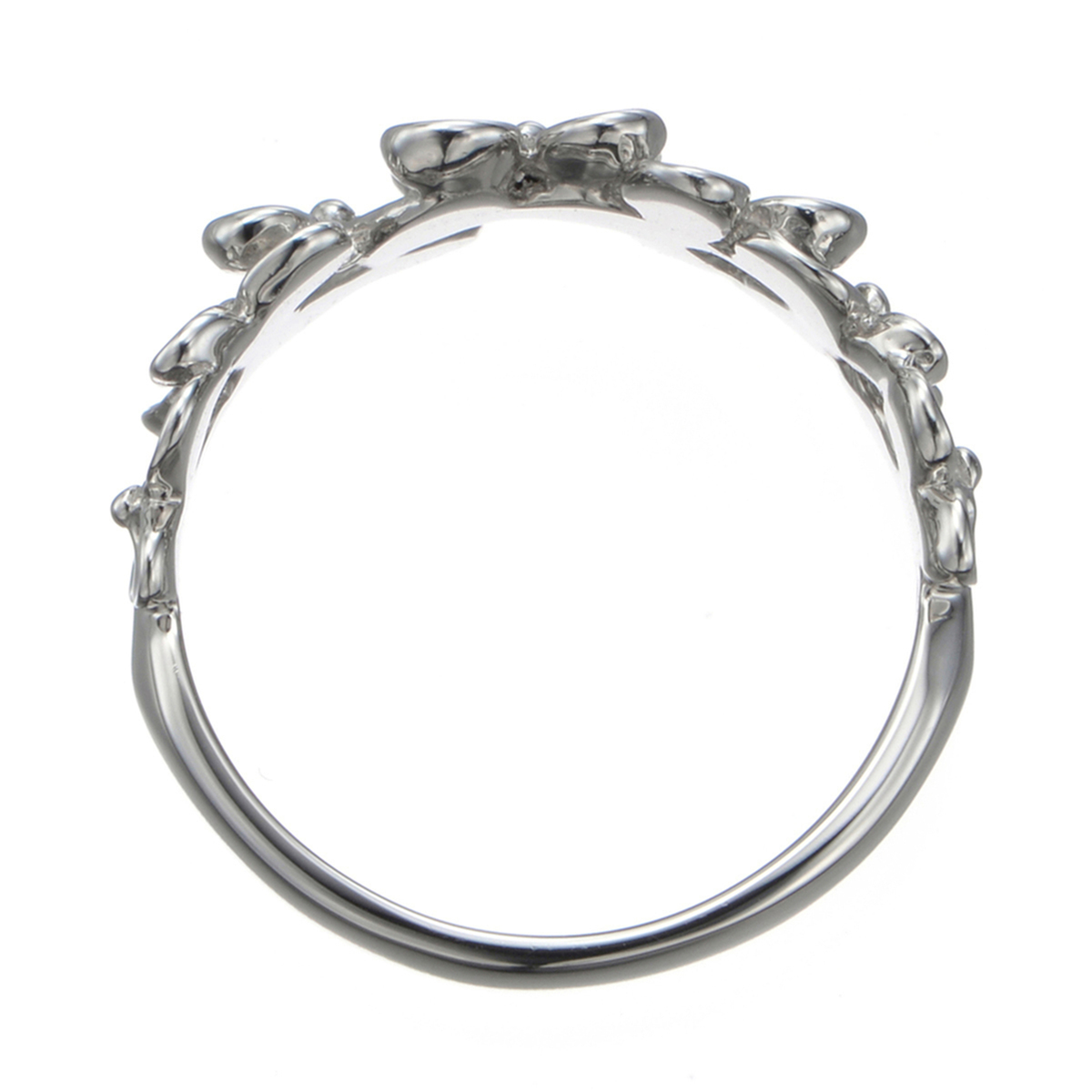 フェミニンなフラワーモチーフのリング。丸みを持たせた花びらが愛らしく、立体的に重なり合うように並べたモチーフが、花冠のようにお手元で煌めきます