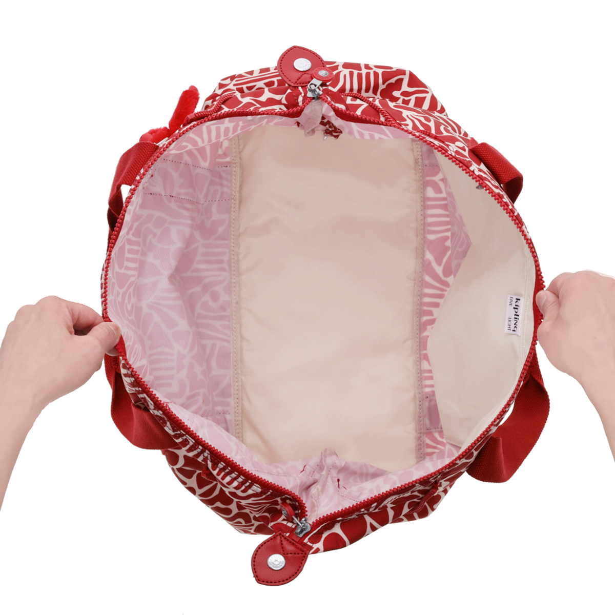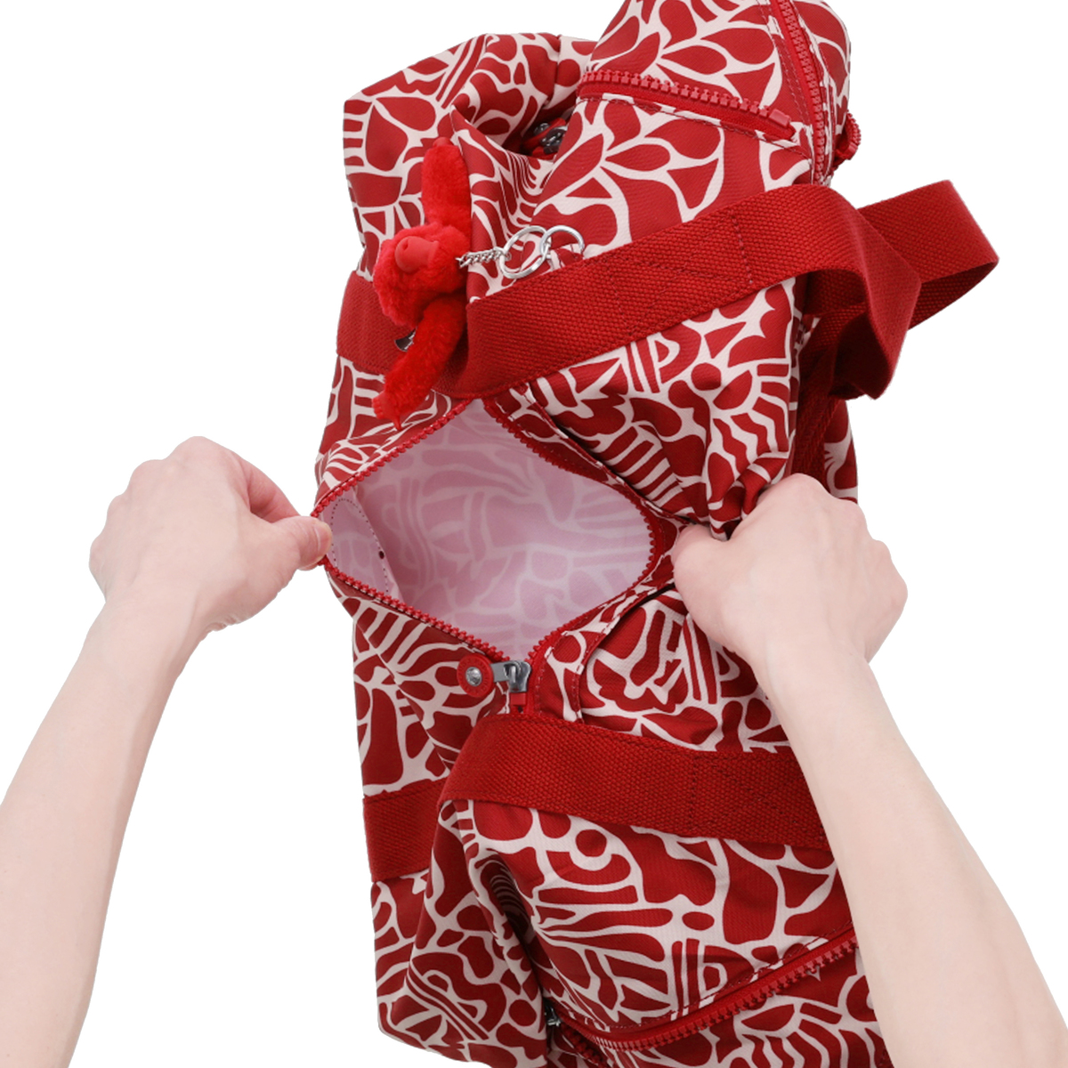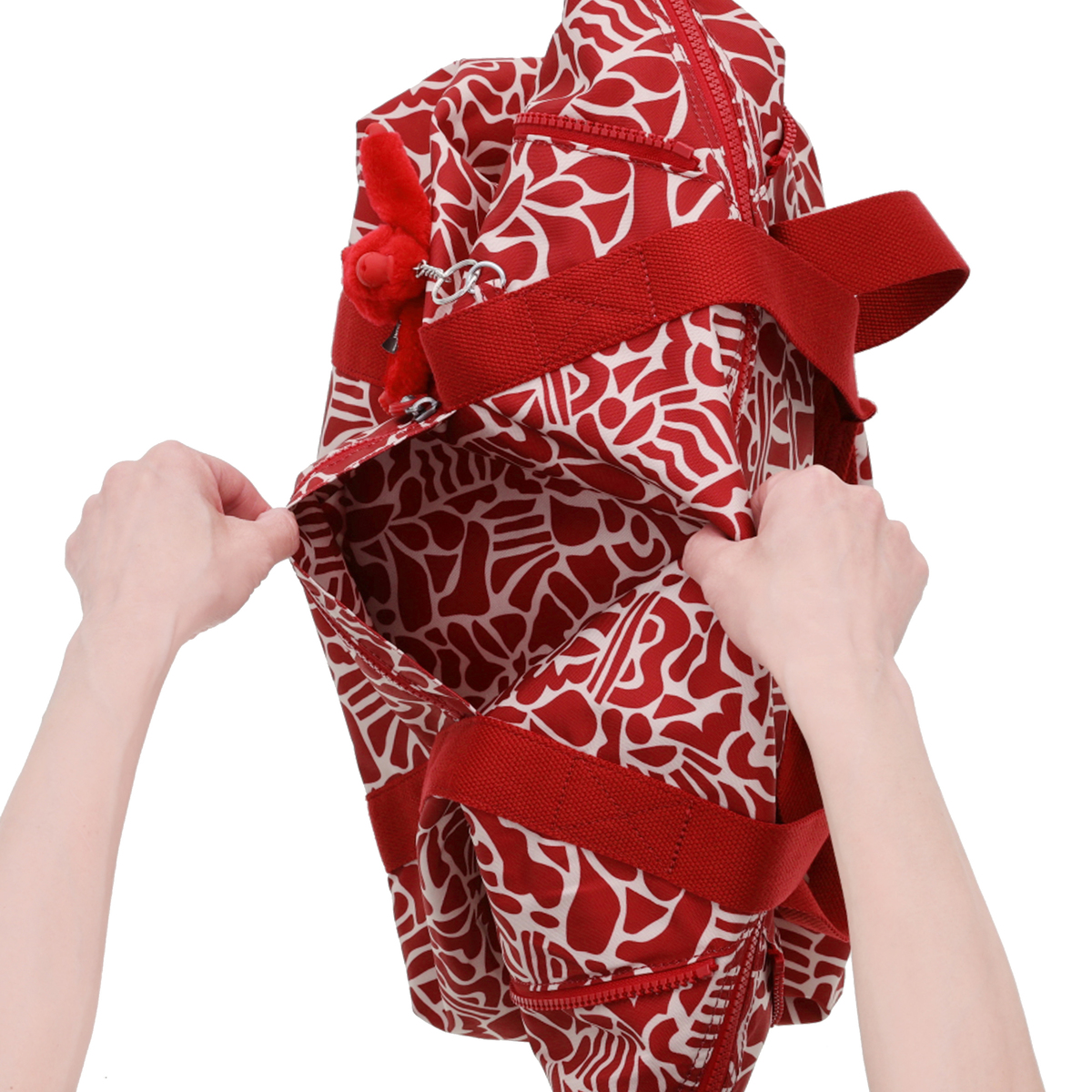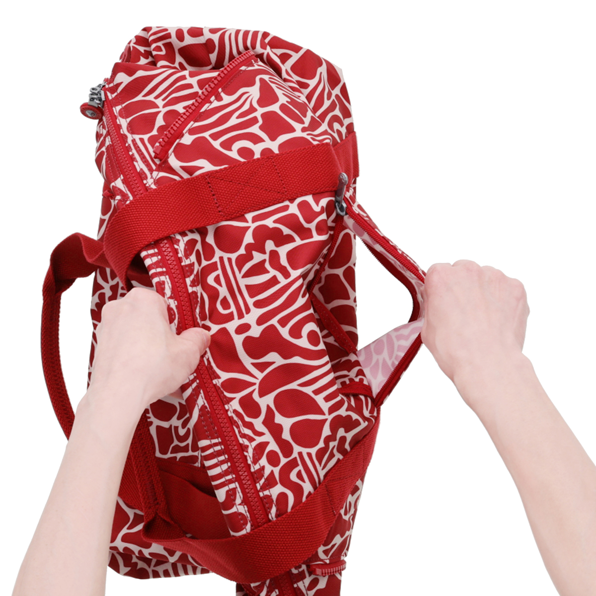 上部メインファスナー左右に付いたファスナーを開閉することで、荷物の量に合わせてシルエットが変えられます。また後側はキャリーバーにバッグを差し込める仕様。上下がファスナーになっているのでポケットとしてもお使いいただけます