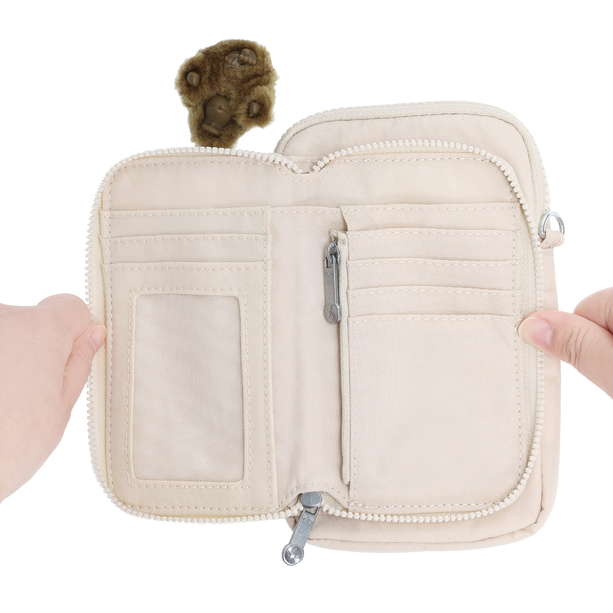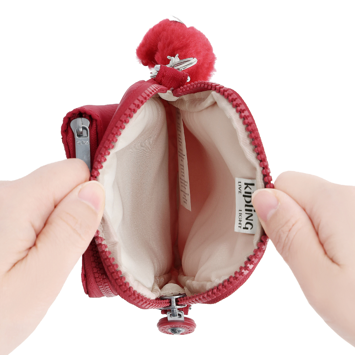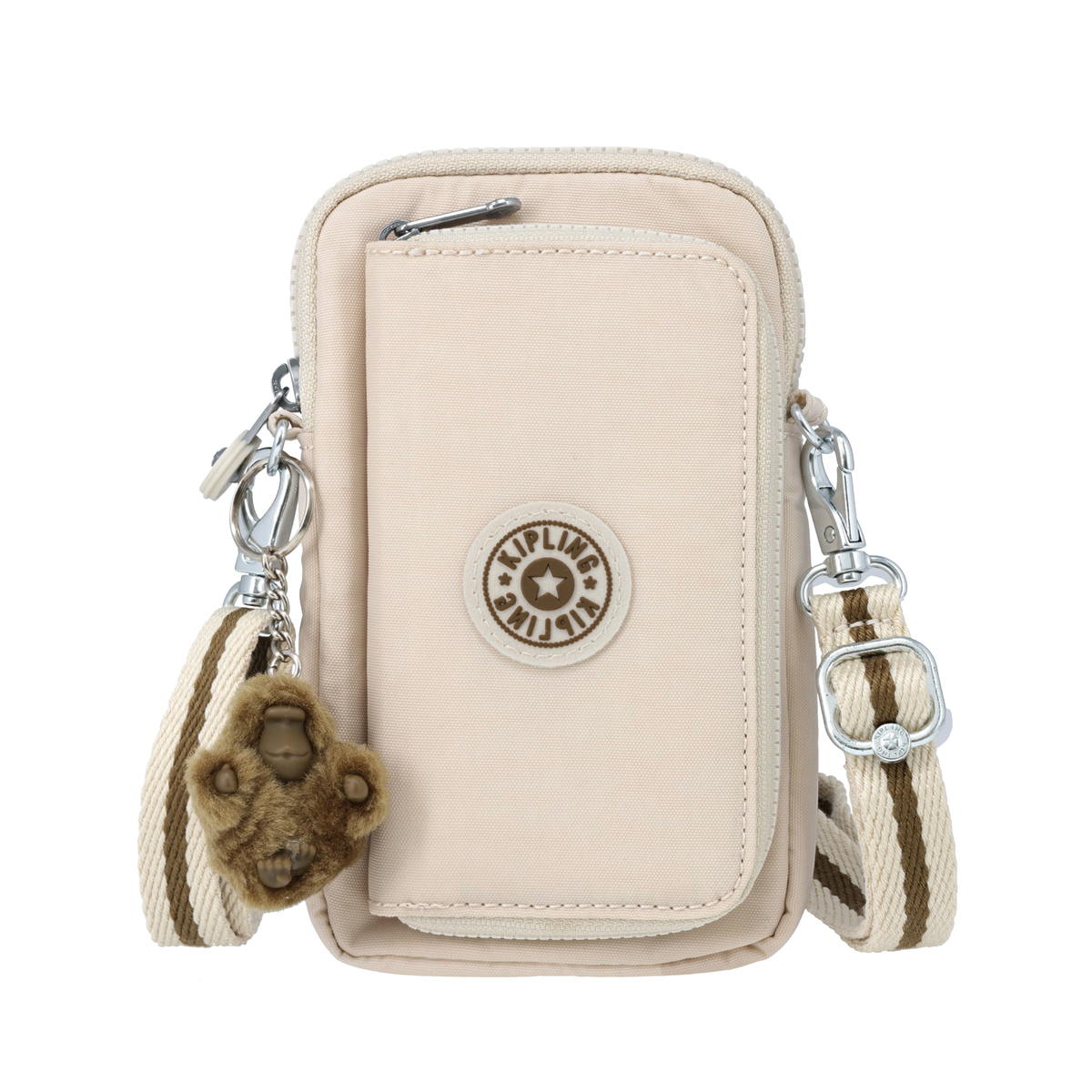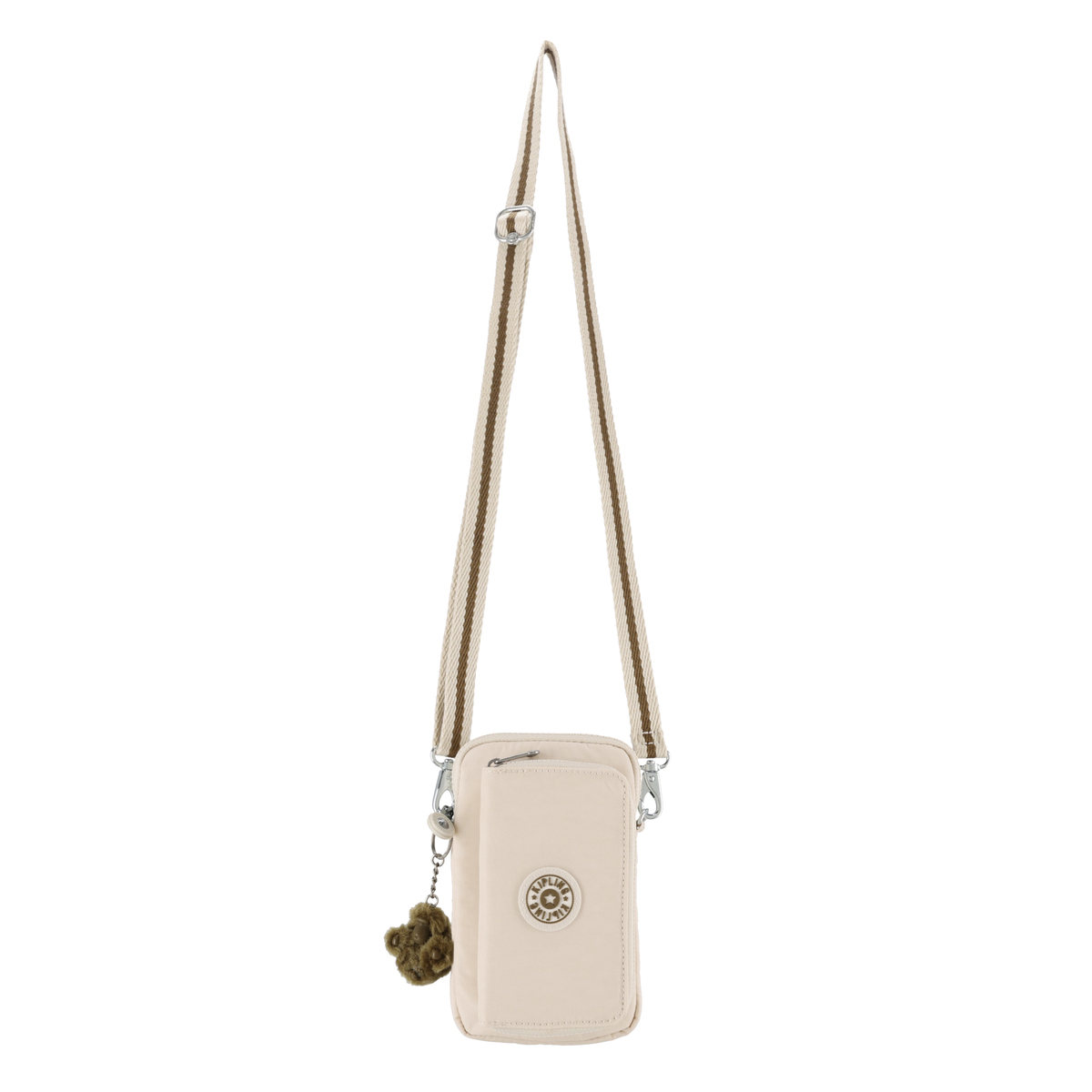 調節・取り外し可能なショルダーストラップ付きで、斜め掛けはもちろん、取り外してポーチとしても活躍。オリジナルデザインのファスナー引手はつかみやすく、バッグのデザインに合わせたマスコットタイプのチャームが個性を引き立てます