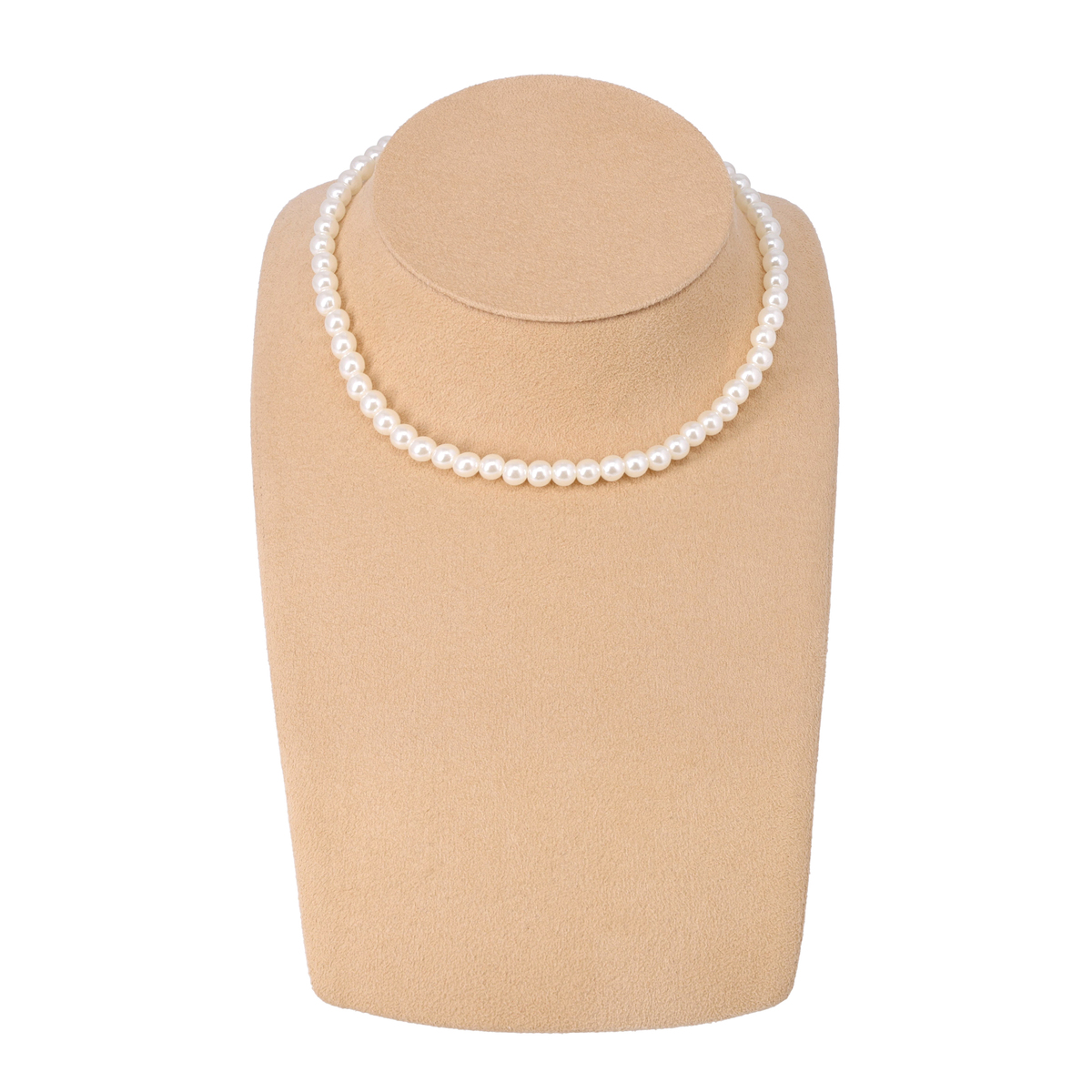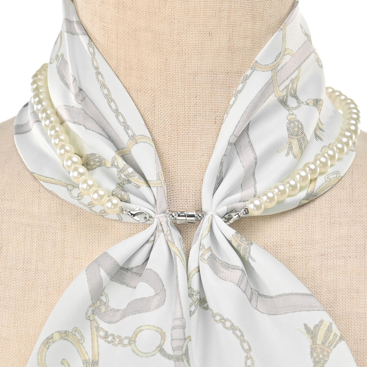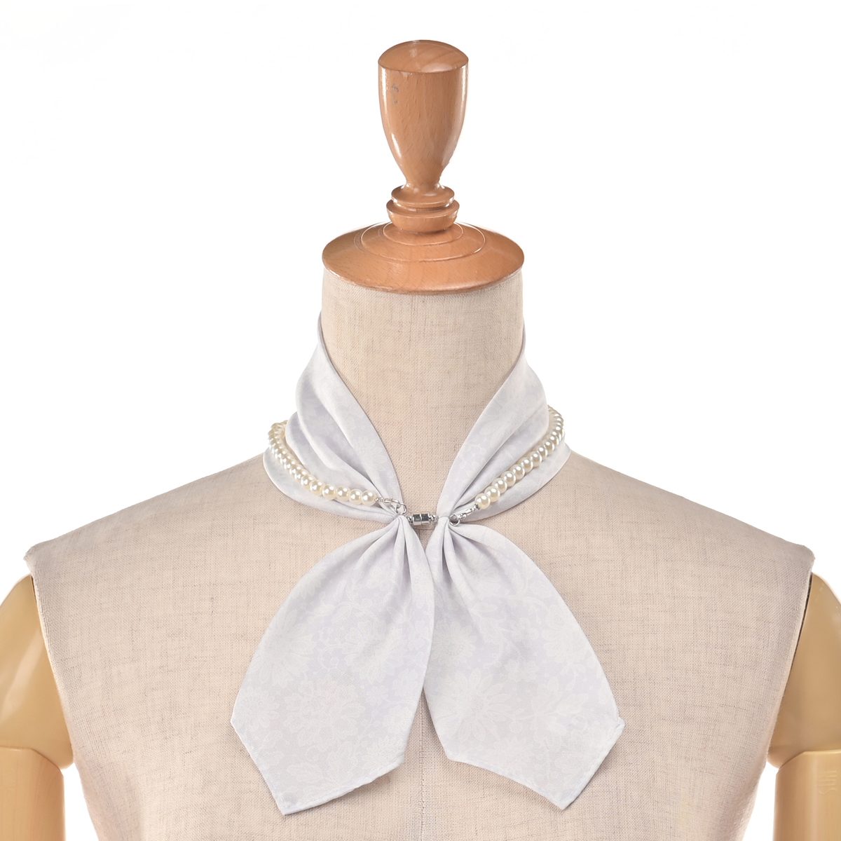 マグネットで留めるだけの楽々スカーフ。着脱が簡単で、ご家庭で簡単に手洗いできる手軽さも魅力。取り外して単体でも使えるパール調ネックレスが付属します