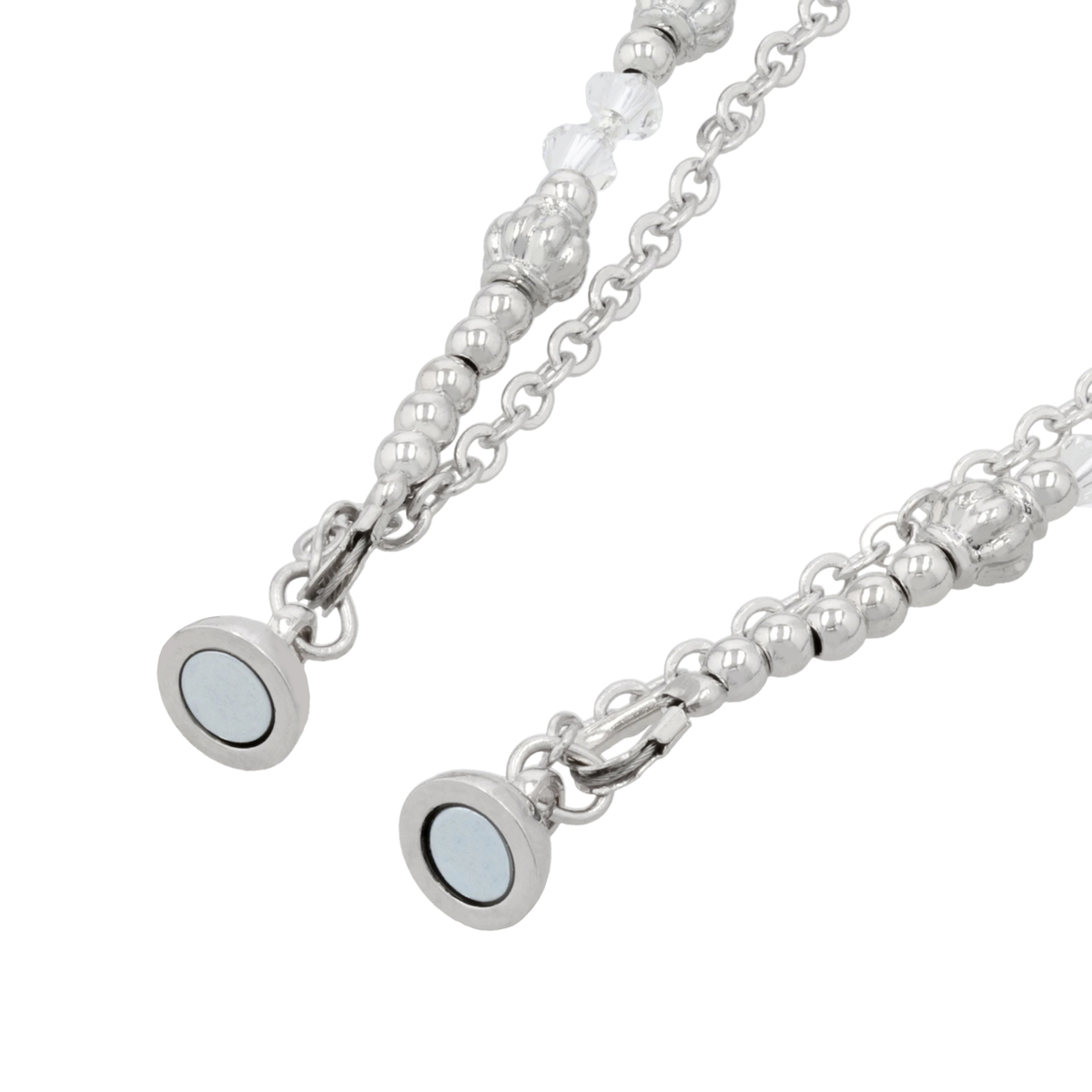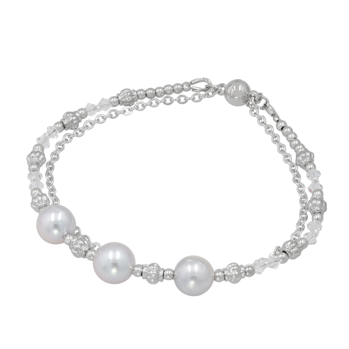 上品なアコヤ真珠と、煌めくガラスビーズを組合せた2連風デザインのブレスレット。装いの華やかなアクセントになってくれます
