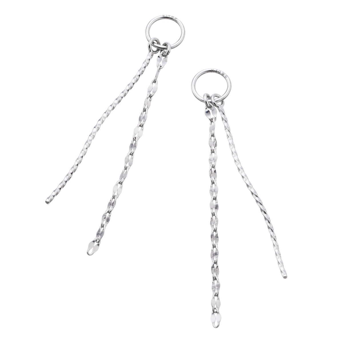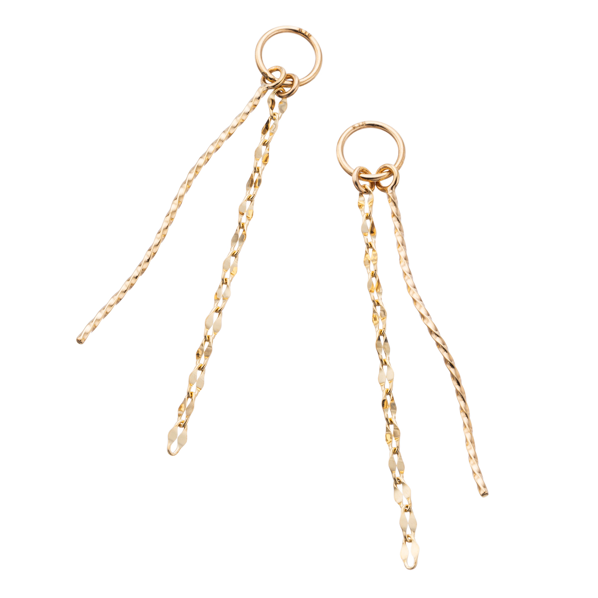 華やかな輝きを放つペタルチェーンと、ゆるやかなひねりパーツをあしらった縦長ラインのチャーム。動きにあわせて軽やかに揺れ動き、装いのアクセントになってくれます