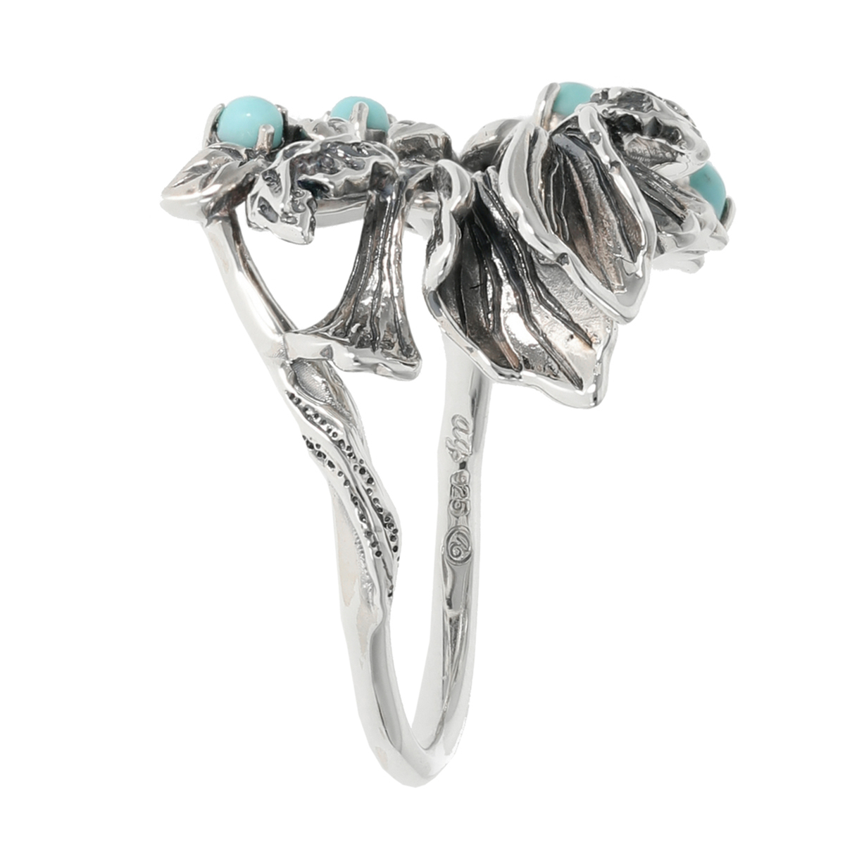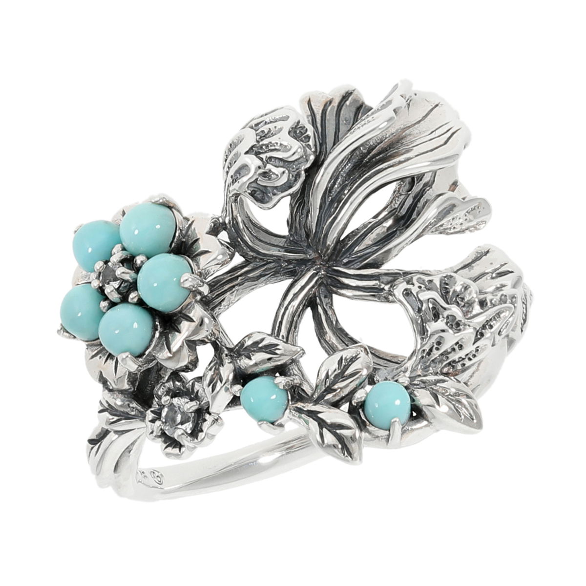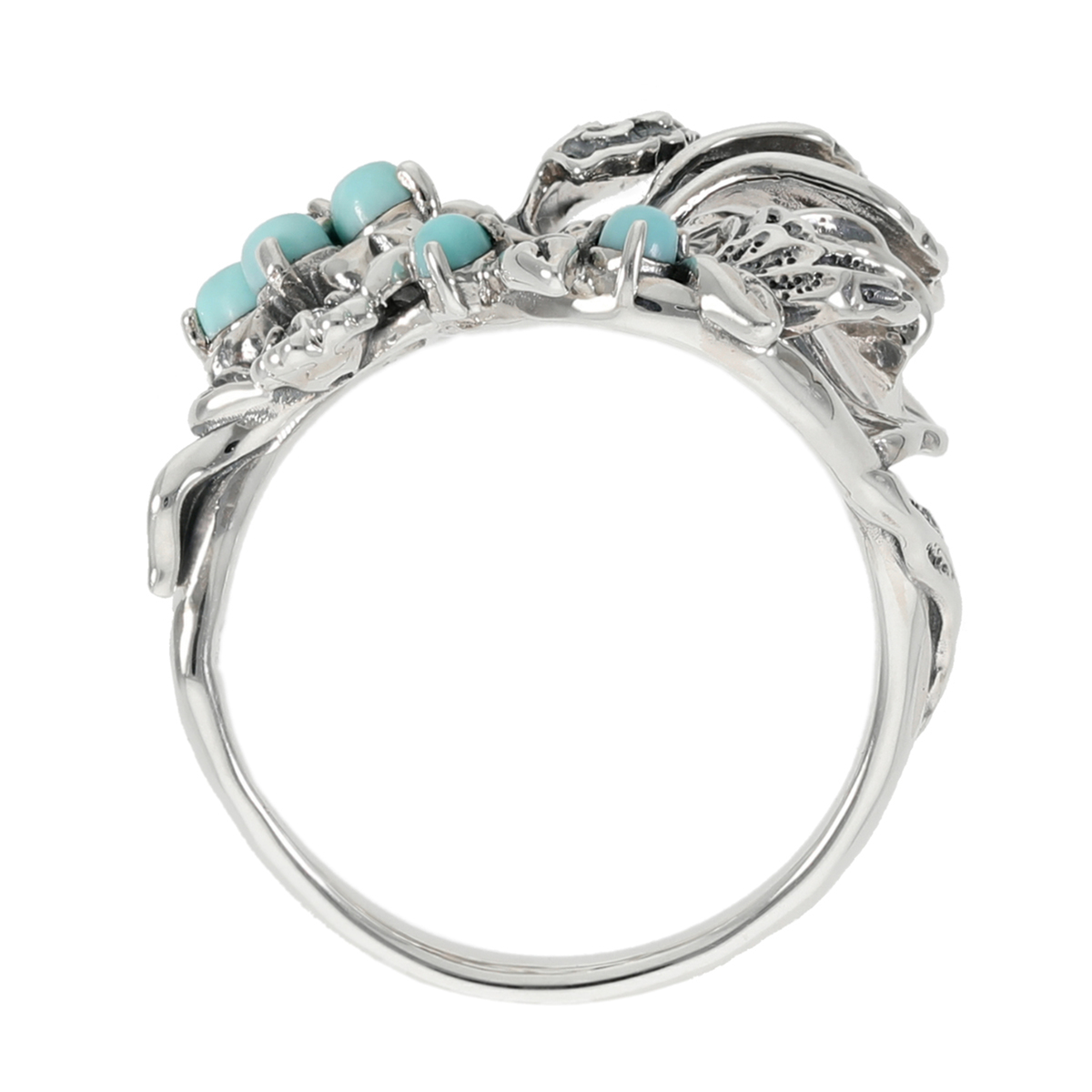 素材: [トルコ石] ラウンドシェイプ・カボションカット 爪留め/接着 7石 [ホワイトトパーズ] ラウンドカット 爪留め/接着 2石 [地金] シルバー925 [仕上げ] アンティーク仕上げ 最大幅(約) 17.0mm 最小幅(約) 1.5mm 総重量(約) 3.0g ■素材の大きさ・形・色合い、製品のサイズは1点1点多少異なります ■専用ケース付 【タイ製】