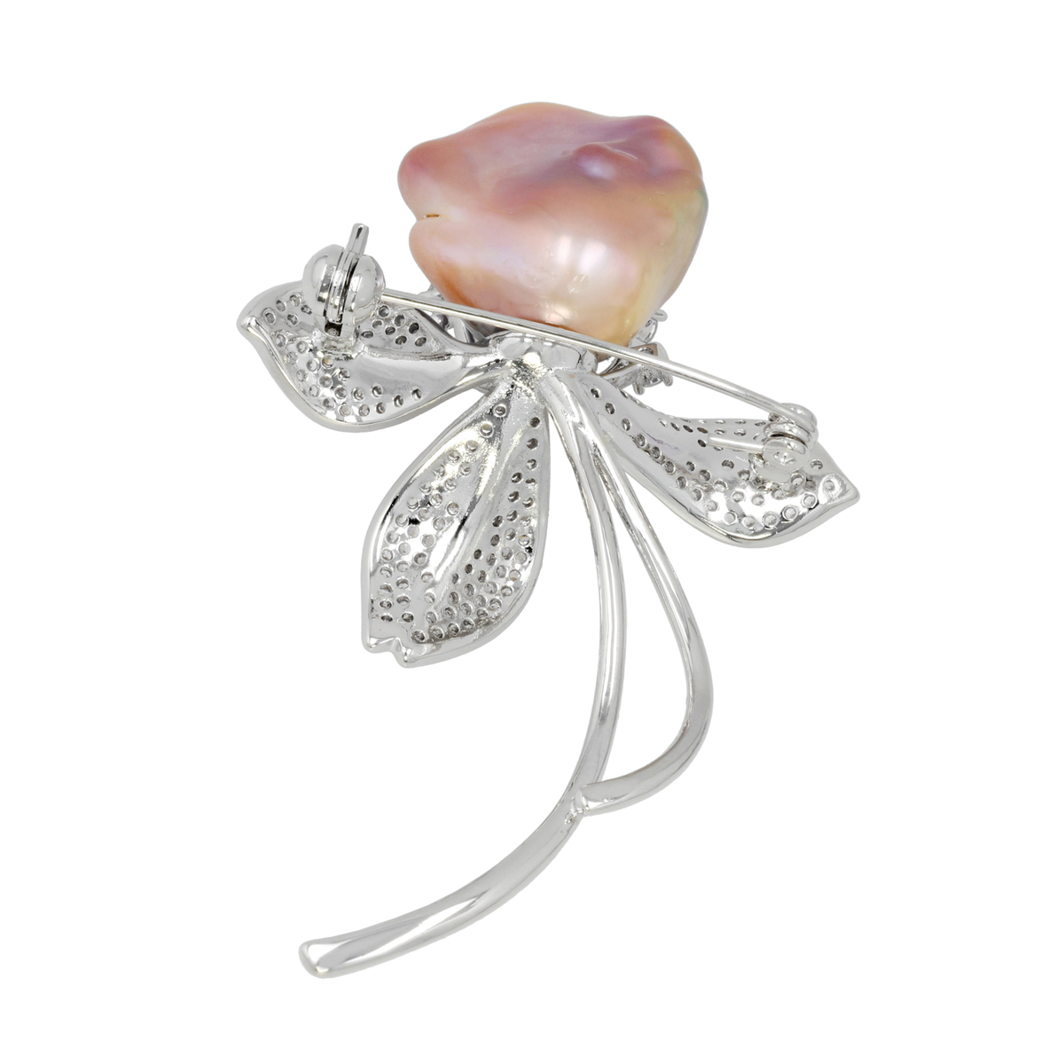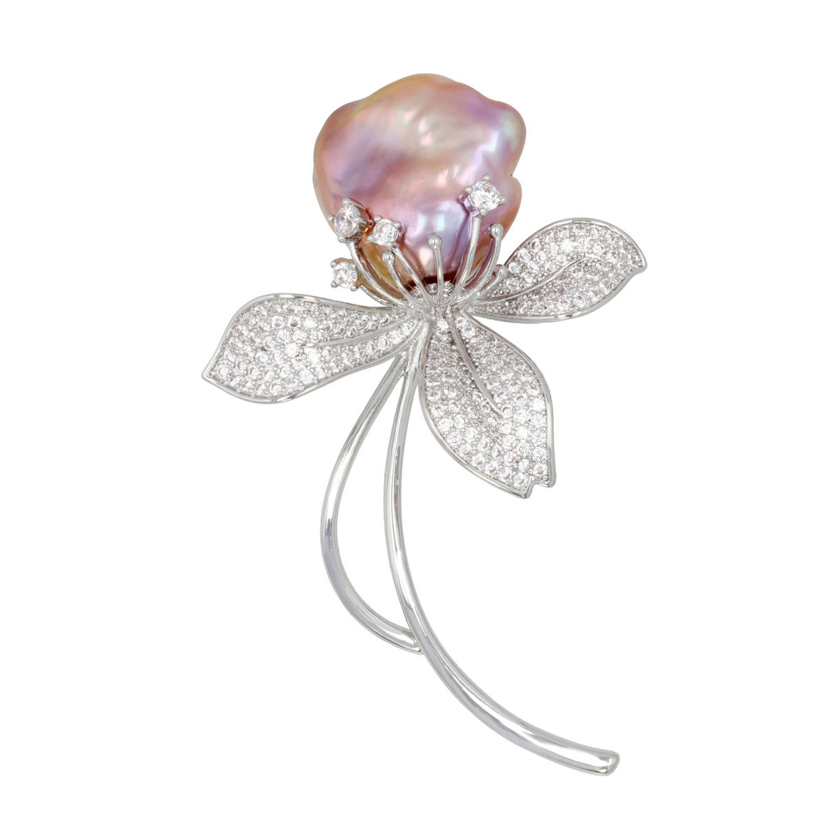 バロックシェイプのオーロラリップル真珠を花に見立てたブローチです。土台には葉を思わせるモチーフを配し、キュービックジルコニアの細かな輝きで真珠の色合いを引き立てています