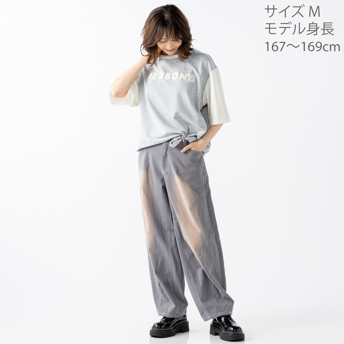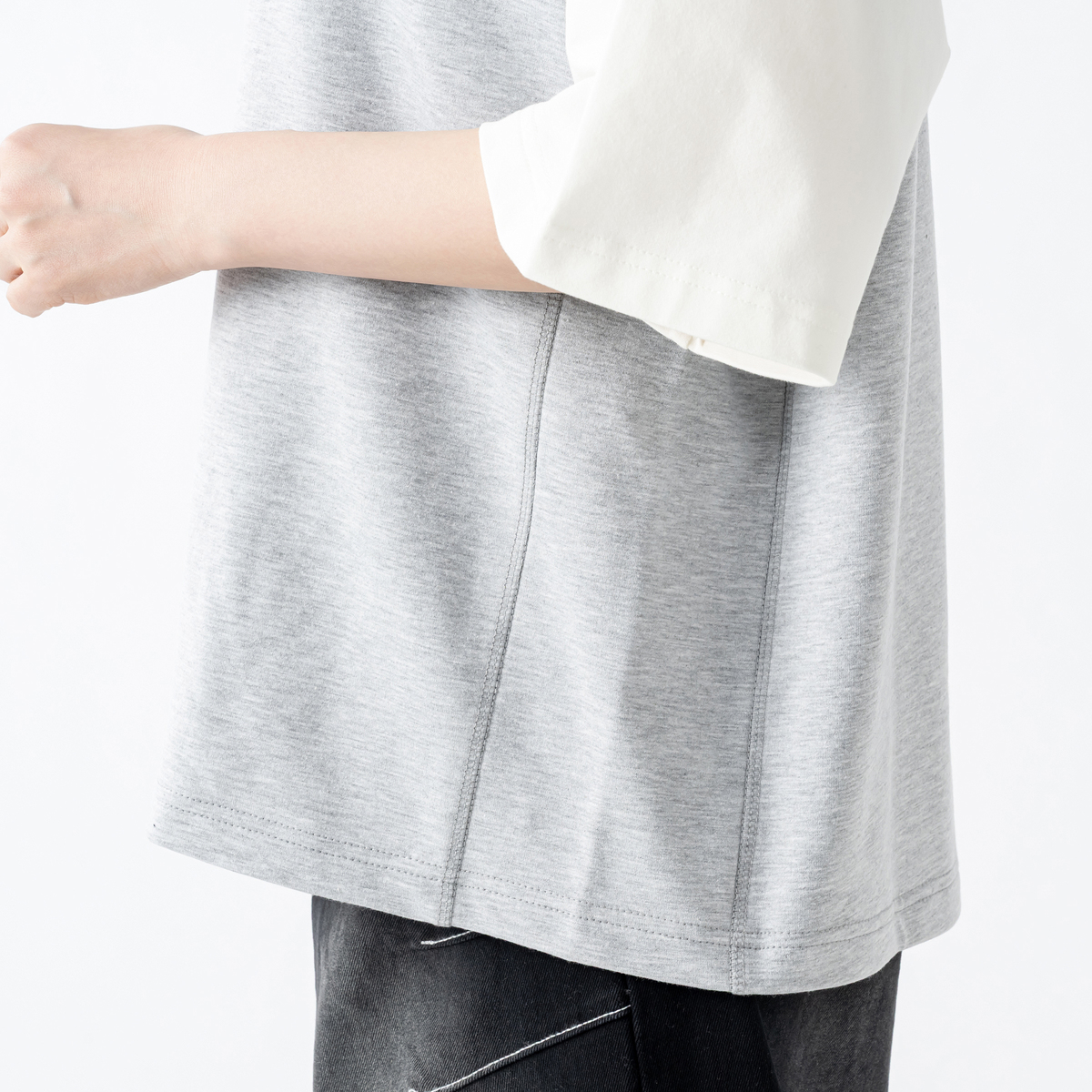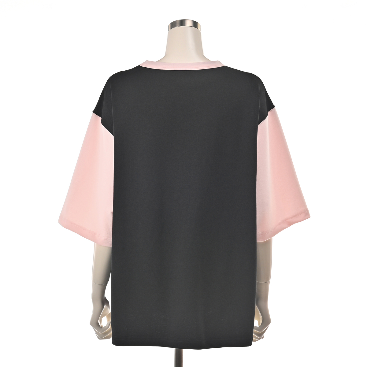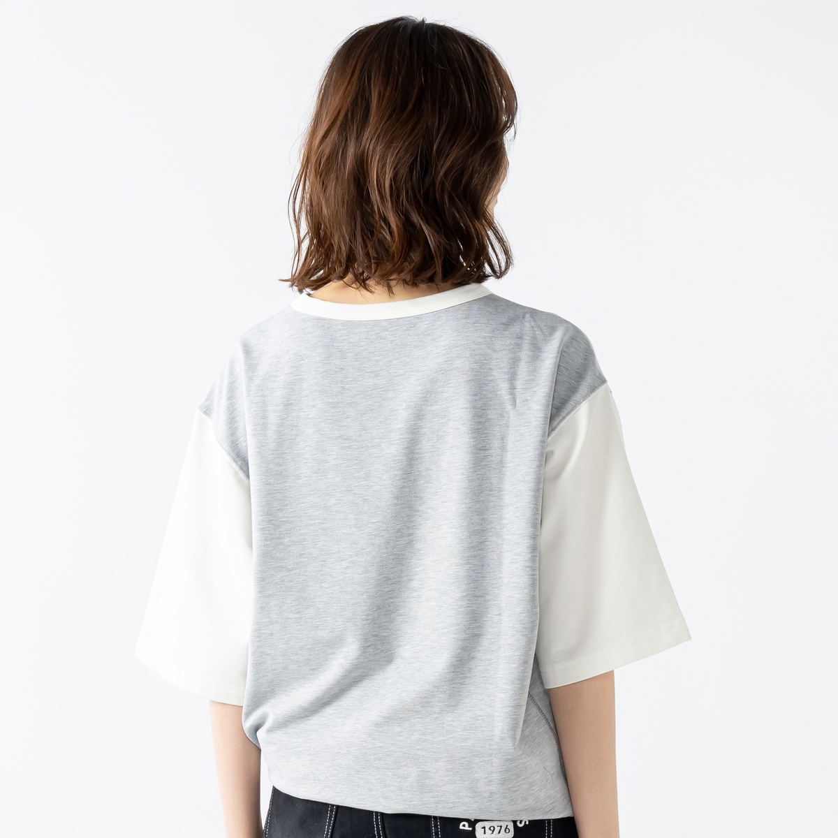 ゆったりしたサイズ感のバイカラーTシャツ。胸元の丸みのあるロゴフェルトワッペンがコーデのポイントになってくれます