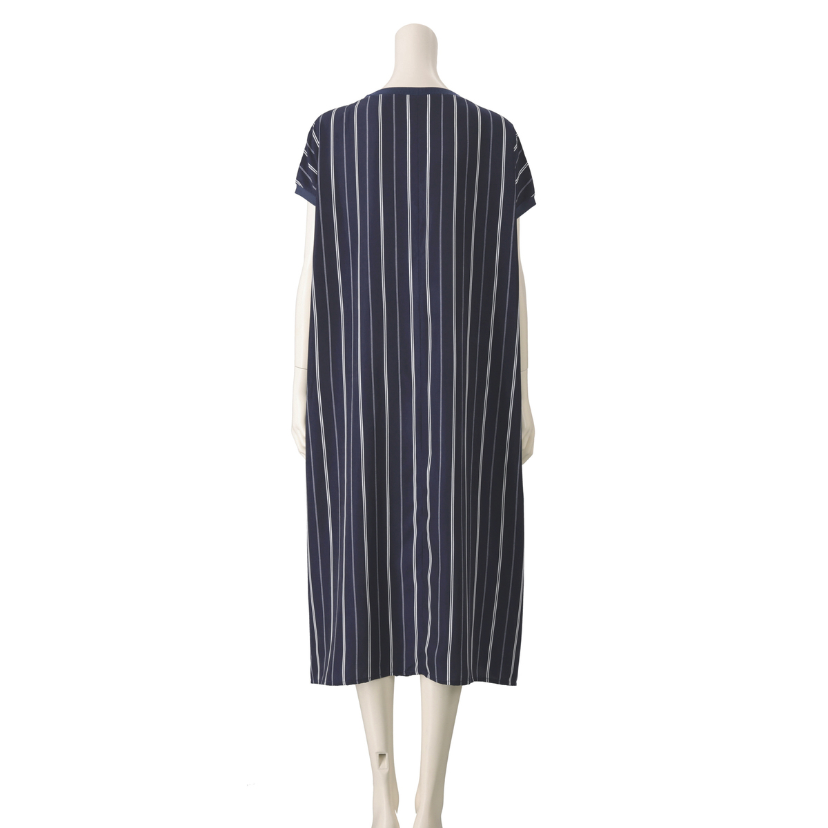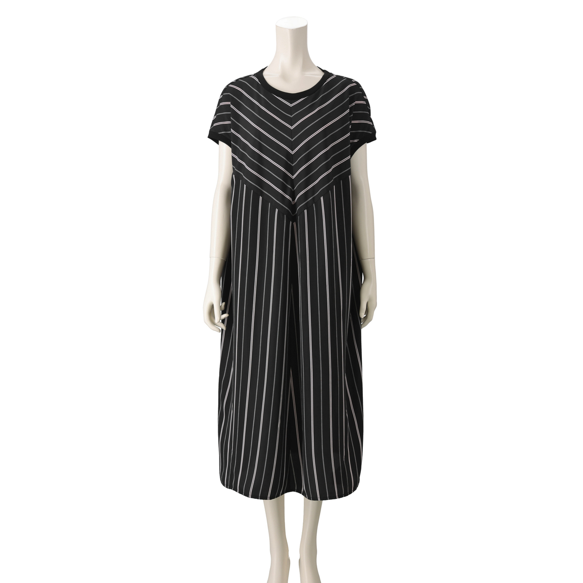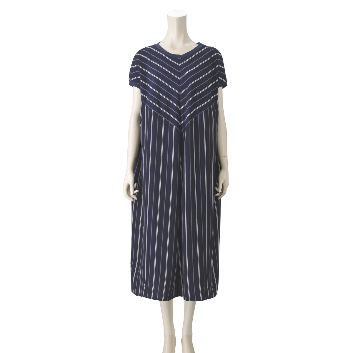 ストライプの向きを切替で変え、視線を縦に導くデザインワンピース。前身頃はV字切替でラインを意識し、裾に向かって逆V字を入れることでスッキリと見える構成に。後ろ身頃は縦柄を生かし、衿と袖口のリブが程よいアクセントになります。ゆとりを持たせ、身体のラインを拾いにくく仕立てています