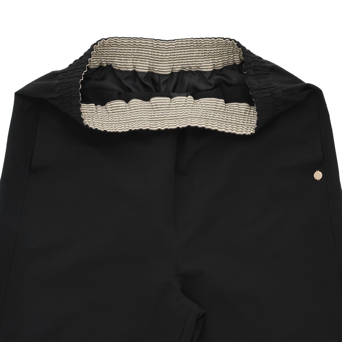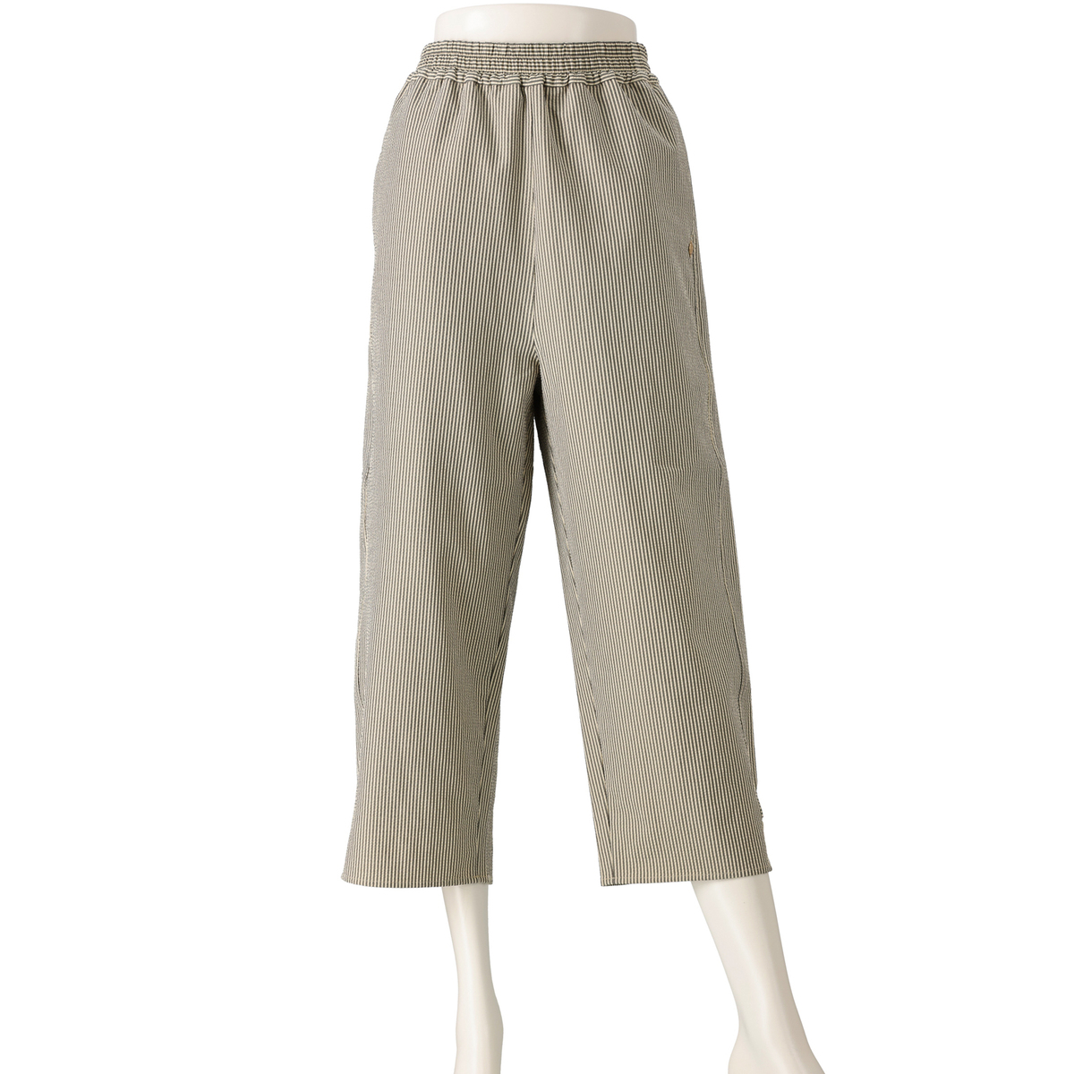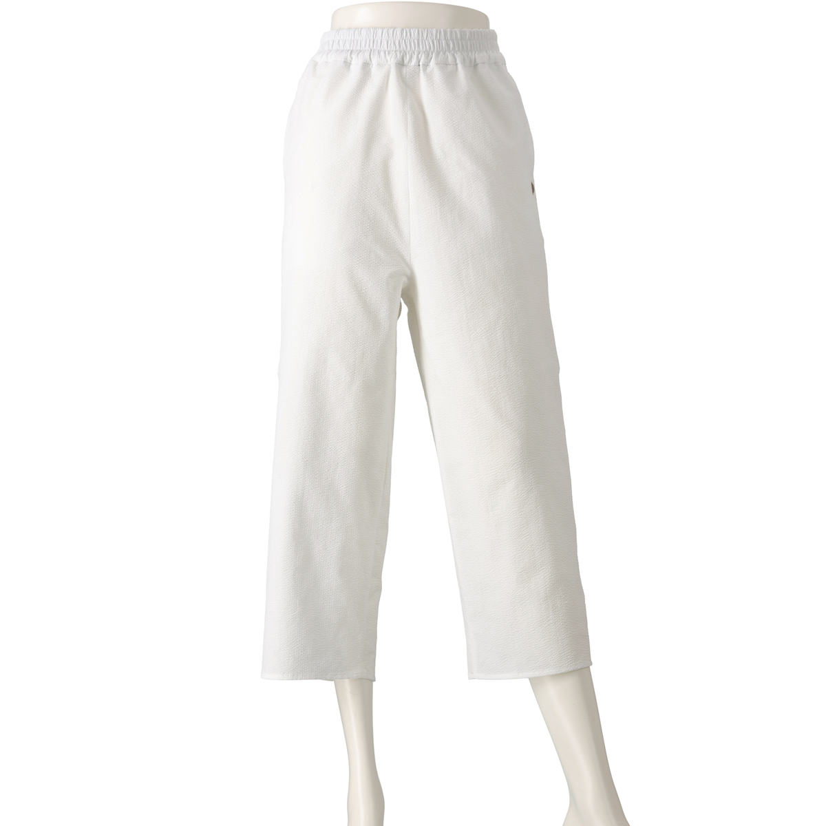 細かいポコポコした表面感が涼しげなサッカー生地を使ったパンツ。凹凸で肌に触れる面が少なく、暑い日もさらりと快適に過ごしやすい素材です。すっきり見えるクロップド丈で、暑い季節も心地よく動けます