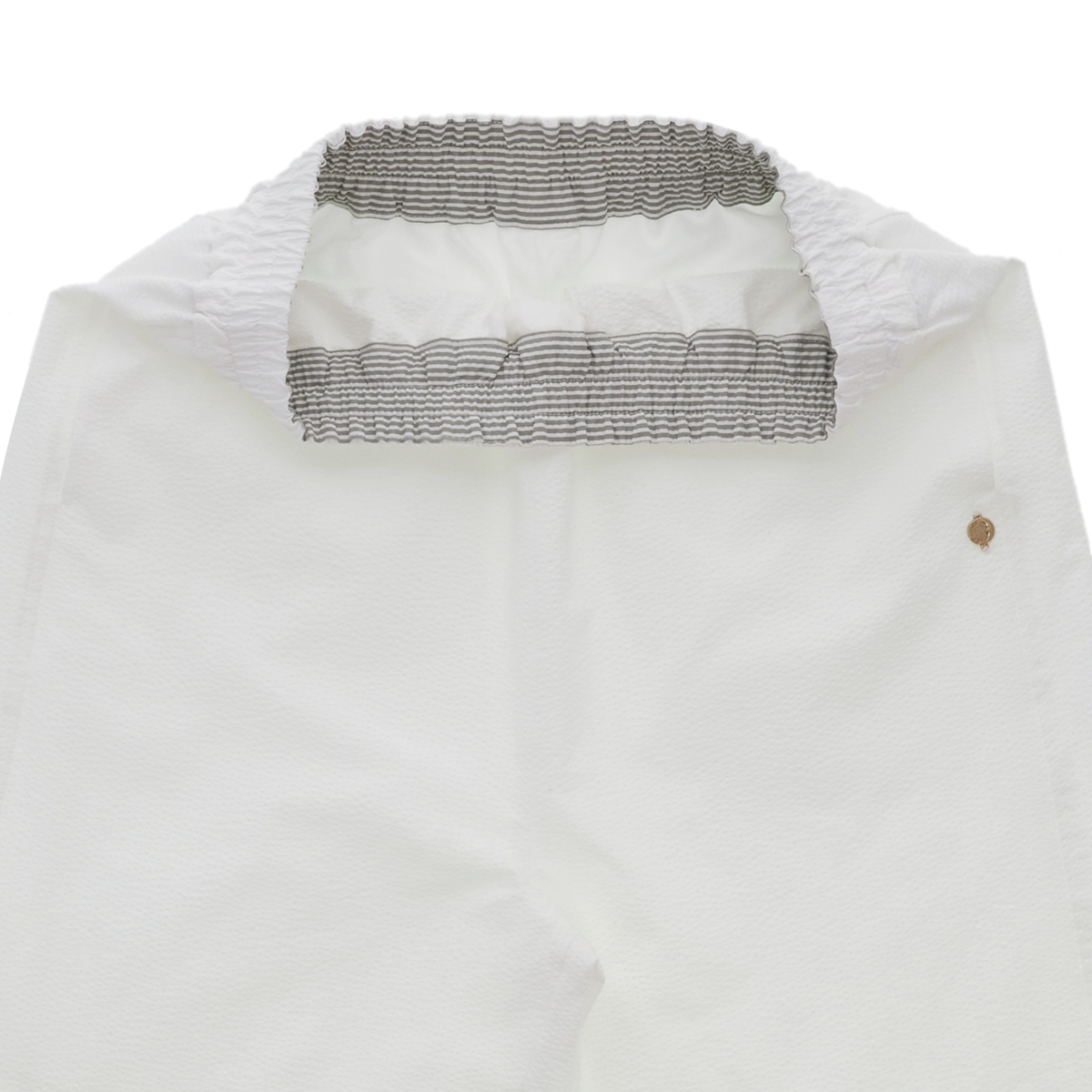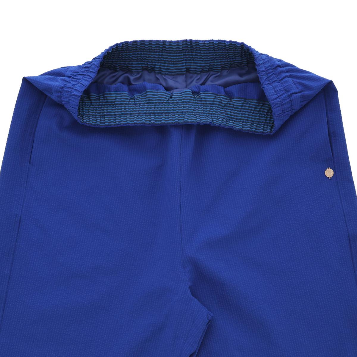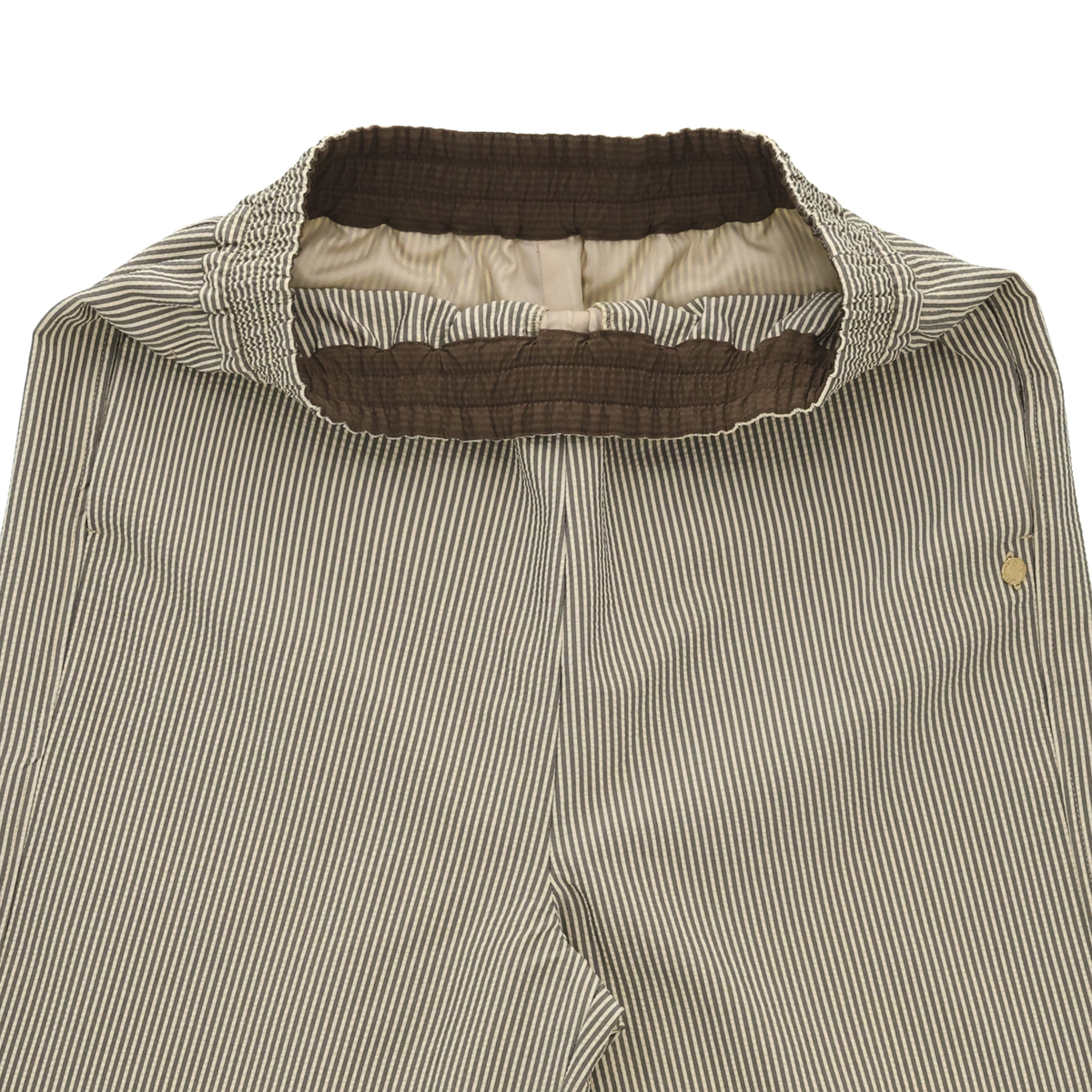 細かいポコポコした表面感が涼しげなサッカー生地を使ったパンツ。凹凸で肌に触れる面が少なく、暑い日もさらりと快適に過ごしやすい素材です。すっきり見えるクロップド丈で、暑い季節も心地よく動けます