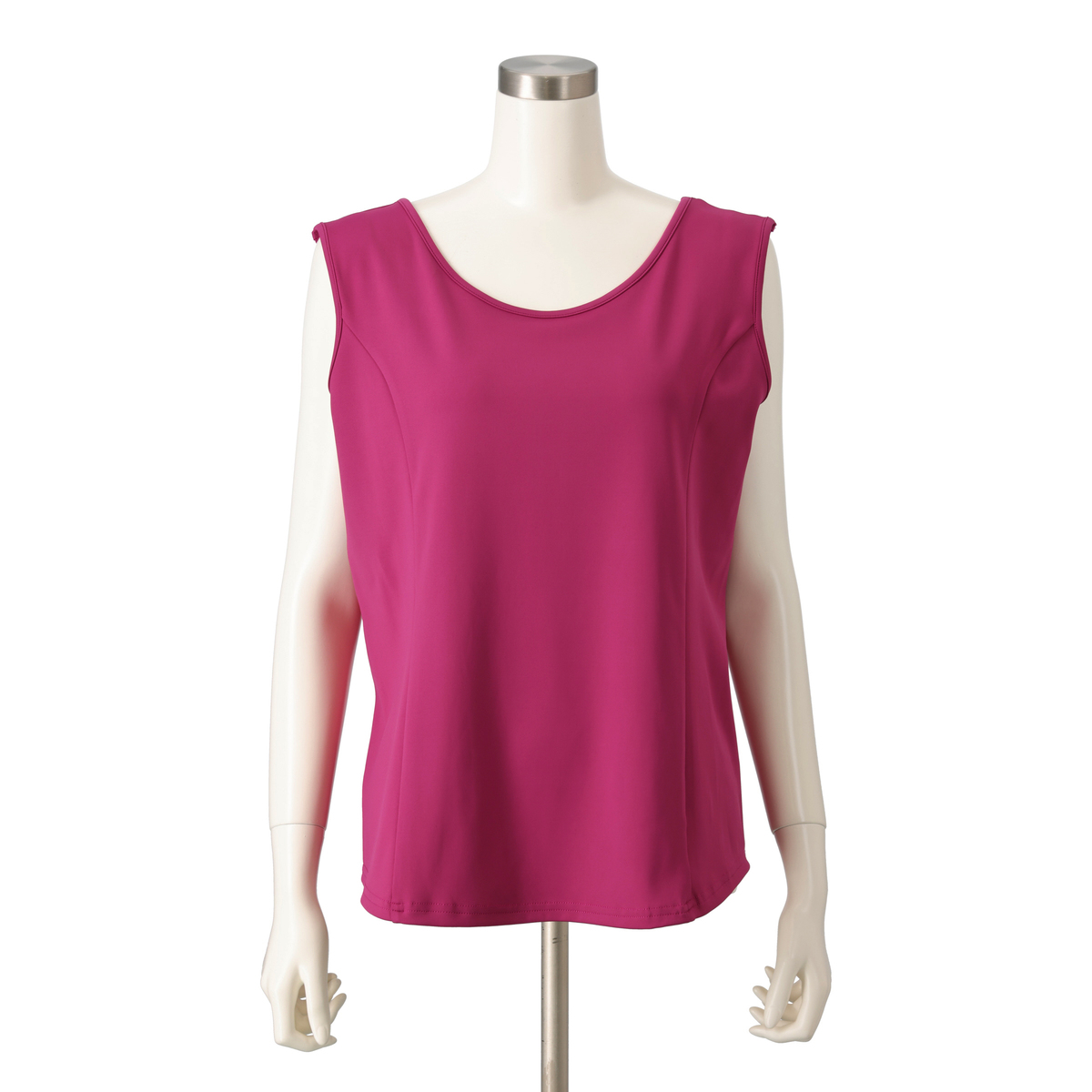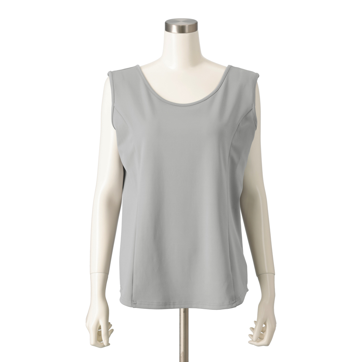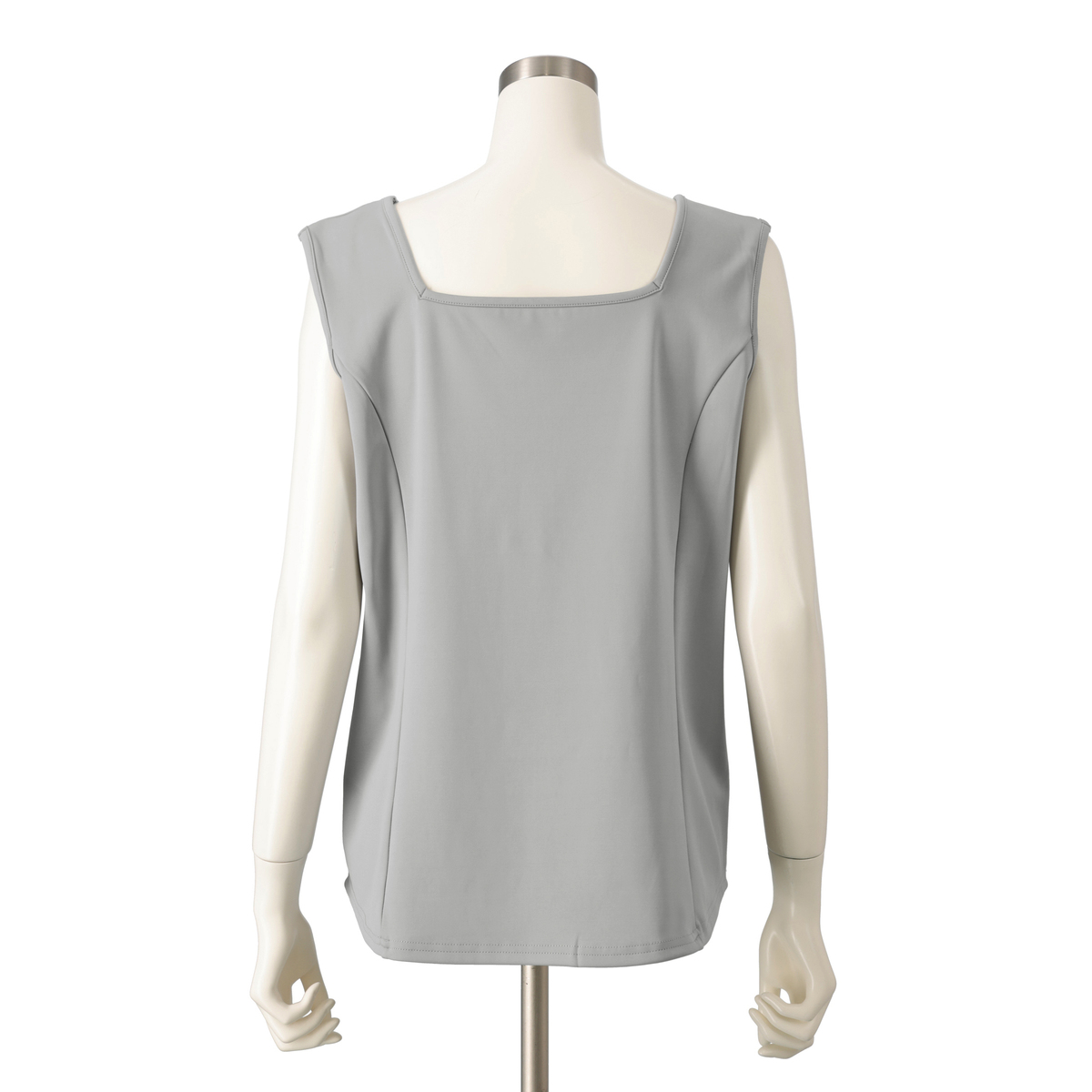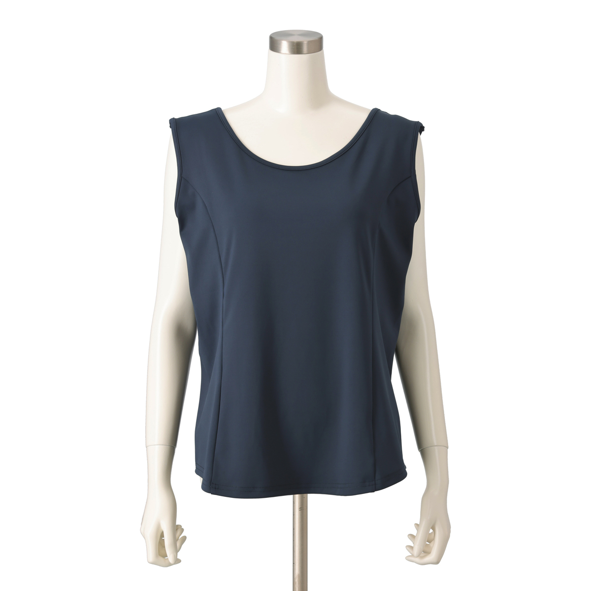 シアーな服が増える暑い季節のインナーとして重宝するタンクトップ。前はクルーネック、後ろはスクエアーネックデザインの2WAY仕様。ポリエステル80%、ポリウレタン20%のよく伸びるベア天生地です