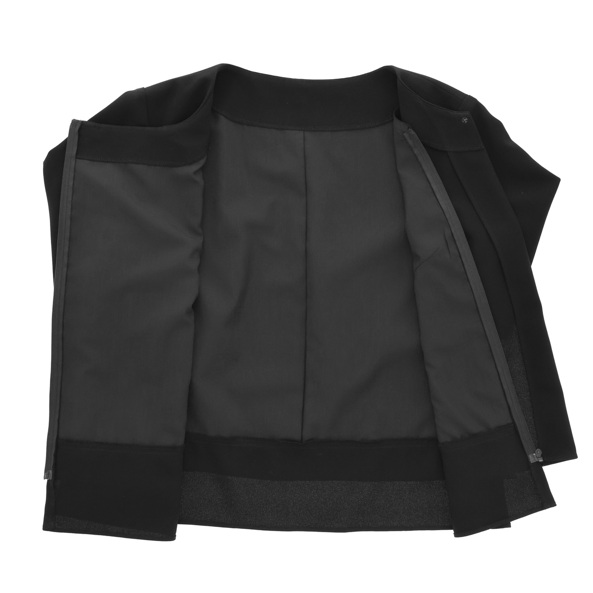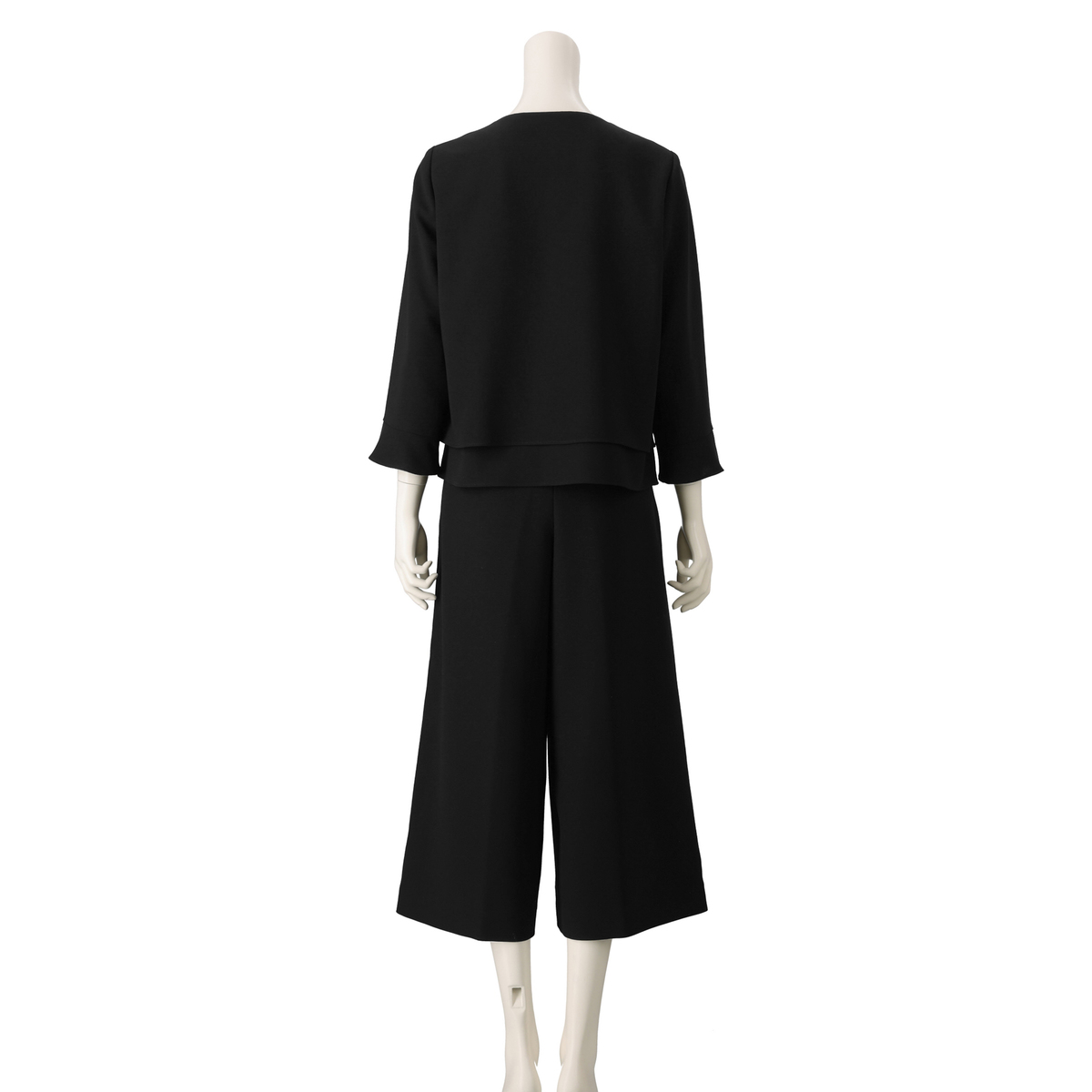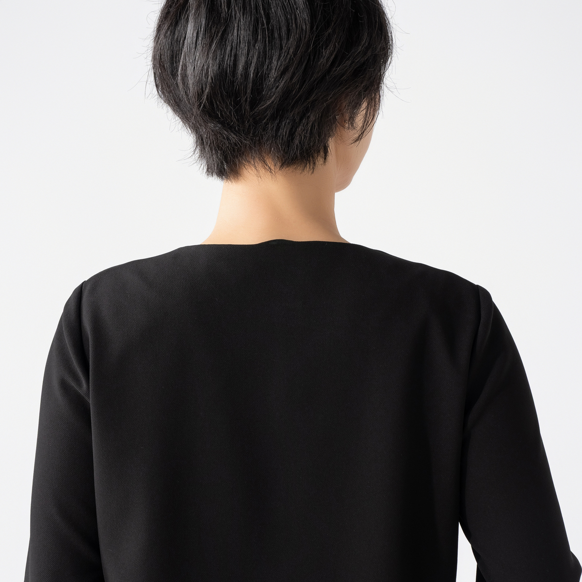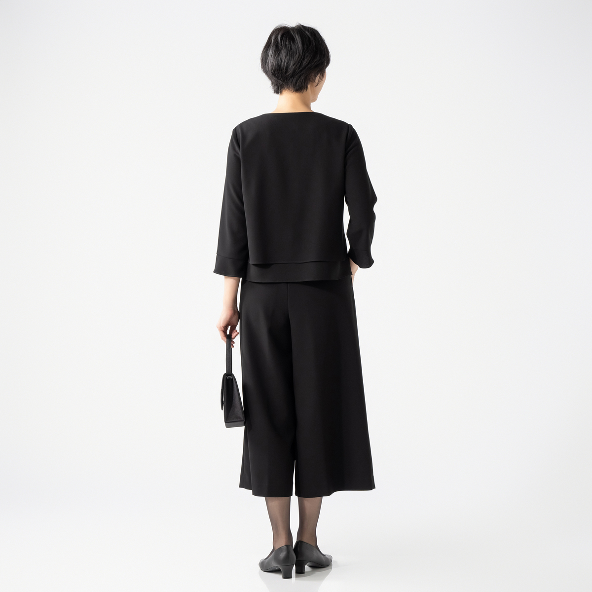ブラウスには肌離れの良いさらりとした裏地を使用。前開きファスナー仕様でメイクや髪も崩れにくく、着脱も簡単です。パンツの後ろウエストはゴム入りで窮屈さを抑えた仕様。便利な両脇ポケットやベルト通しも付いています