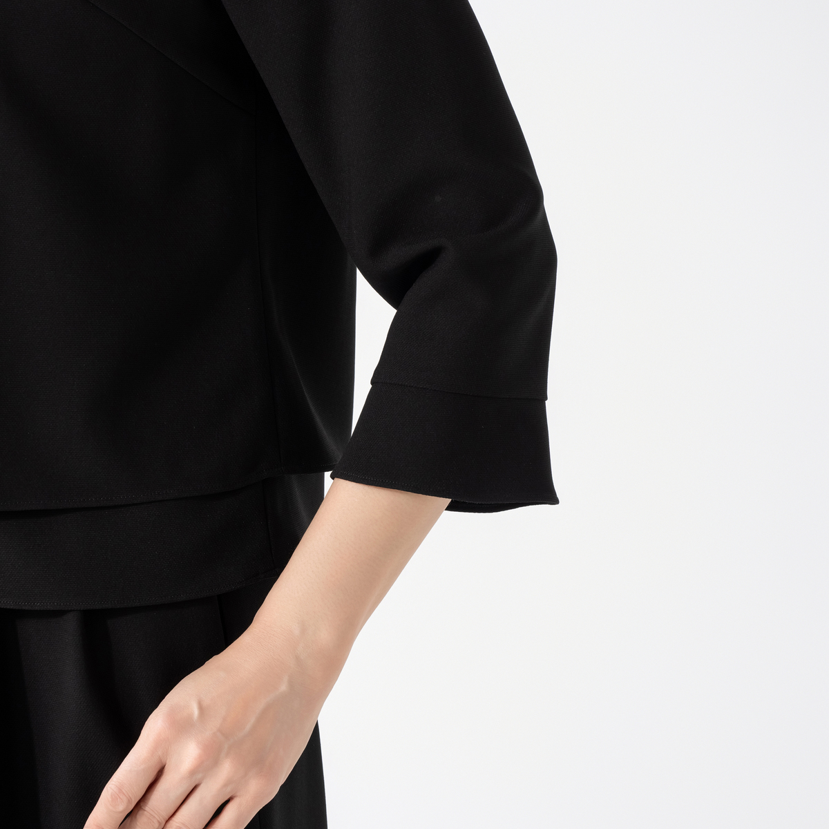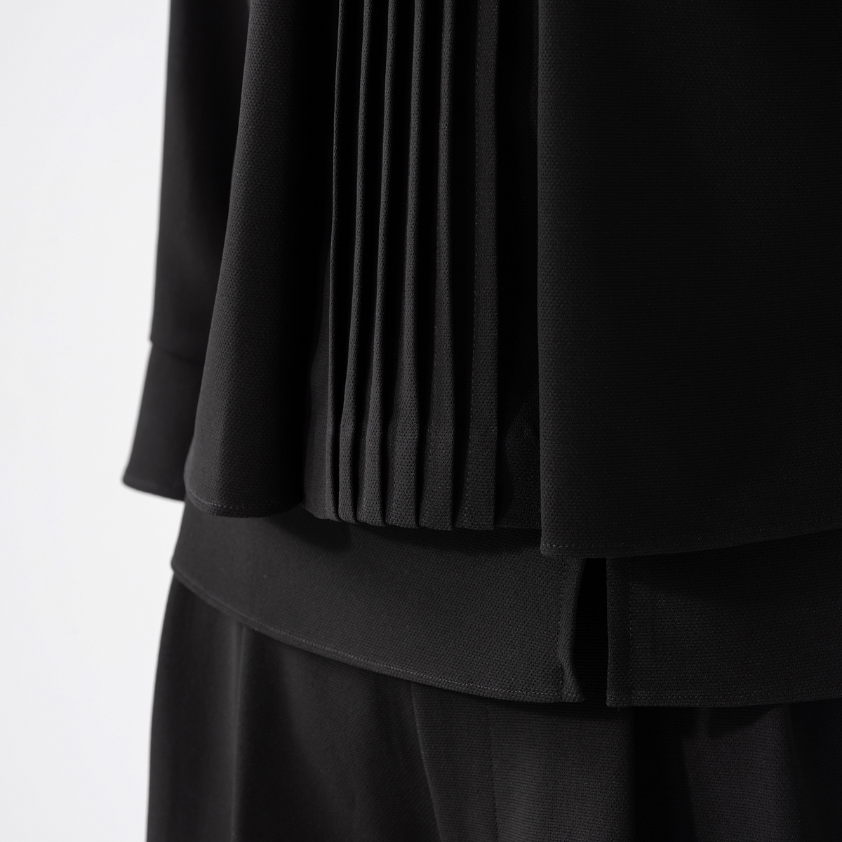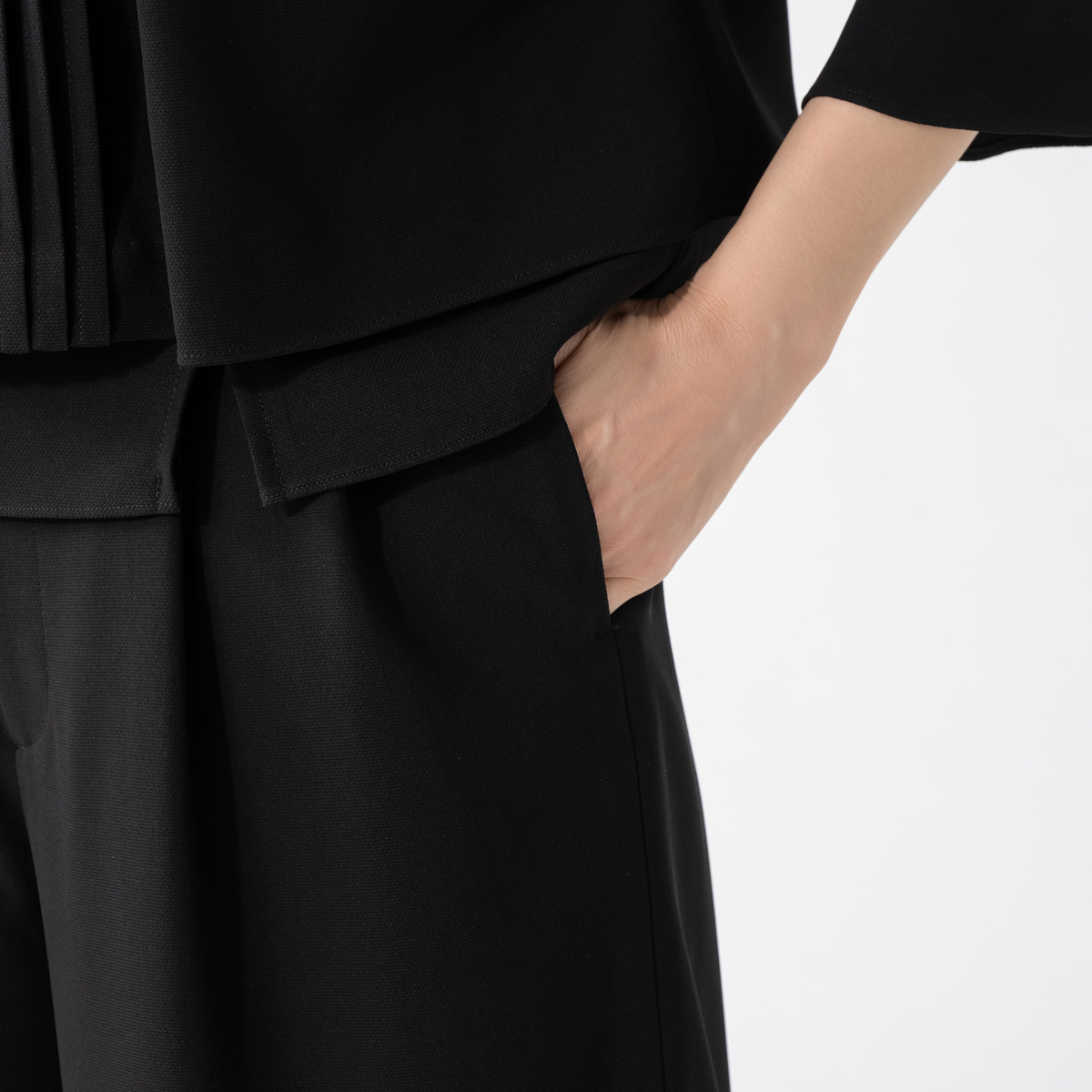 ノーカラーブラウスとワイドパンツのセット。ブラウスのフロントプリーツが縦ラインを強調し、すっきりとした印象に。裾のレイヤードデザインがお腹まわりをカバーし、袖口のペプラム切り替えで腕をほっそり見せてくれます。パンツは足さばきがスムーズなワイドシルエットで、体型をおしゃれにカバーしながら、こなれ感を演出します