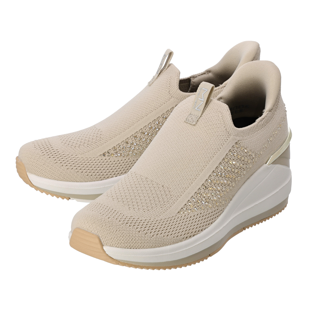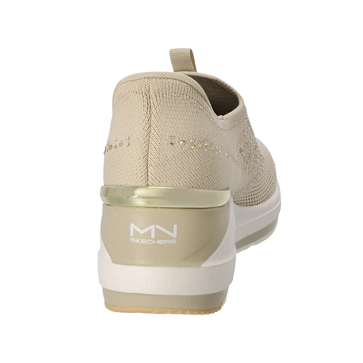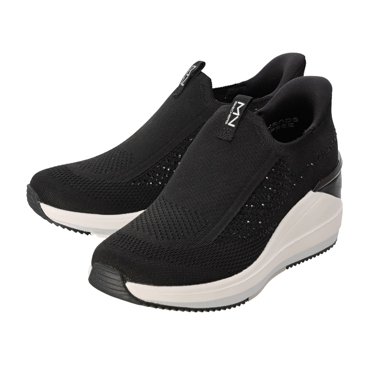 踵部分にスケッチャーズハンズフリースリップインズ機能を搭載。手を使わず、かがまずにハンズフリーで着脱可能です。靴ベラのようなヒールピローの形状によりスムーズに足入れでき、脱げにくく、安定性を発揮。踵はゴムとプラスチックの中間のような素材で、適度な硬さと柔軟性を持ち、踵がつぶれにくいです