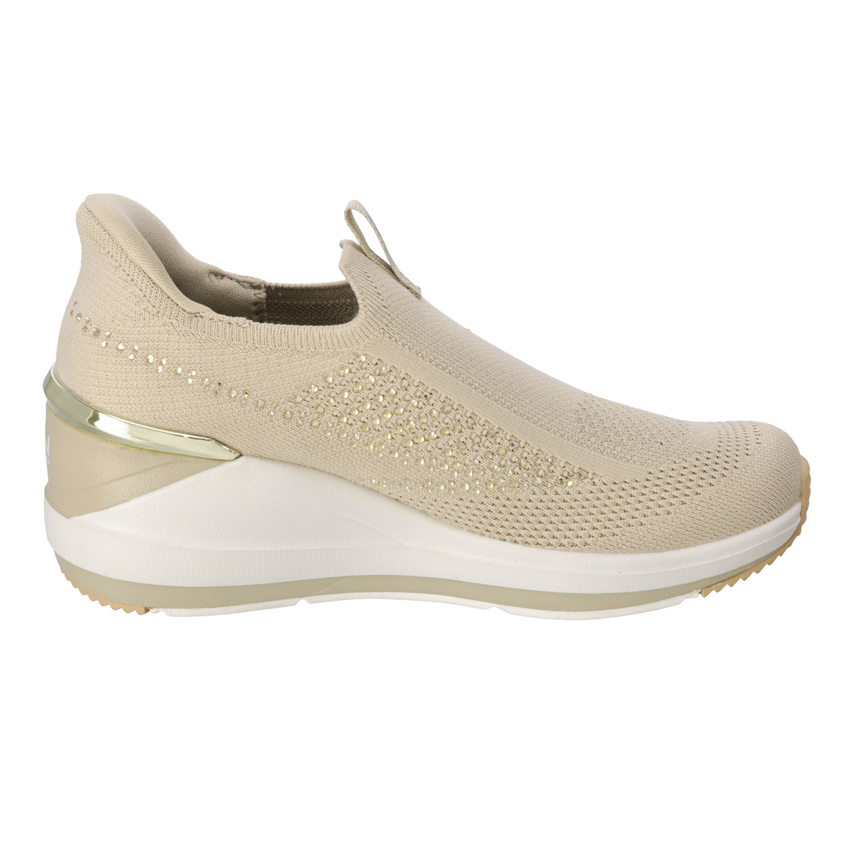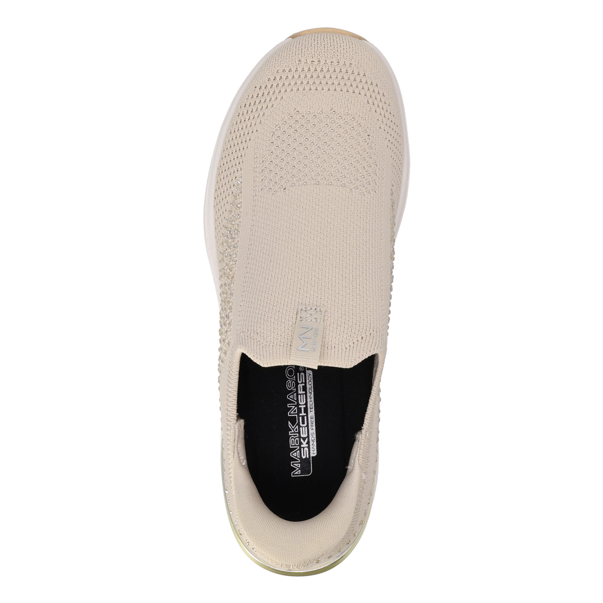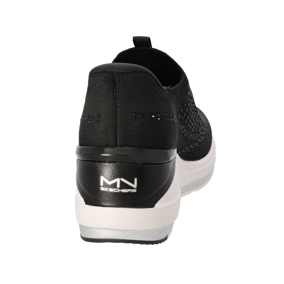 踵部分にスケッチャーズハンズフリースリップインズ機能を搭載。手を使わず、かがまずにハンズフリーで着脱可能です。靴ベラのようなヒールピローの形状によりスムーズに足入れでき、脱げにくく、安定性を発揮。踵はゴムとプラスチックの中間のような素材で、適度な硬さと柔軟性を持ち、踵がつぶれにくいです