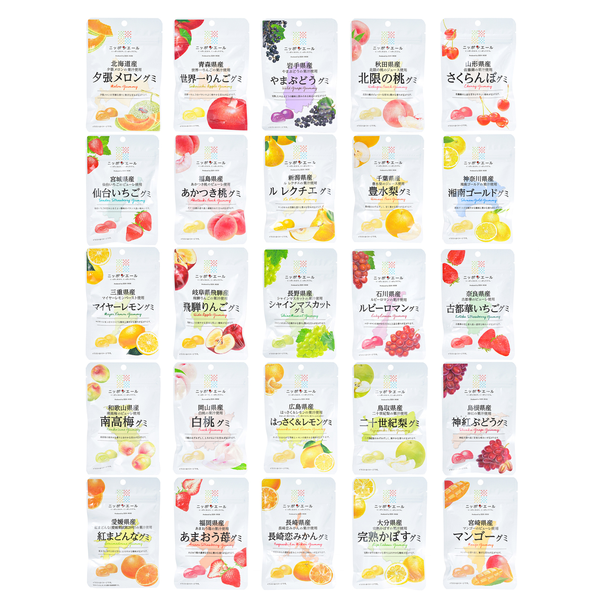 ニッポンエールグミの中でも人気の25種を詰め合わせた特別セット。柑橘や桃、りんご、ぶどうなど、多彩な味を揃えました。ご家族や友人とシェアしながら、旅行気分で各地の旬を味わうひとときを演出します