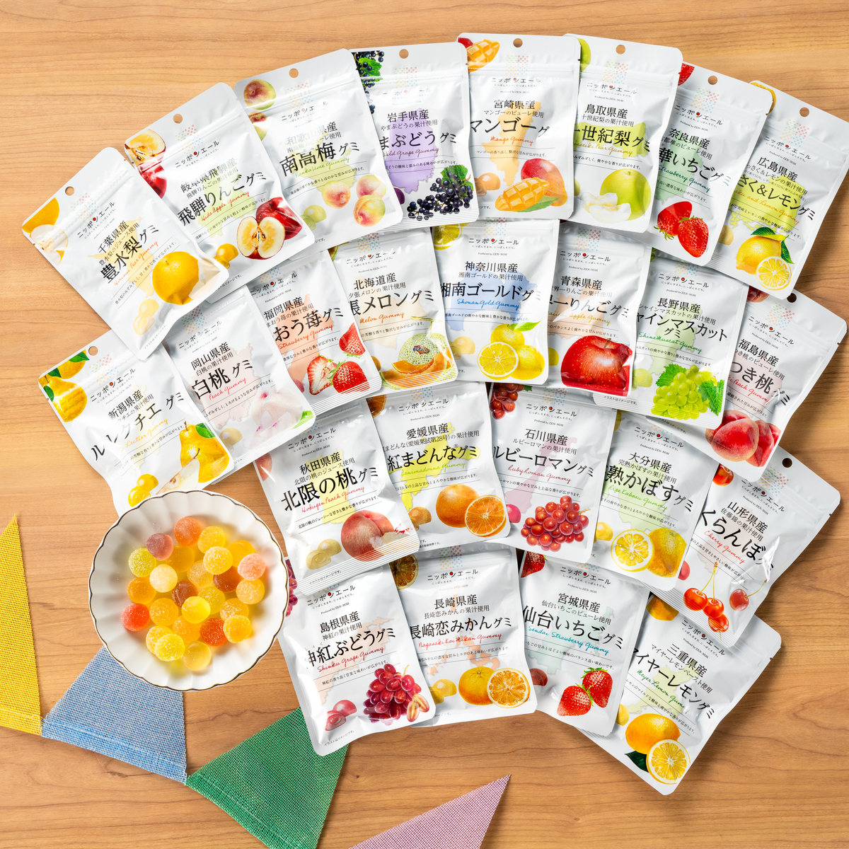 ニッポンエールグミの中でも人気の25種を詰め合わせた特別セット。柑橘や桃、りんご、ぶどうなど、多彩な味を揃えました。ご家族や友人とシェアしながら、旅行気分で各地の旬を味わうひとときを演出します