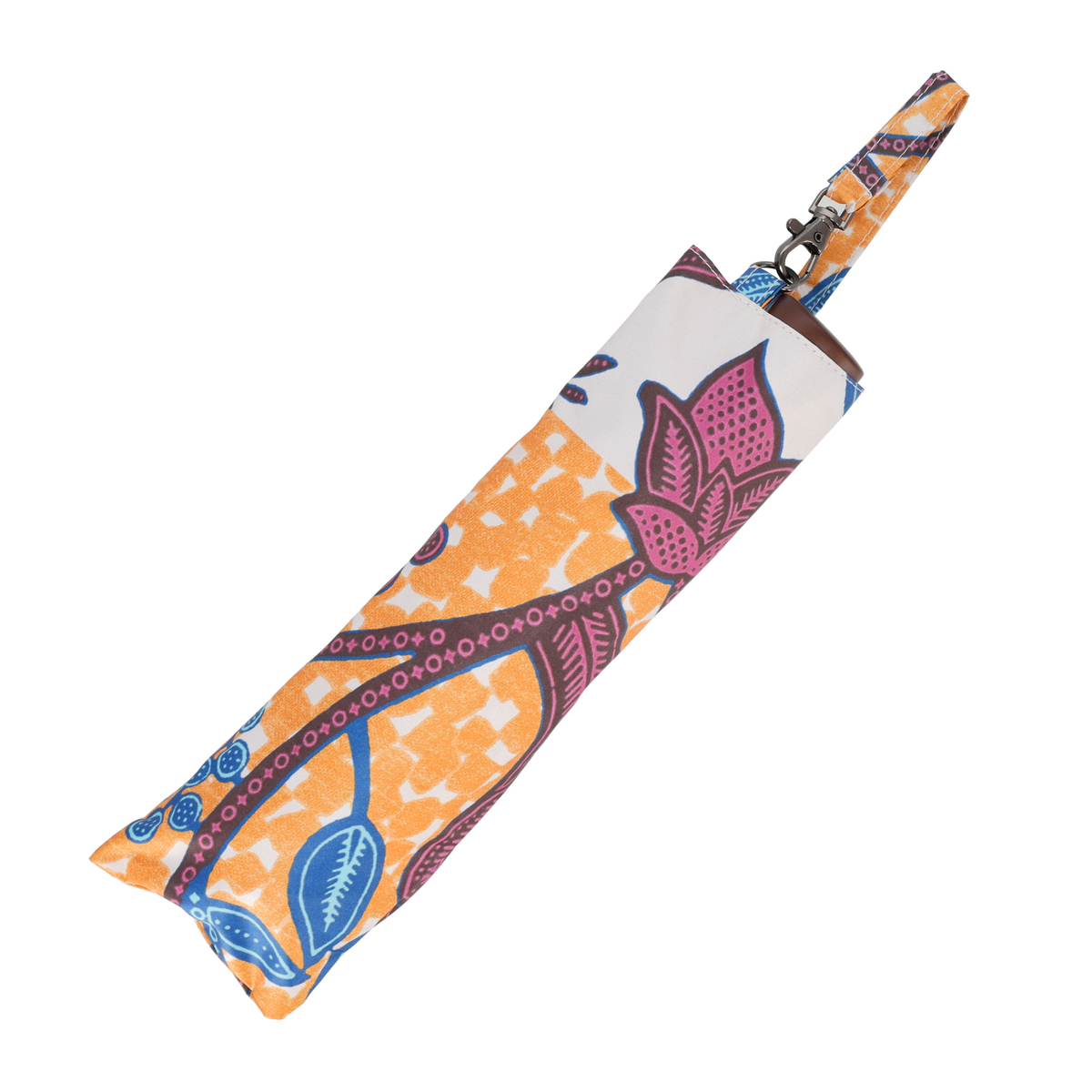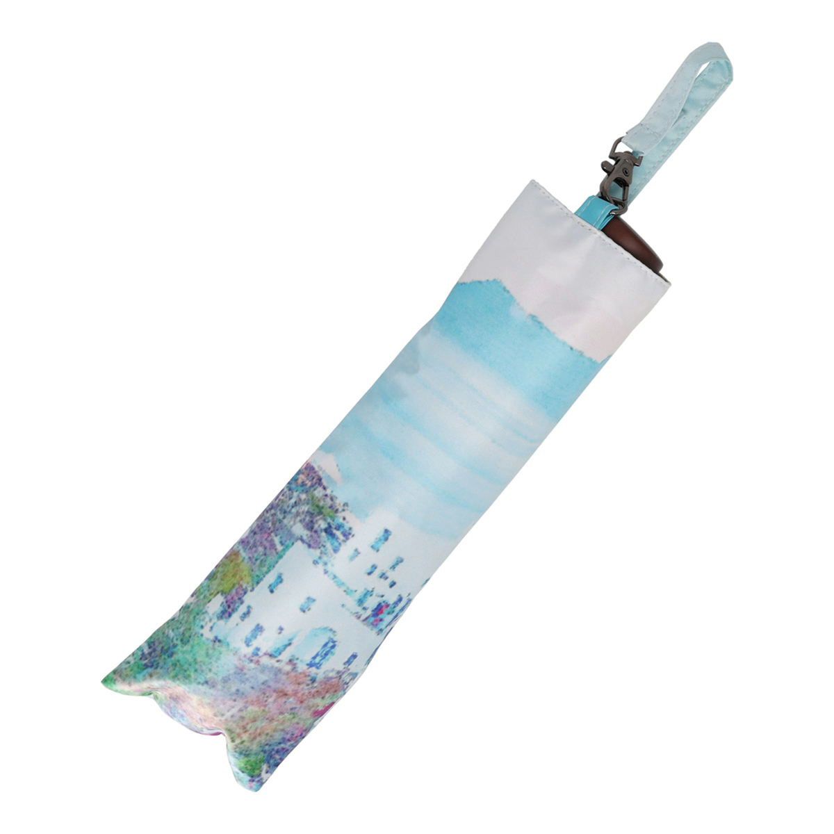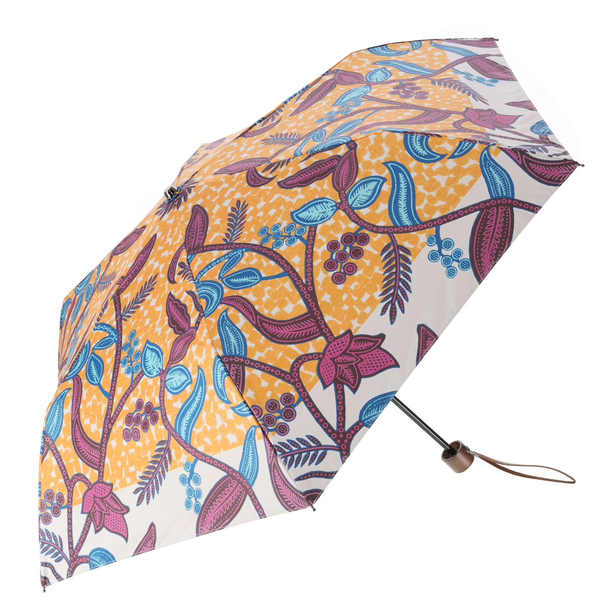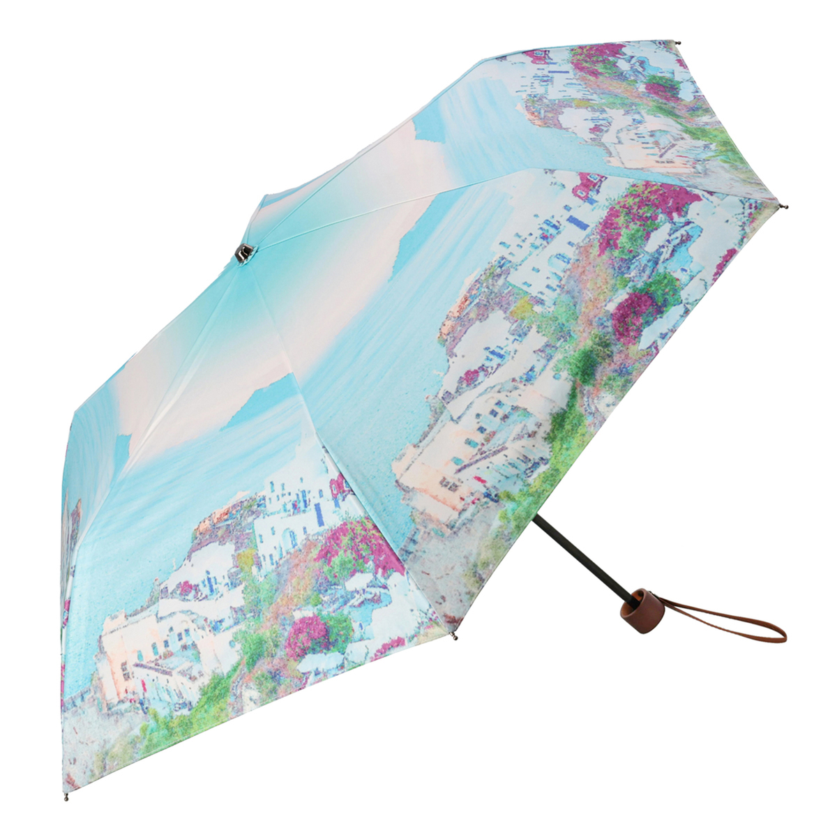 晴れの日も雨の日も使える晴雨兼用傘。開いた時の形状に丸みがある可愛い形で、リゾート感のある柄からは高級感を感じます。手動式の手開きタイプで、傘袋は間口の広いタイプなので入れやすいです
