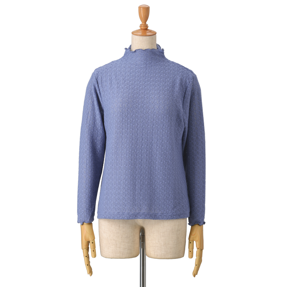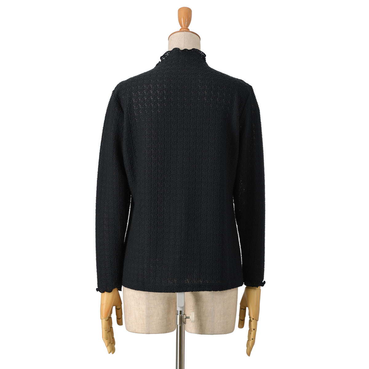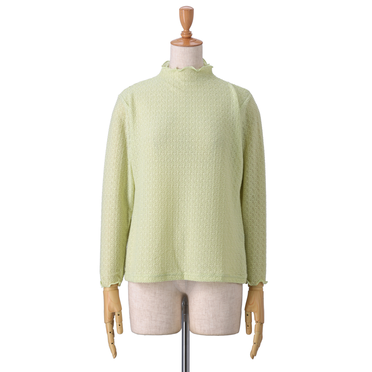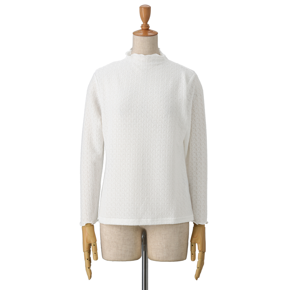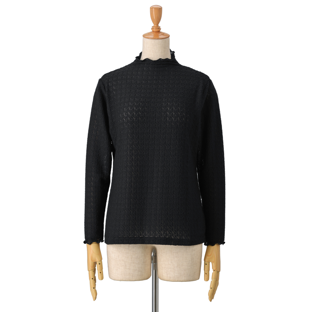 レース調ジャガード編みのプルオーバーです。軽やかな透け感で、インナーとの組合せを楽しめ、装いにさりげない華やかさを添えます