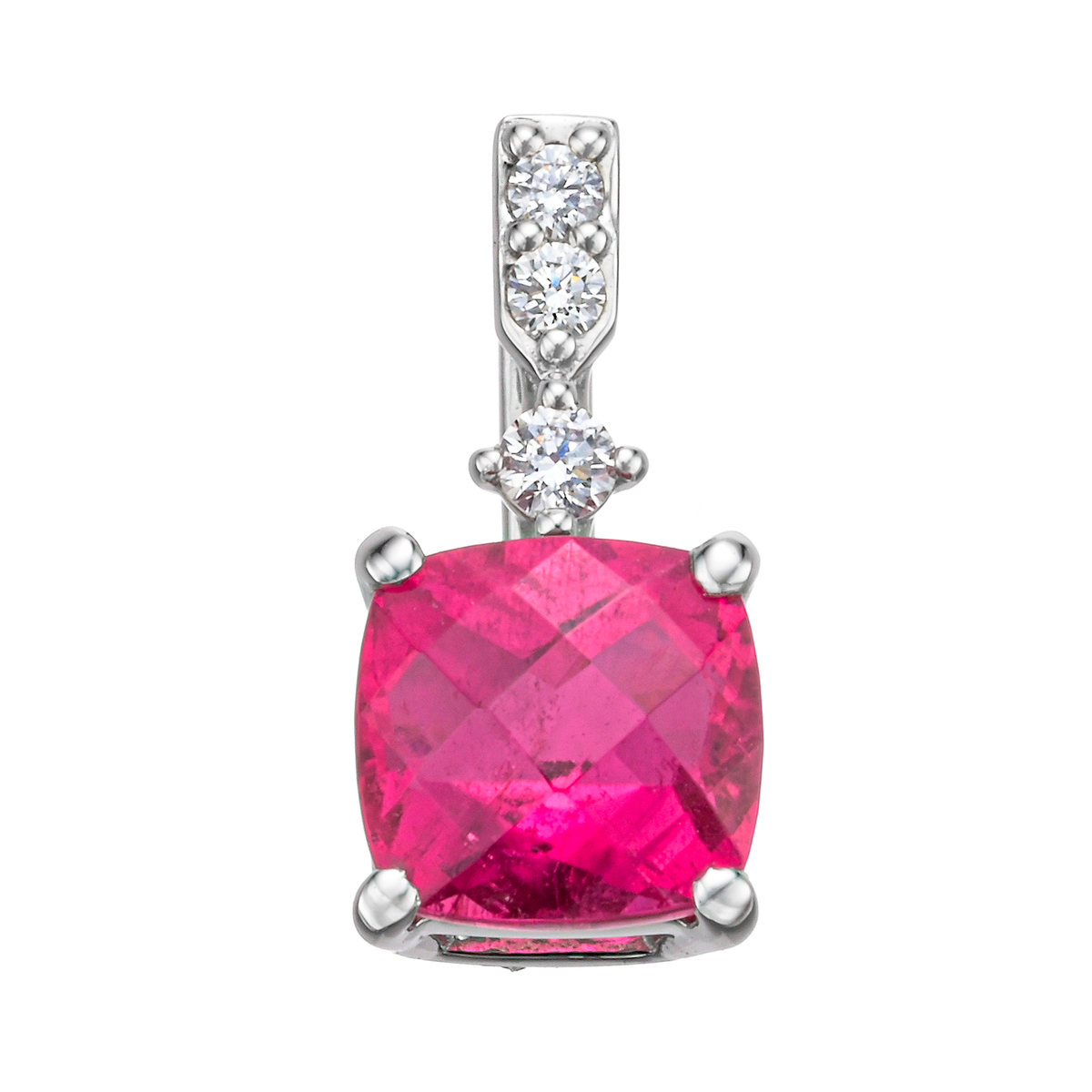 胸元で輝くルベライトの鮮烈なラズベリーピンク。特別感のある、クッションシェイプでチェッカーカットのペンダントヘッドです