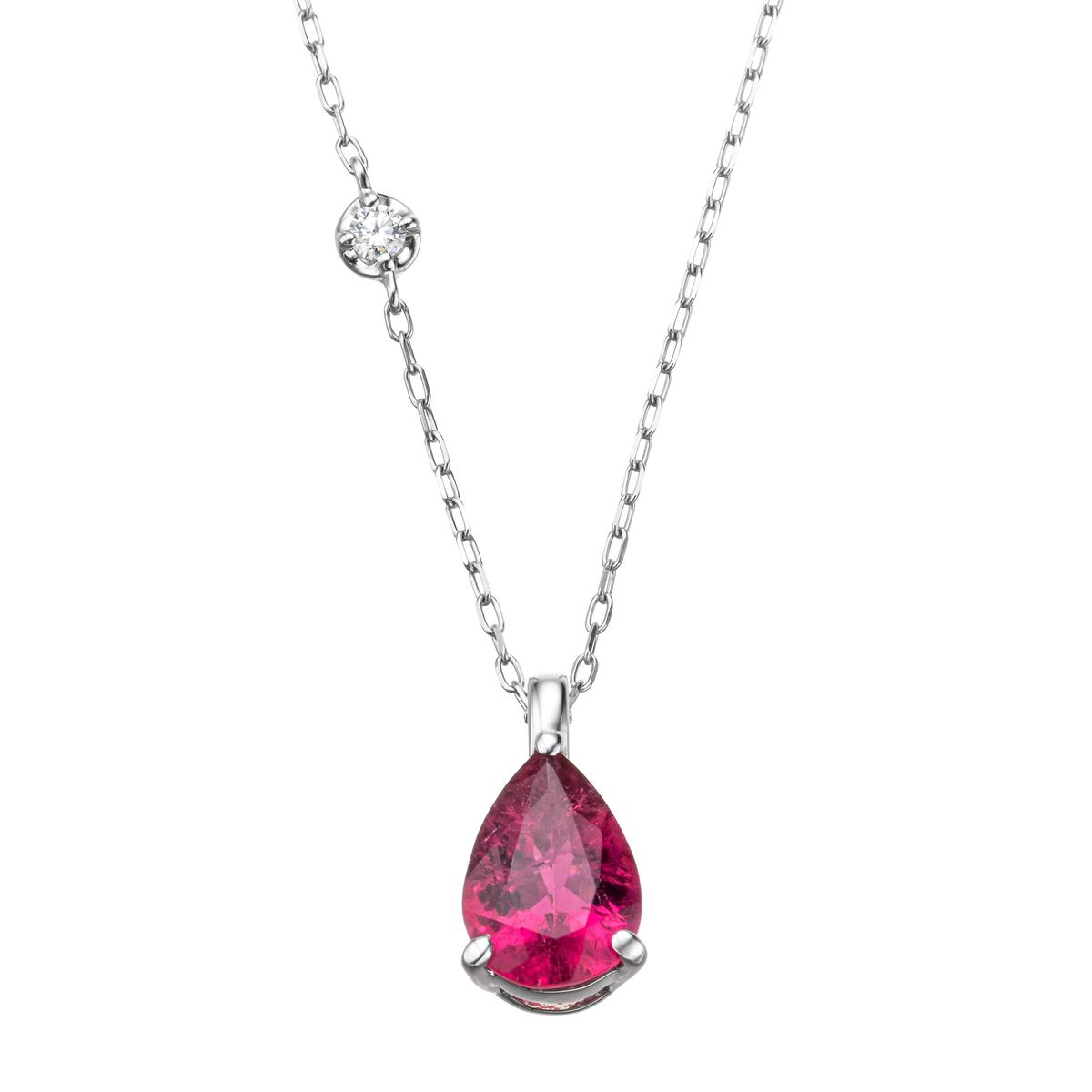 ルベライトの豊かな色合いで魅力的に。チェーンネックレスには、ダイヤモンドの煌めくワンポイント付きです