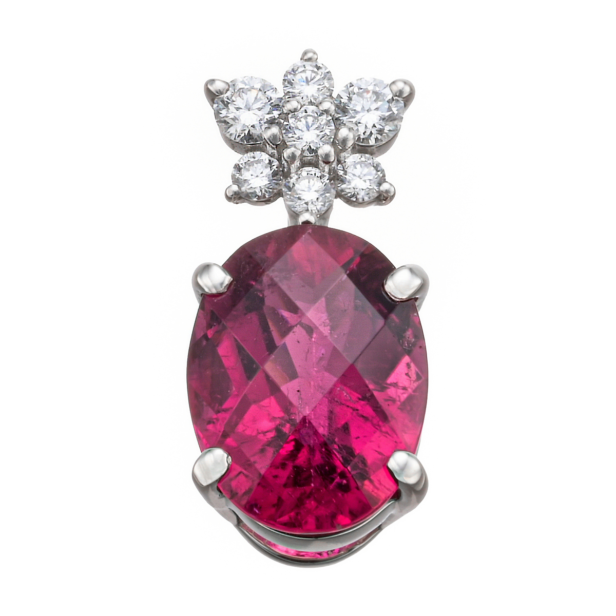 濃厚なラズベリーピンクが美しいルベライト。カラーストーンの王道のオーバルシェイプ、特別感のあるチェッカーカットが洗練された雰囲気で胸元を飾ります