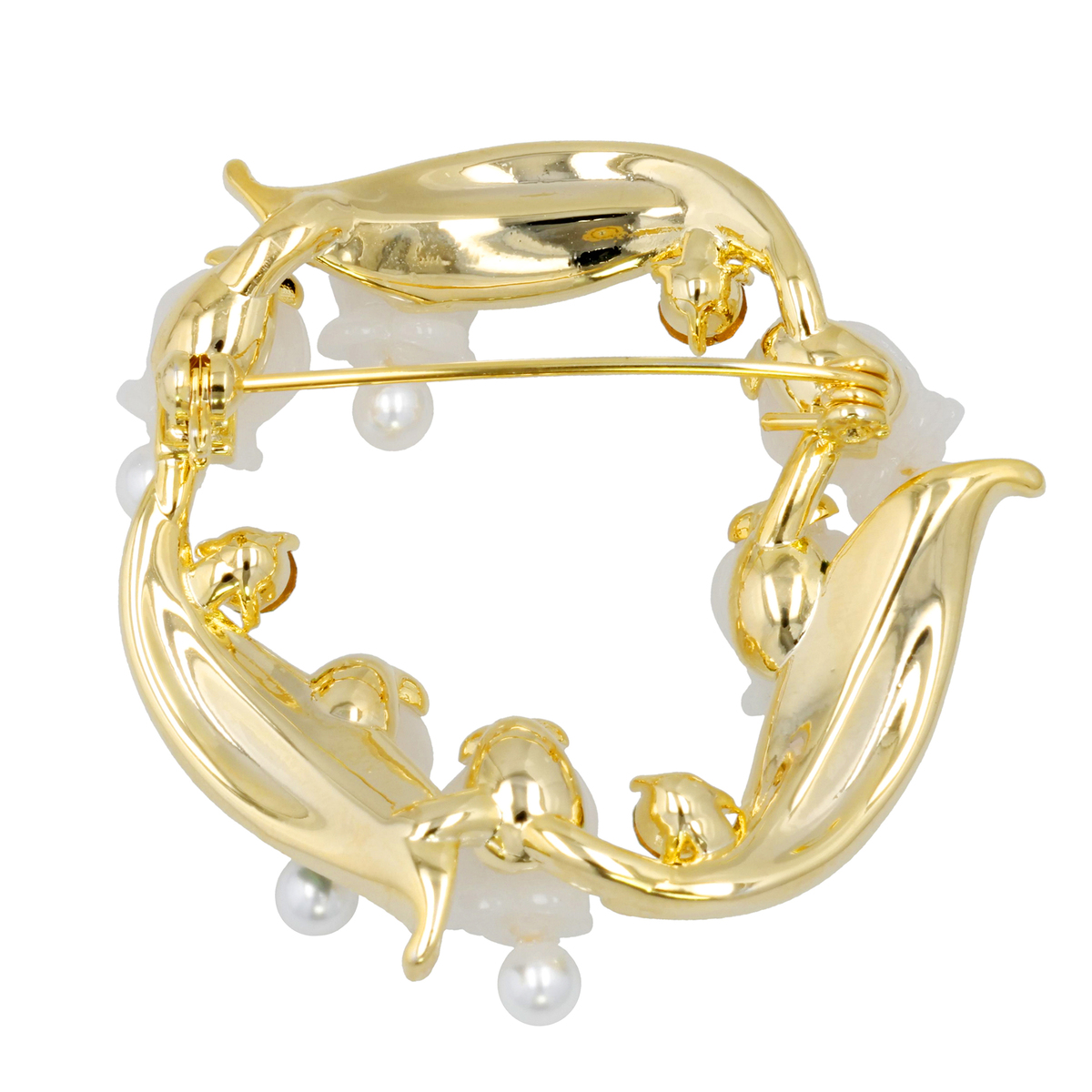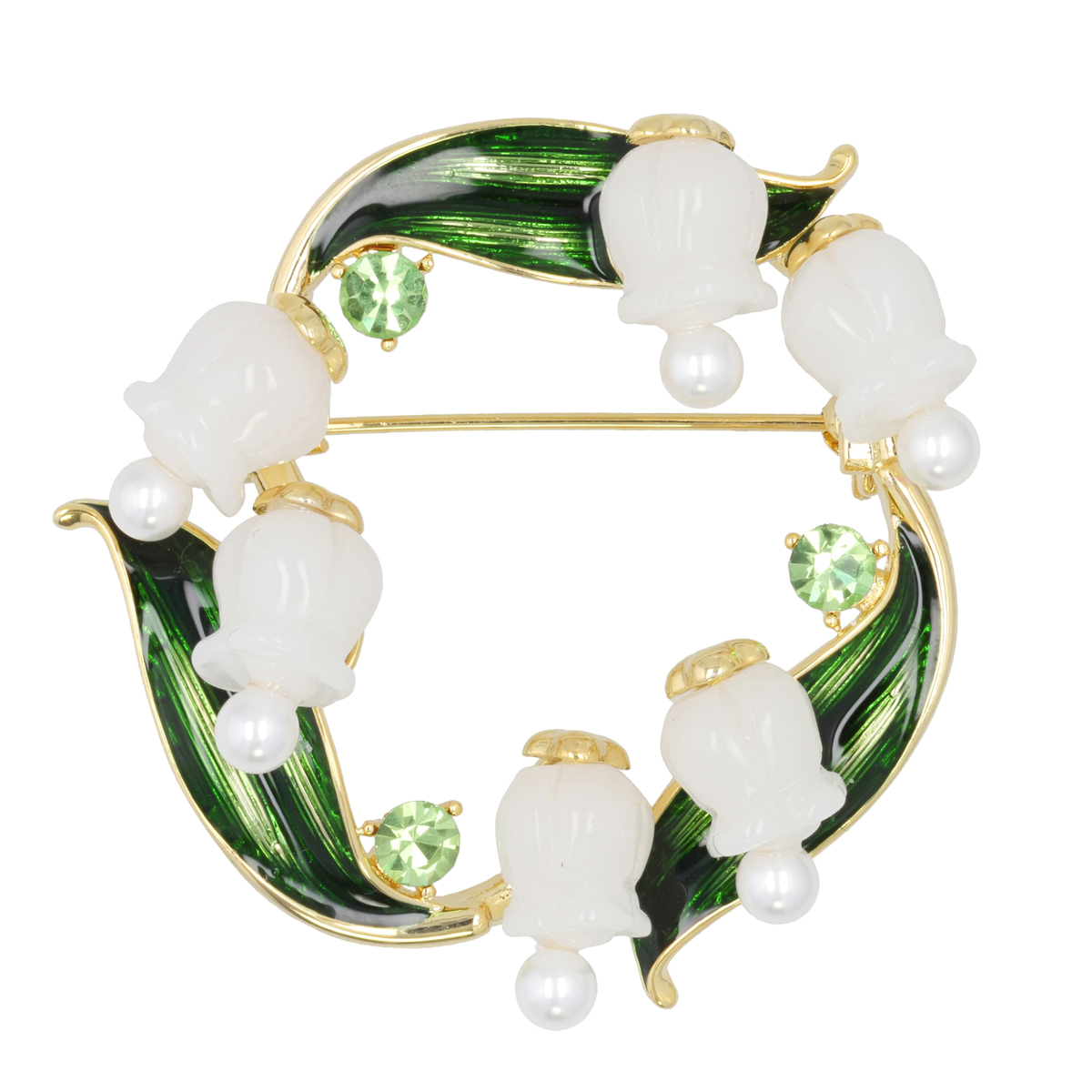 すずらんをモチーフにしたブローチ。ホワイトのお花とグリーンのリーフが美しく調和し、アート感とエレガンスを兼ね備えています