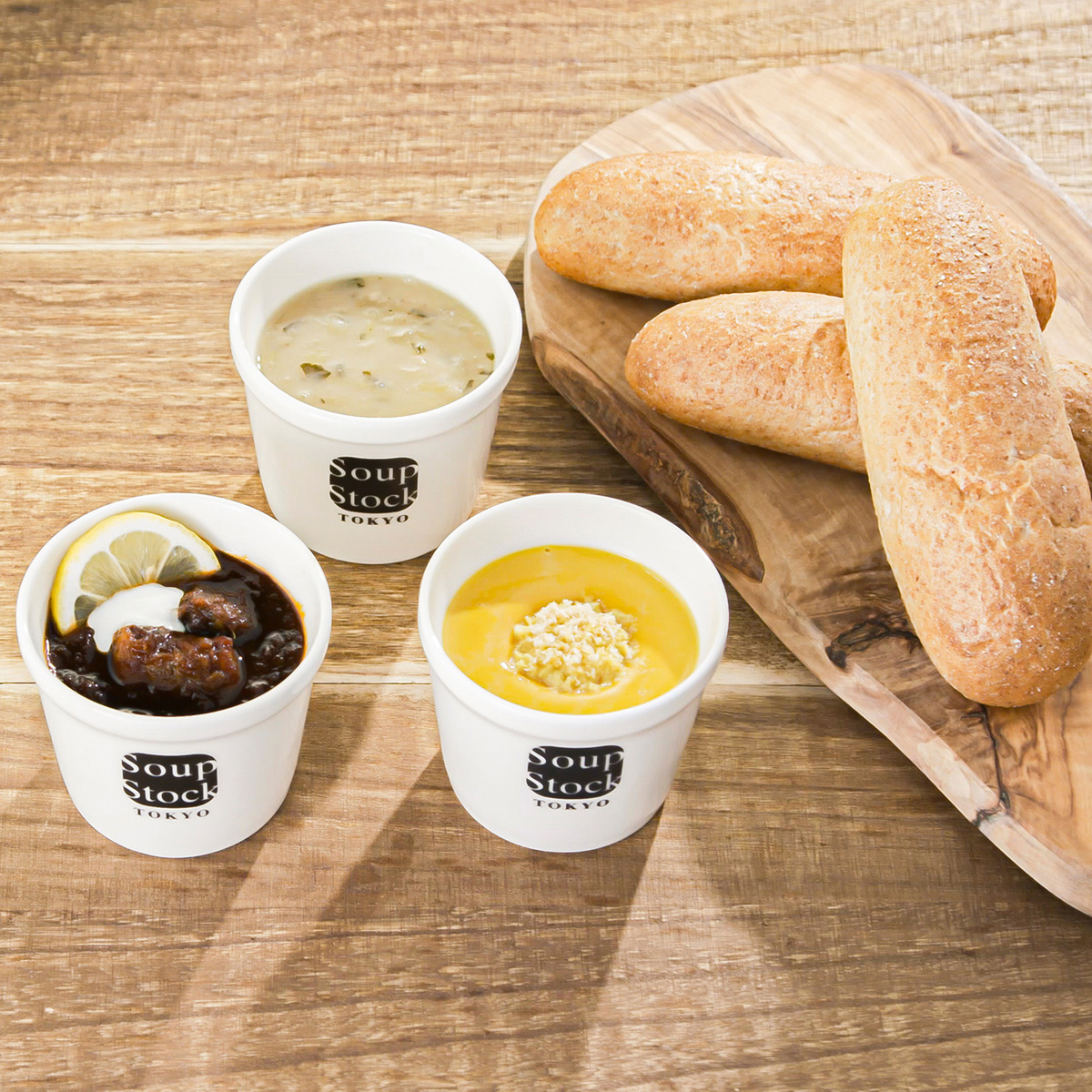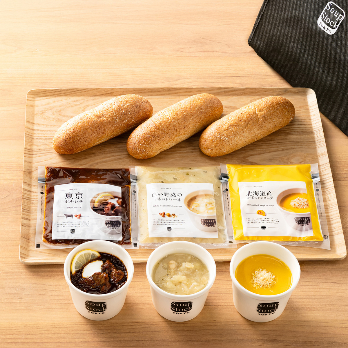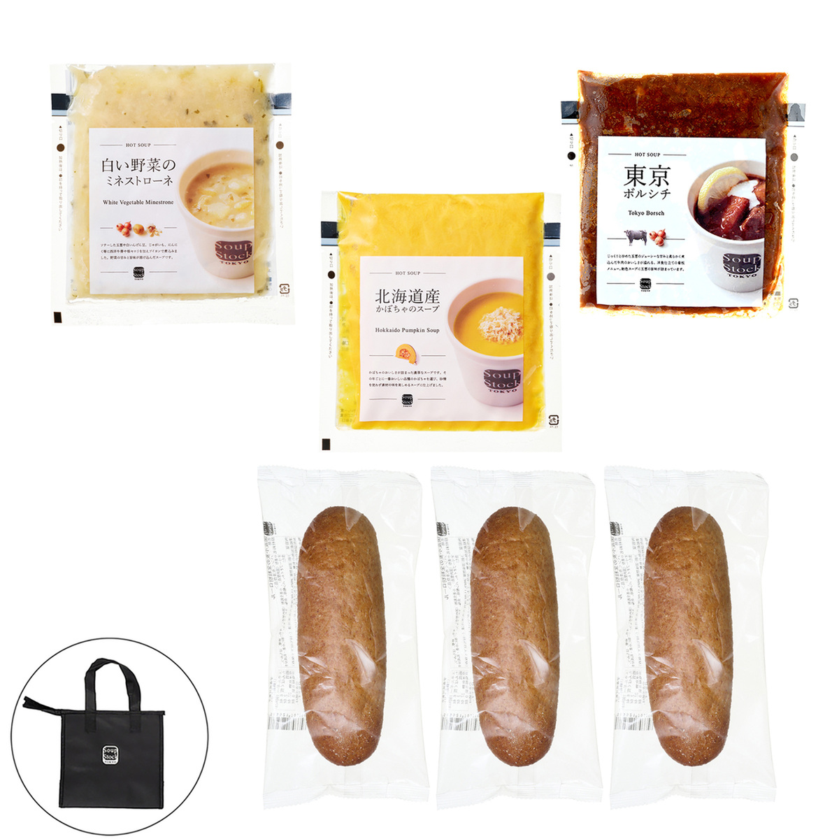 [アレルギー物質特定原材料8品目] 小麦、乳 <国産小麦の全粒粉ロール> ※はちみつを使用しておりますので1歳未満のお子さまには与えないでください。 [商品内容] ・東京ボルシチ ・北海道産かぼちゃのスープ ・白い野菜のミネストローネ 各180g ・国産小麦の全粒粉ロール×3個 ・保冷バッグ(プレゼント) [賞味期限] 出荷時点で賞味期限まで以下の日数がある商品をお届けします スープ:180日以上 全粒粉ロール:120日以上 [保存方法] 開封前:冷凍(ー18℃以下)で保存してください 開封後:開封後はすぐにお召し上がりください [お召し上がり方] <スープ> 電子レンジで温める場合: ・凍ったまま開封せずに蒸気吹出口を上にしてお皿にのせ、電子レンジに入れ、500w 4分30秒、600w 4分(北海道産かぼちゃのスープ:500w 4分、600w 3分30秒)を目安に加熱してください ・加熱中は、袋が膨らみますが、一定以上に膨らむと蒸気が吹き出し口から抜けてしぼみます ・加熱終了後はお皿に袋をのせたまま取り出し、蒸気吹き出し口を上にして、切り口部を開封してください 湯煎での加熱方法: ・凍ったまま開封をせずに袋ごと、沸騰したお湯の中で約5分間温めてください。鍋にフタはしないでください <全粒粉ロール> ・自然解凍でもお召し上がり頂けますが、30分〜90分自然解凍後、トースター等で2〜3分焼くとより美味しくお召し上がりいただけます ・お使いのトースター機種により時間は加減してください <オリジナル保冷バッグ> [サイズ(約)] 縦22.0×横23.0×マチ15.0cm ハンドル立ち上がり:15.0cm [重量(約)] 50g [素材] 不織布 [注意事項] <スープ> ※加熱しすぎると品質が劣化、分離する場合があります ※商品は冷凍室(ー18℃以下)で保存してください ※一度解凍したものを再凍結しないでください ※開封後はすぐにお召し上がりください ※開封時に袋のフチ手を切らないようにご注意ください <全粒粉ロール> ※はちみつを使用しておりますので1歳未満のお子さまには与えないでください ※解凍後は当日中にお召し上がりください [原料原産地] 東京ボルシチ:ソテー野菜〔野菜(玉葱、人参、セロリ、にんにく)、牛脂、菜種油〕(国内製造) 北海道産かぼちゃのスープ:牛乳(国内製造) 白い野菜のミネストローネ:玉葱(国産又は輸入) 全粒粉ロール:小麦粉(国内製造)、小麦全粒粉(国内製造) [原産国] 日本 オリジナル保冷バッグ:ベトナム製 [原材料] 東京ボルシチ:ソテー野菜〔野菜(玉葱、人参、セロリ、にんにく)、牛脂、菜種油〕(国内製造)、牛肉、トマトペースト、ビーフエキス、チキンブイヨン、食塩、醤油、香辛料 / カラメル色素、(一部に小麦・牛肉・大豆・鶏肉を含む) 北海道産かぼちゃのスープ:野菜(かぼちゃ、玉葱、人参)、牛乳(国内製造)、チキンブイヨン、クリーム、バター、食塩、香辛料、(一部に乳成分・鶏肉を含む) 白い野菜のミネストローネ:野菜(玉葱(国産又は輸入)、セロリ、じゃがいも、キャベツ、西洋ごぼう、にんにく、太葱)、根セロリピューレ、白いんげん豆、オリーブ油、チキンブイヨン、魚醤加工品(魚醤、昆布エキス、食塩、酵母エキス)、澱粉、食塩、香辛料、(一部に鶏肉を含む) 国産小麦の全粒粉ロール:小麦粉(国内製造)、小麦全粒粉(国内製造)、牛乳、砂糖、はちみつ、オリーブオイル、パン酵母、食塩、モルトエキス、(一部に小麦・乳成分を含む)