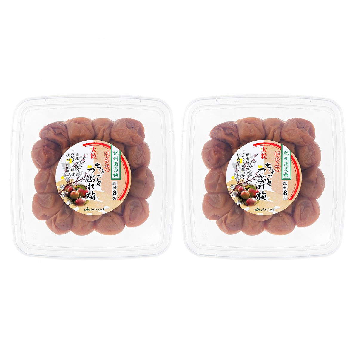 はちみつを使ってしっかりと味付けしながらも、塩分は、紀州南高梅大粒つぶれ梅[ハチミツ]約8%に比べて約60%減塩。100gあたり約3%に仕上げました(*2)。M・Lサイズの食べやすい大きさの梅干しを使用しています