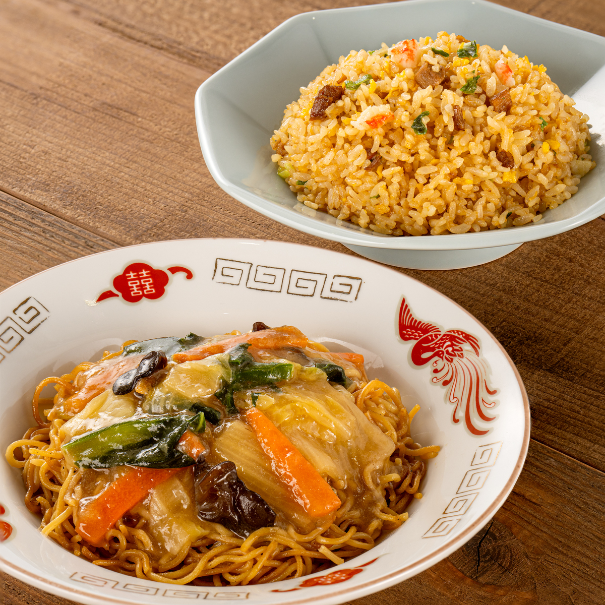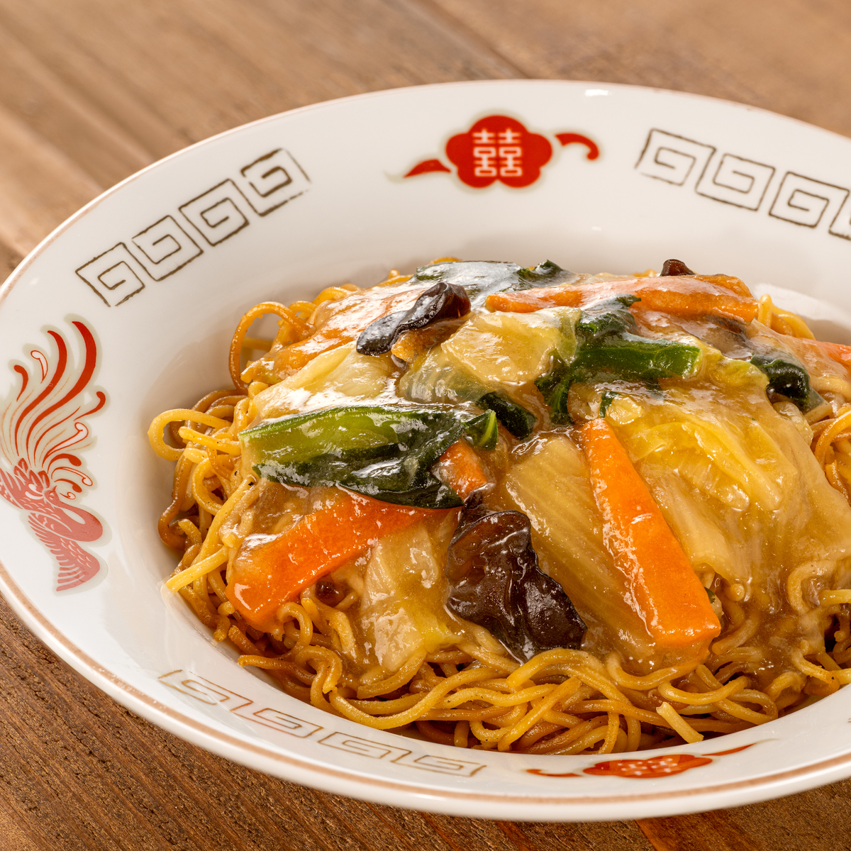 ホタテエキスとオイスターソースを使用。かた焼きそばはしょうゆとごま油が香るこだわりのパリッと食感に仕上げています。プレート内であんと麺で段が分かれているので、それぞれの食感を損なうことなく食べられます