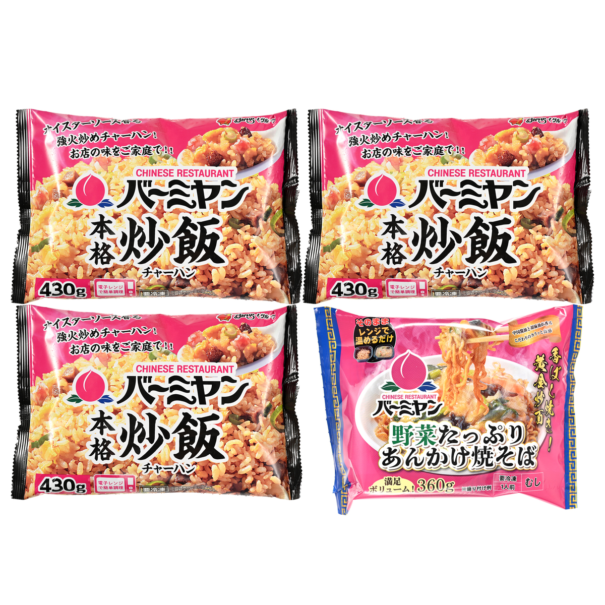 [アレルギー物質特定原材料8品目] 卵、小麦、乳 [セット内容] ・バーミヤン本格炒飯430g×3 ・バーミヤン 野菜たっぷりあんかけ焼きそば360g(めん150g) [賞味期限] 出荷時点で賞味期限まで120日以上ある商品をお届けします [保存方法] 開封前:‐18℃以下で保存してください 開封後:お早めにお召し上がりください [お召し上がり方] <炒飯> 加熱して召し上がってください 電子レンジの場合: 1 凍ったままの商品を皿に平らに盛ります 2 ラップをかけず温めてください 調理時間(機種により多少異なります) 1/2袋(215g) 500W 4分/600W 3分30秒 1袋(430g) 500W 8分/600W 6分50秒 フライパンの場合: 1 温めたフライパンに油をひかず、凍ったままの商品を入れます 2 中火で炒めてください 1/2袋(215g) 3〜4分/1袋(430g) 5〜6分 <焼きそば> 電子レンジ専用 1 凍ったままの商品を、外袋から取り出します 2 ラップをしたまま温めます(トレーごと調理可) 3 具材をトレーから麺にかけて出来上がりです 加熱時間の目安:500W 7分50秒600W 6分30秒 ※冷たい場合は10秒ずつ追加熱してください ※加熱ムラを防ぐために500Wまたは600Wでの調理をおすすめします ※調理時間は機種により多少異なります ※温めすぎは調理不良の原因になります [原料原産地] 炒飯:米(国産) あんかけ焼きそば:めん〔小麦粉(国内製造)〕 [原産国] 日本 [注意事項] <炒飯> ※冷凍庫(-18℃以下)で保存 ※いったん解けたものを再び凍らせると品質が変わることがあります。 ※袋ごとレンジ不可(アルミ使用のため) ※やけど注意 ※オート(自動)不可 ※米や卵などの焦げがみられることがあります ※調理前は油脂が白く固まっていることがあります ※開封後はお早めに召しあがりください ※捨てる時は自治体の区分に従ってください 電子レンジ ※この袋はアルミ使用のため袋ごとレンジで加熱すると発火の恐れがあります ※加熱ムラを防ぐために500Wまたは600Wでの調理をおすすめします ※冷たい場合は30秒間ずつ追加熱してください ・温めすぎは調理不良の原因になります フライパン ※鉄のフライパンをご使用の場合は、少量の油(小さじ1杯)をひいてください ※加熱しすぎは調理不良の原因になります <焼きそば> ※本品製造工場ではそば・卵を含む製品を製造しています ※一度解けたものを再び凍らせますと、品質上問題がありますのでおやめください ※ごみに出すときは、自治体の定める区分にしたがってください。 ※加熱直後は大変熱くなっておりますので、やけどには十分にご注意ください。 ※取り出す時、トレーの両端を持ち十分気を付けてください。 ※保管の仕方により、麺の一部が乾燥して白くなり、食感が変わることがあります [原材料] バーミヤン本格炒飯430g: 米(国産)、液卵、焼豚、かに風味かまぼこ、みりん、ねぎ、ショートニング、食塩、しょうゆ、還元水あめ、ウスターソース、でん粉、ほたて貝エキス、オイスターソース、しょうがペースト、中華調味料、香辛料、ぶどう糖、いため油(なたね油、こめ油)/調味料(アミノ酸等)、加工でん粉、着色料(カラメル、紅麹、カロチノイド)、甘味料(カンゾウ、ステビア)、酸味料、貝Ca、(一部に小麦・卵・乳成分・ごま・大豆・鶏肉・豚肉を含む) バーミヤン野菜たっぷりあんかけ焼きそば360g: あん〔醤油ラーメンスープ、植物油脂、酒、オイスターソース、砂糖、ガラスープ、ホタテエキス/増粘剤(加工デンプン)、調味料(アミノ酸等)、カラメル色素〕、めん〔小麦粉(国内製造)、植物油脂、醤油、食塩/かんすい、調味料(アミノ酸等)、焼成カルシウム、着色料(クチナシ)〕、具〔野菜(白菜、ニンジン、小松菜)、木耳、植物油脂〕、(一部に小麦・大豆・鶏肉・ごまを含む)