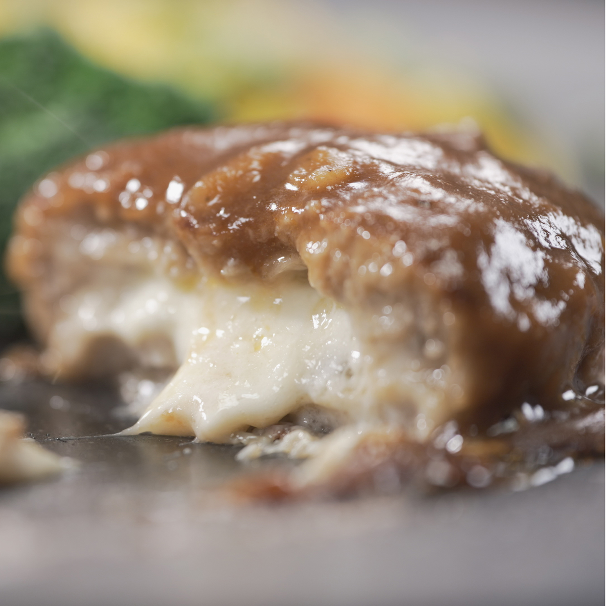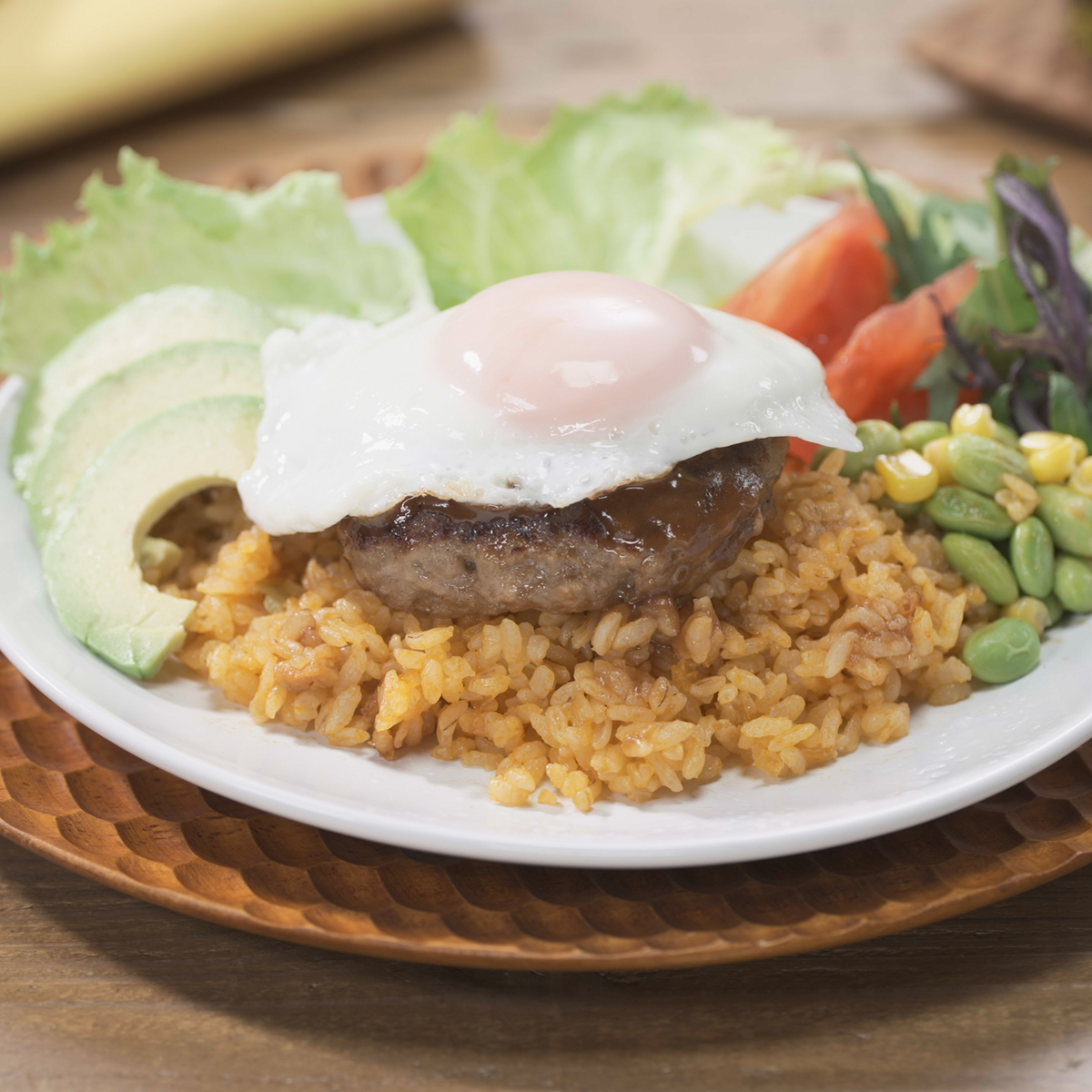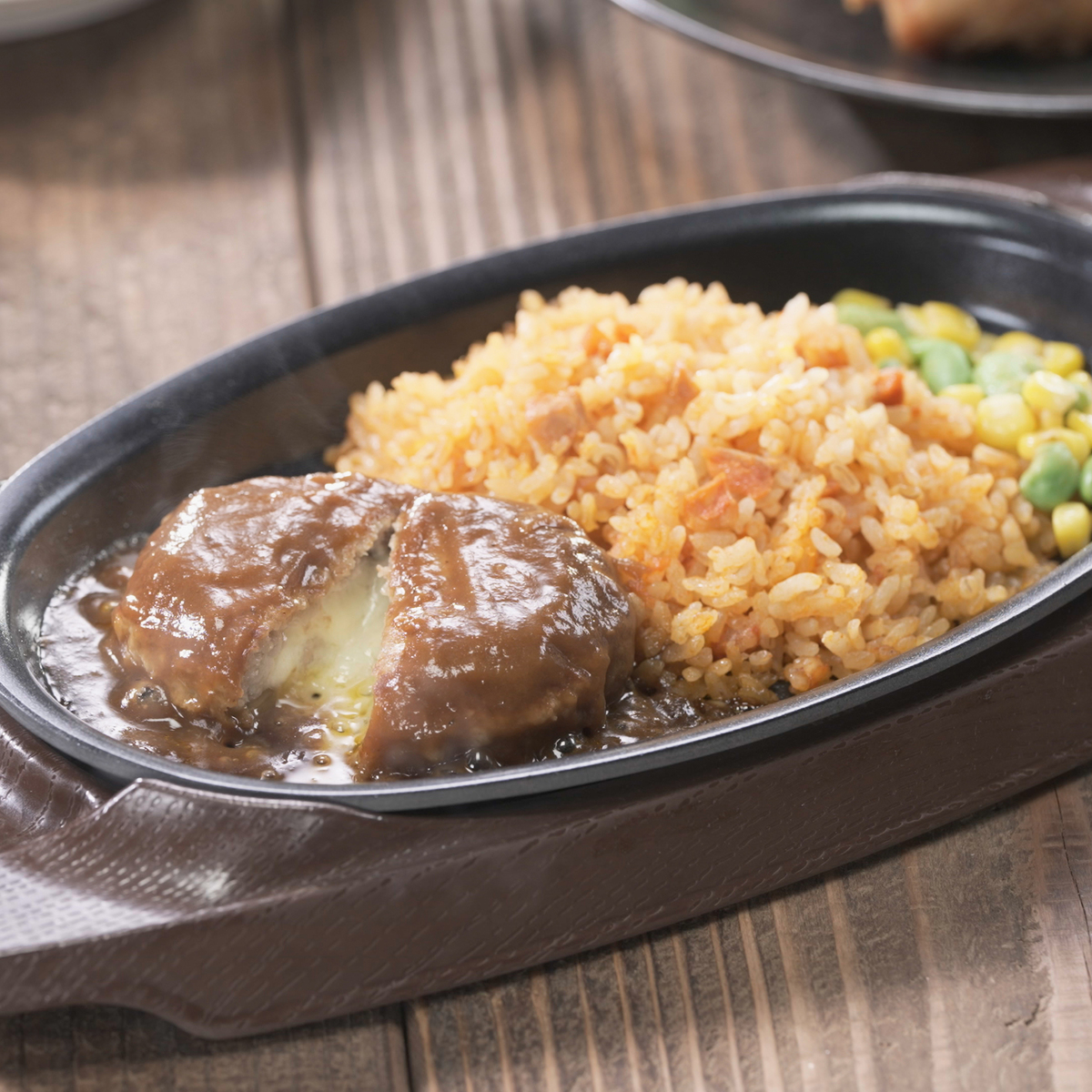 チーズinハンバーグとチキンライスを組合せたワンプレート。国内の工場で生産しています