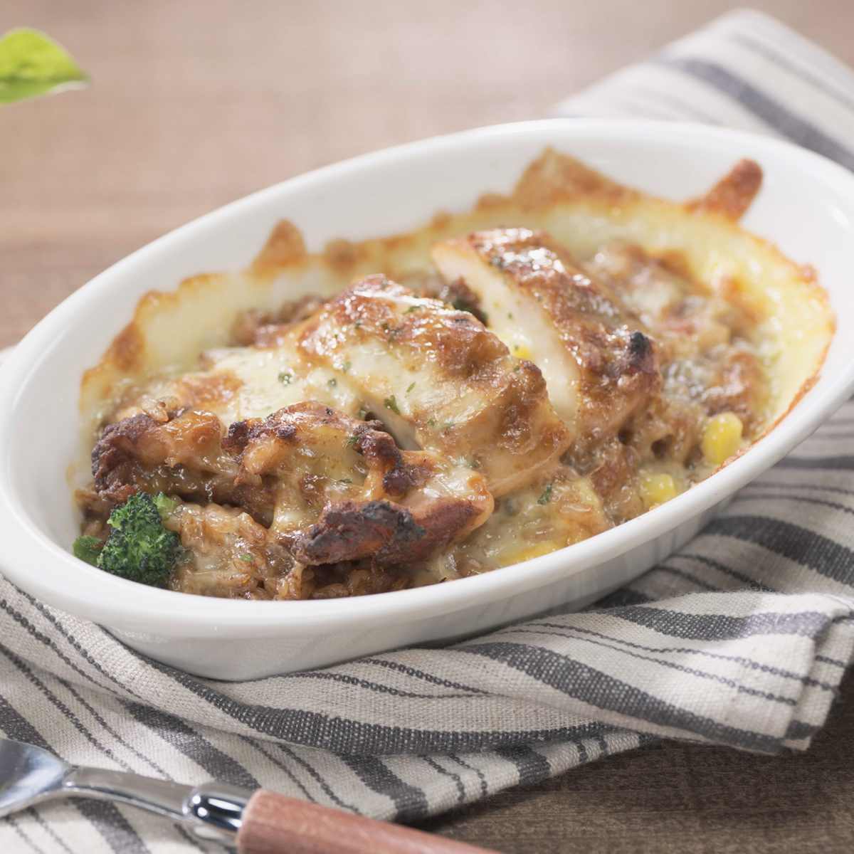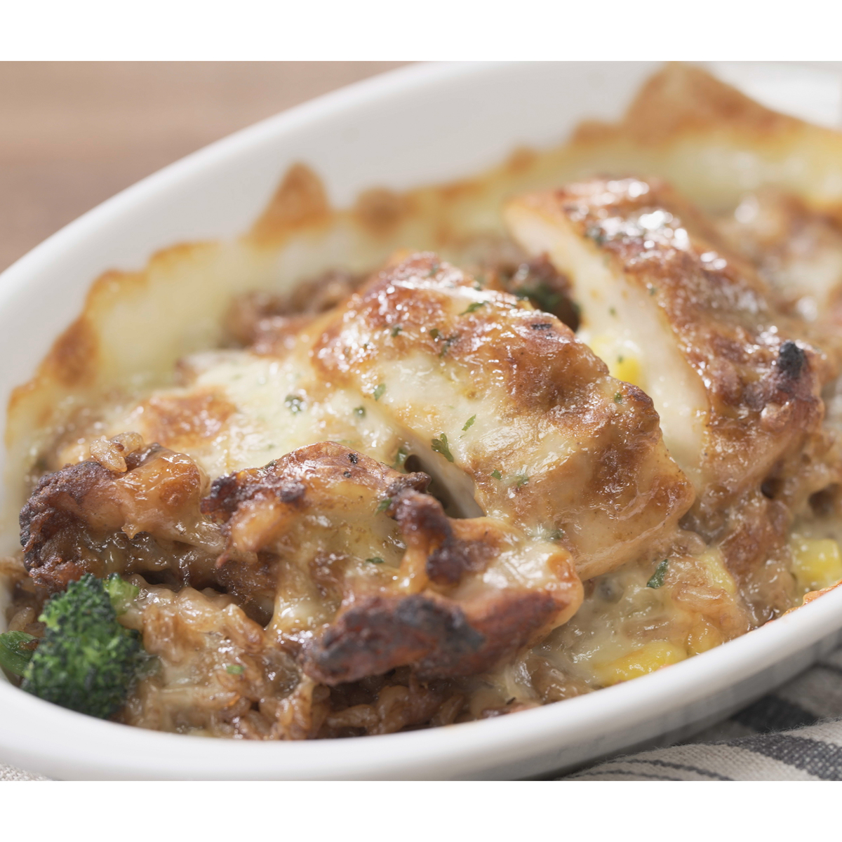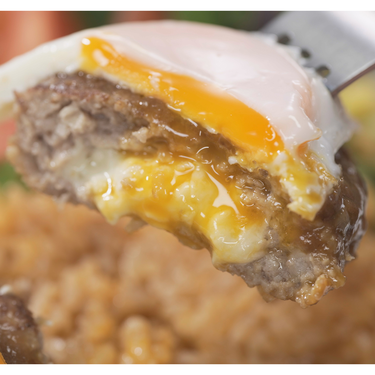 チーズinハンバーグとチキンライスを組合せたワンプレート。国内の工場で生産しています