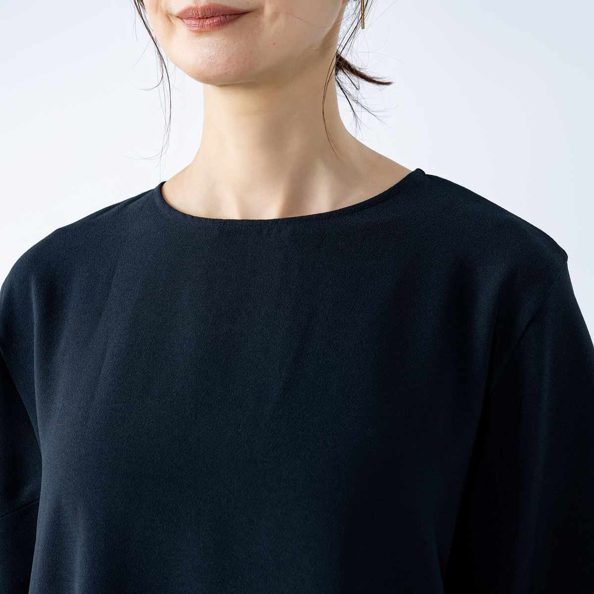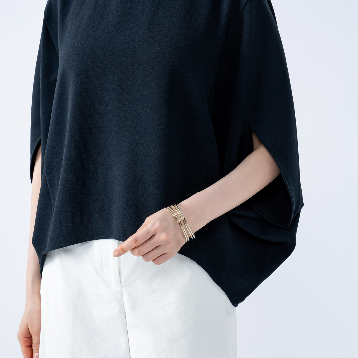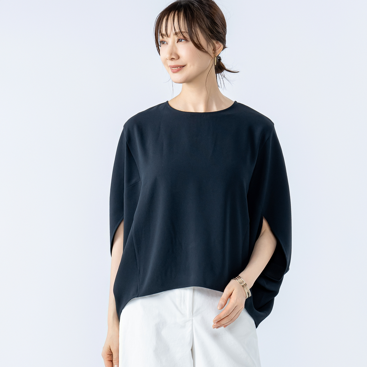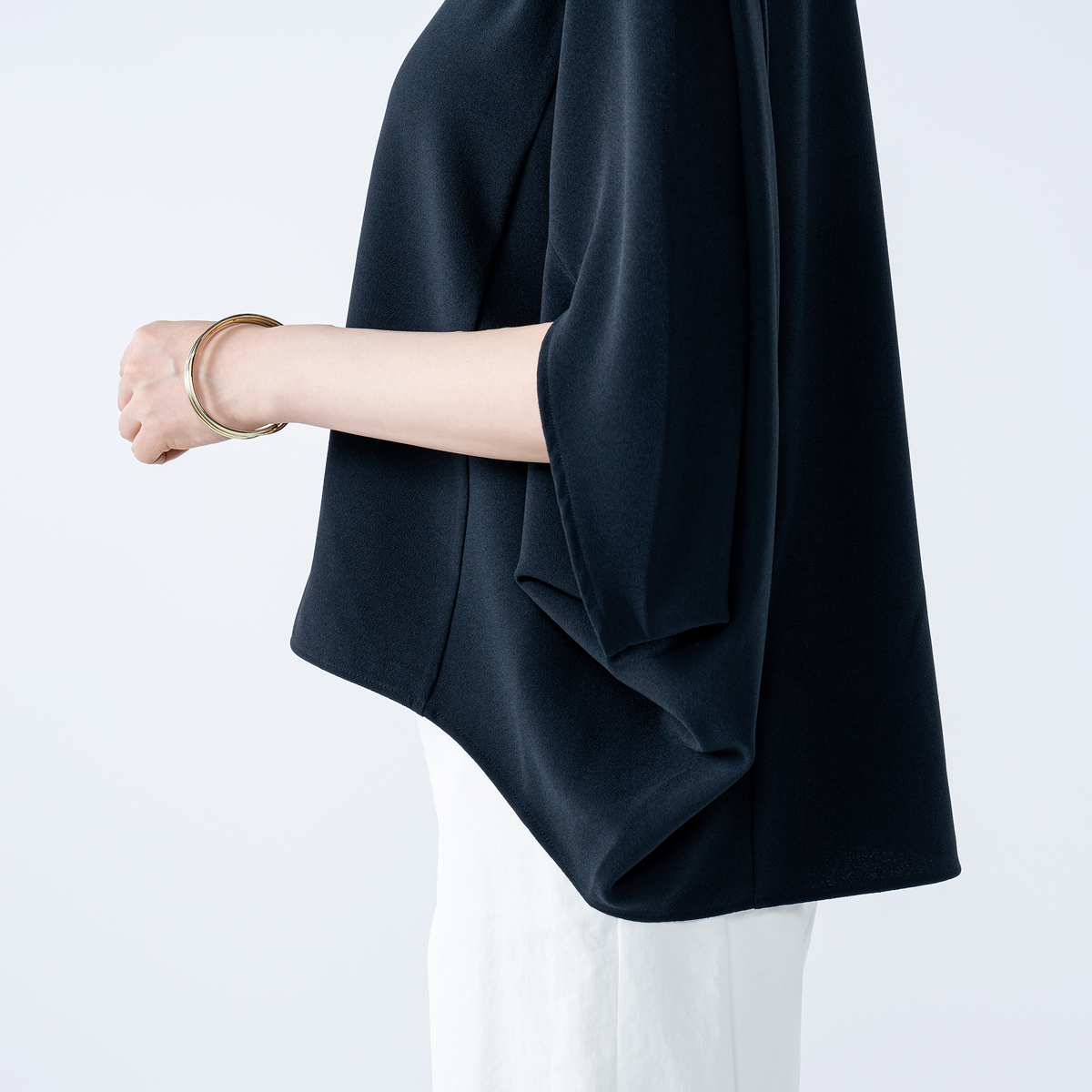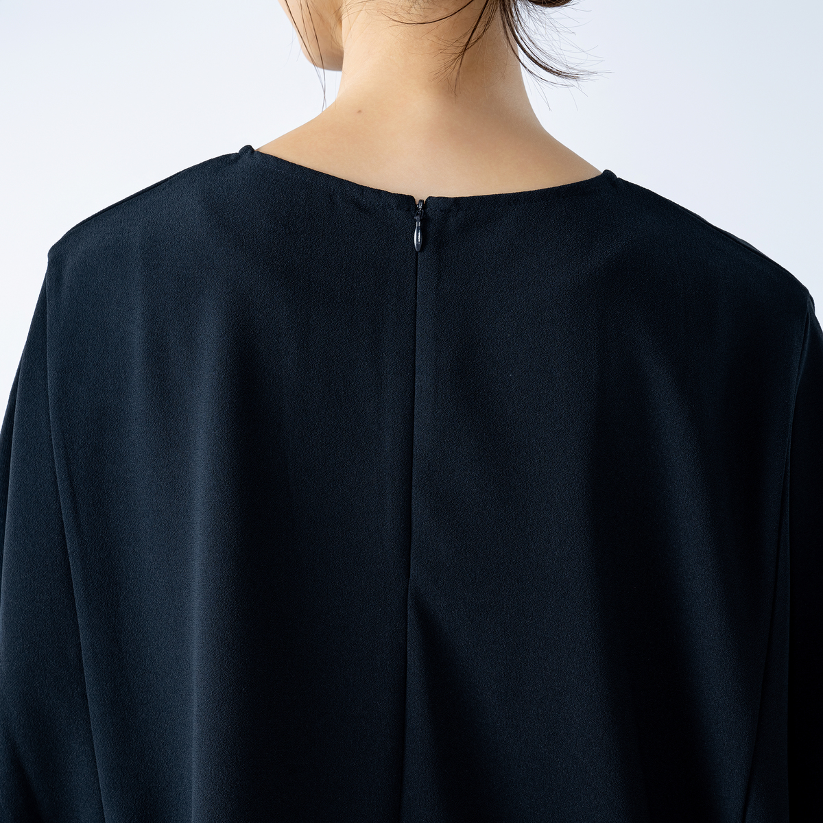 たっぷりと生地を使うことで、脇下にエレガントなドレープを生み出し、袖口のスリット風デザインが腕周りをすっきりと見せてくれます。後ろはファスナー仕様で着脱が簡単です