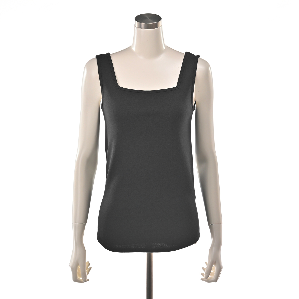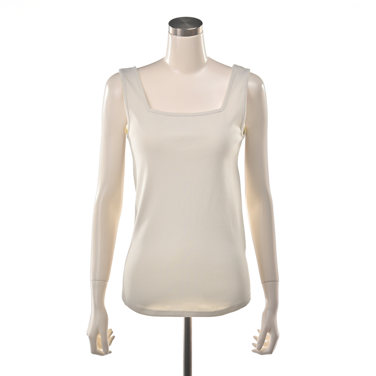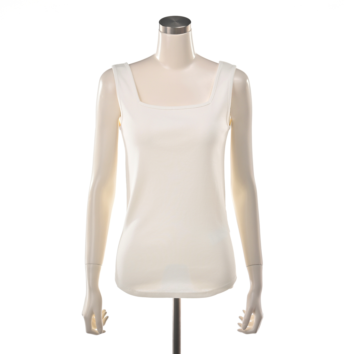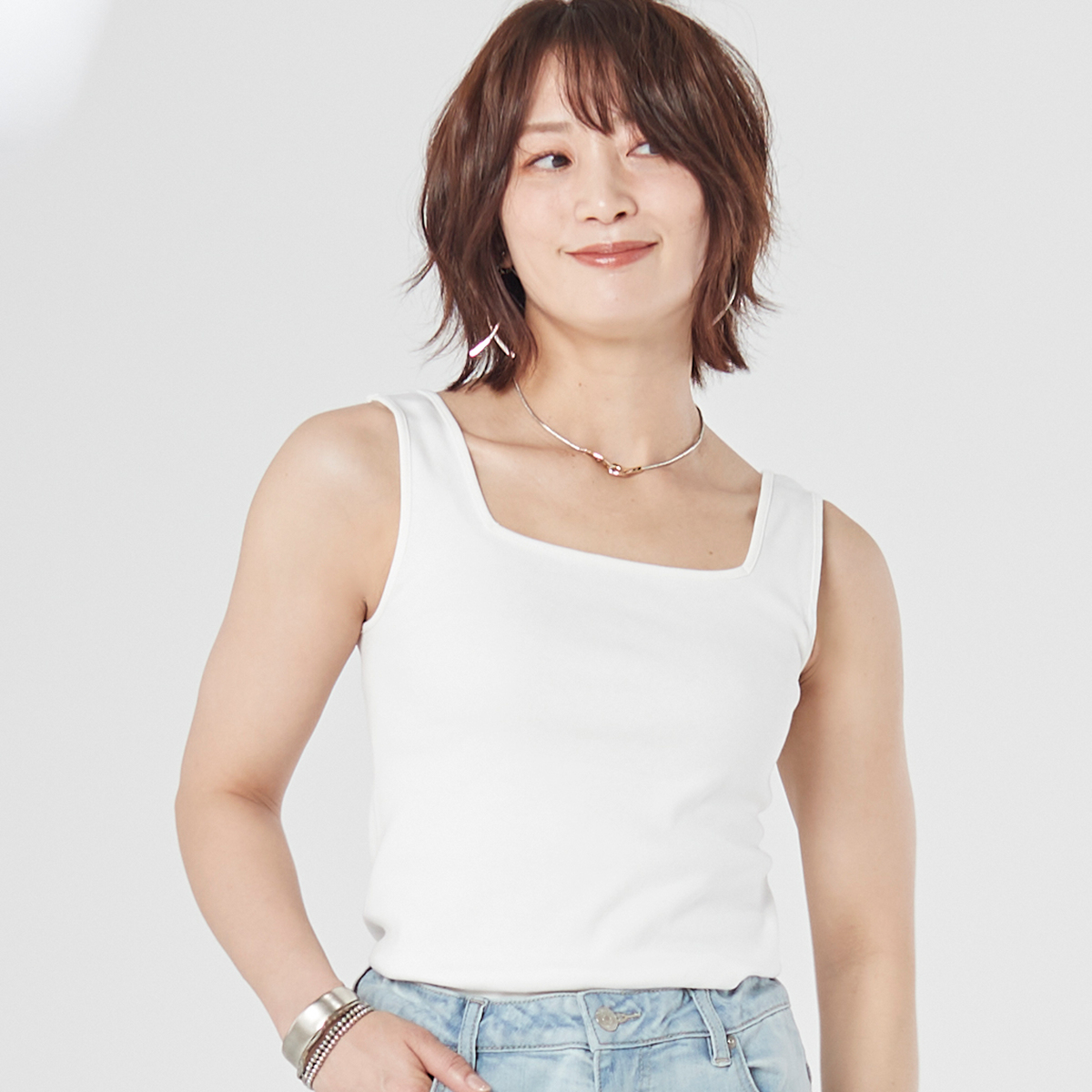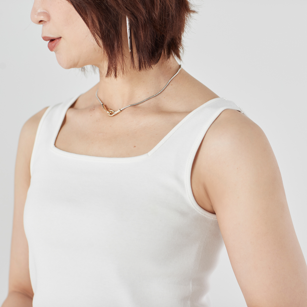 レイヤードスタイルに活躍してくれるスクエアネックのタンクトップ。胸元や肩から下着が見えにくく、デコルテをきれいに見せてくれる直線的なカッティングがポイントです