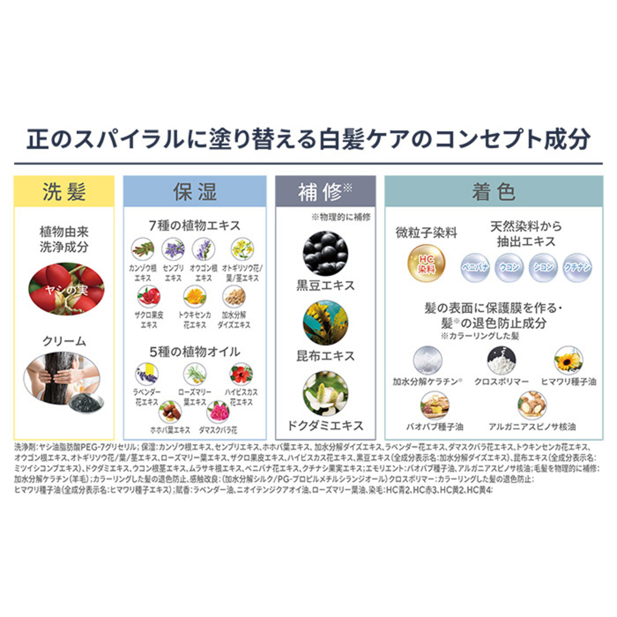 1本で4つの機能(洗髪・補修・保湿・着色*1)。気になる白髪がケアできる、オールインワンタイプのシャンプーです。クリームタイプのシャンプーでやさしく洗い上げます