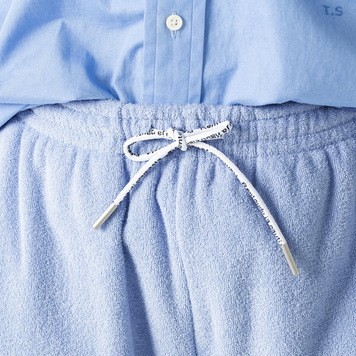 コットン素材をベースに両面パイル加工を施した生地を使用。肌あたりが柔らかく、汗をしっかり吸収します。毛足を短めに仕上げることで軽やかな着心地です