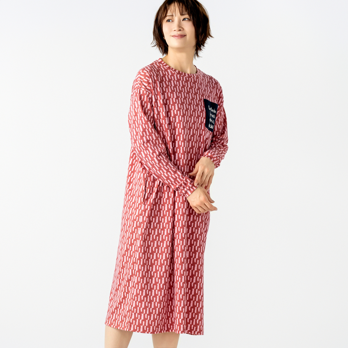 長袖のカットソー素材で端境期に使いやすく、ドロップショルダーとゆとりのあるアームホールにより身体のラインを拾いにくいデザイン。すとんと落ちるシルエットで着こなしやすく、自宅で洗えるため(洗濯ネット使用)、日常づかいに便利です